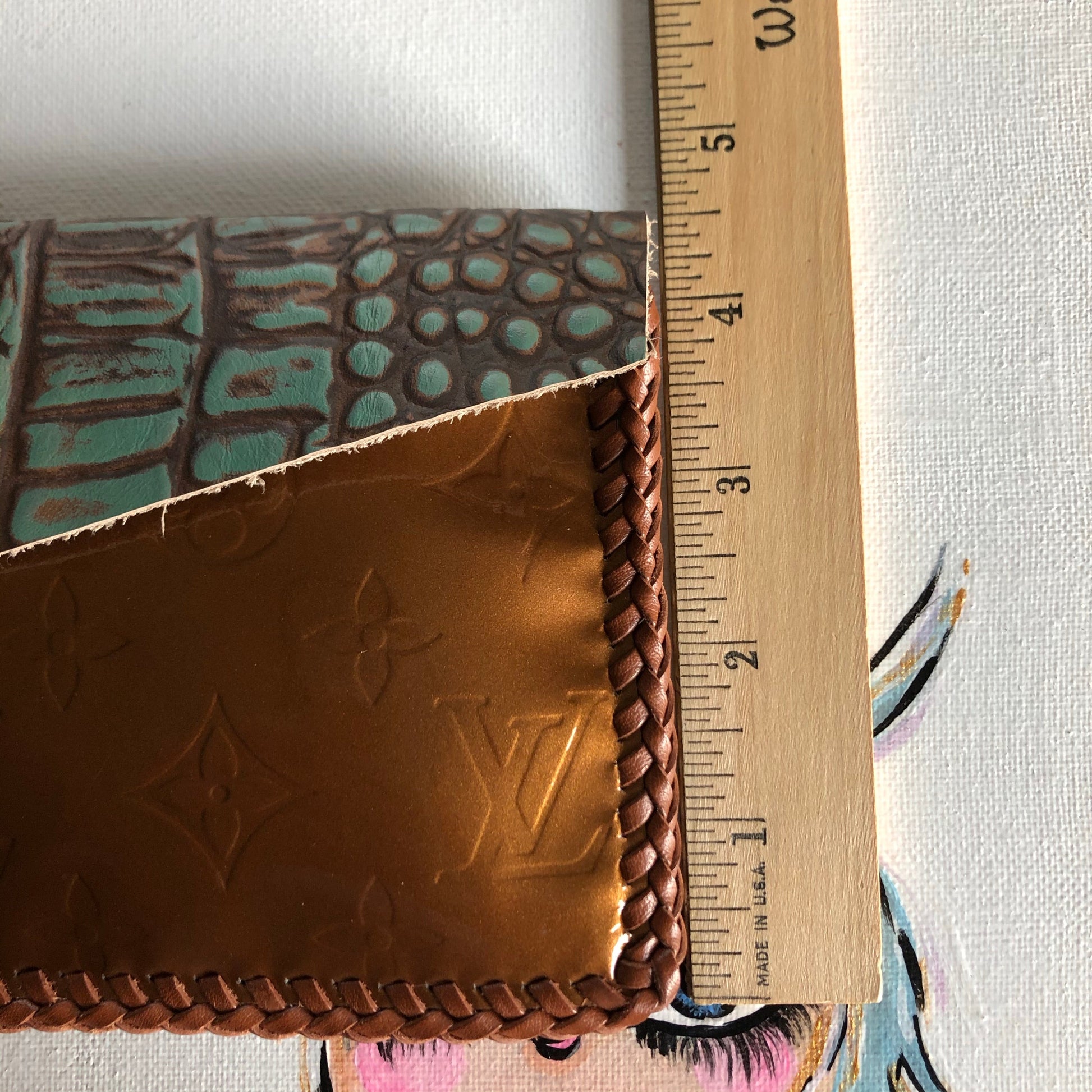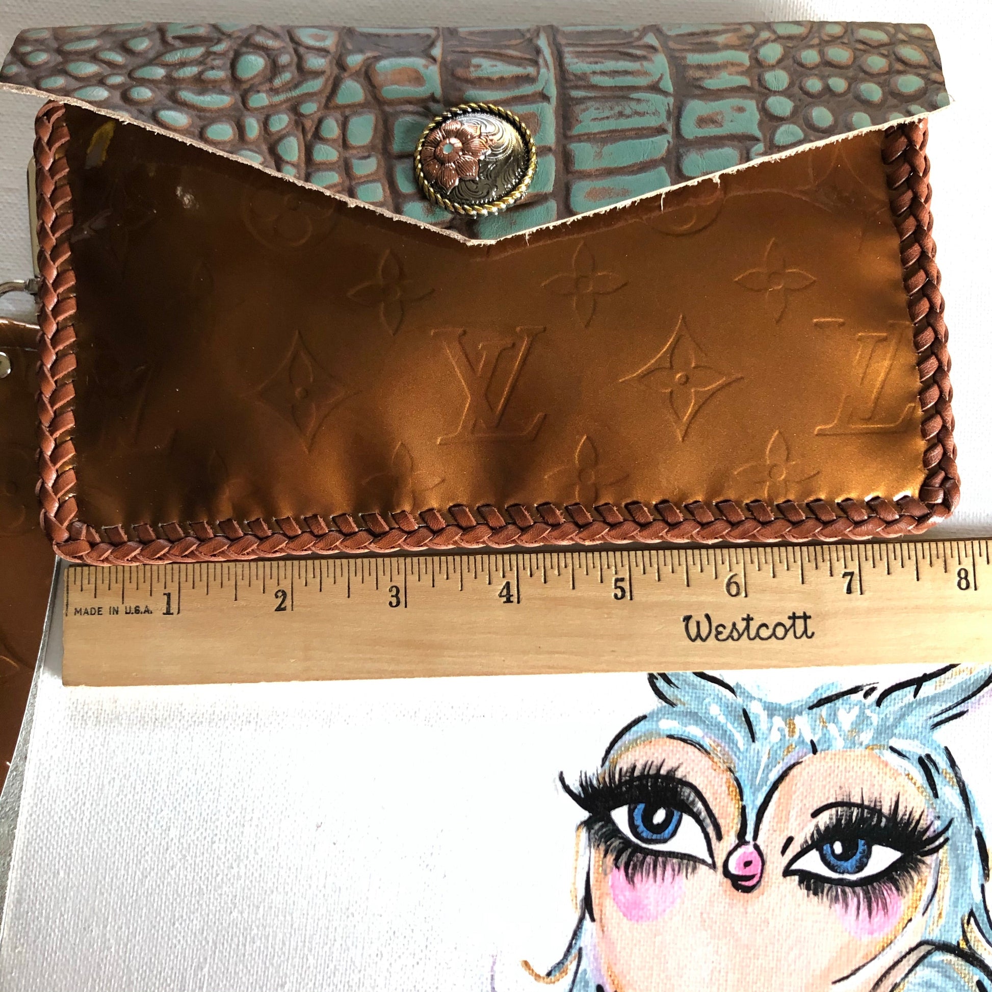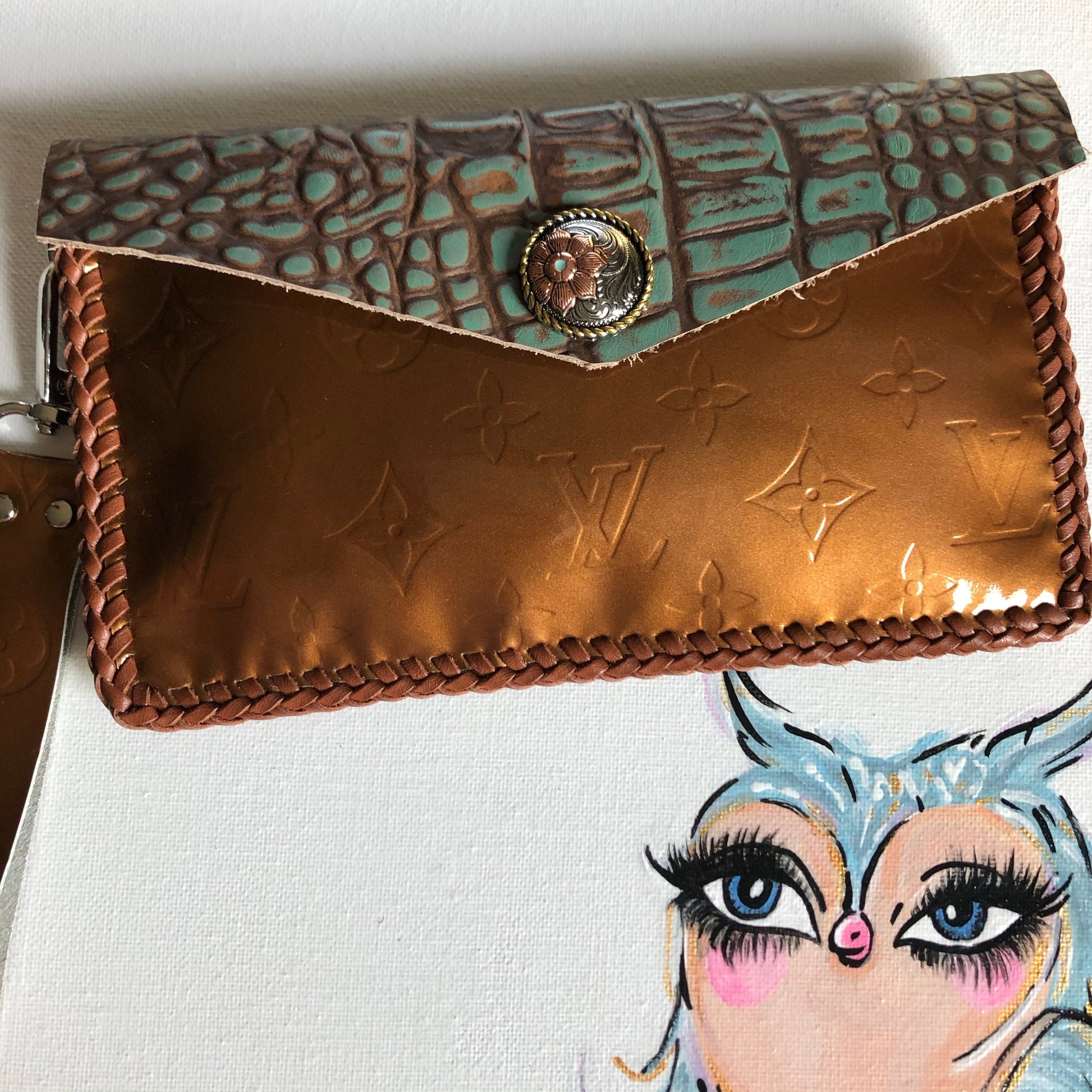 An Prestige Totes Bronze Vernis Louis Vuitton bag was used along with a piece of turquoise and brown croc-embossed piece of leather. The outside edge is caramel colored lace which has been stitched by hand. There is a silver D-ring stitched into the side. This can be used to easily click the wristlet to, or remove the wristlet and have a beautiful clutch! The silver click-n-go is easy to remove, and even easier to add your keys to! APrestige Totes silver snap completes this look.