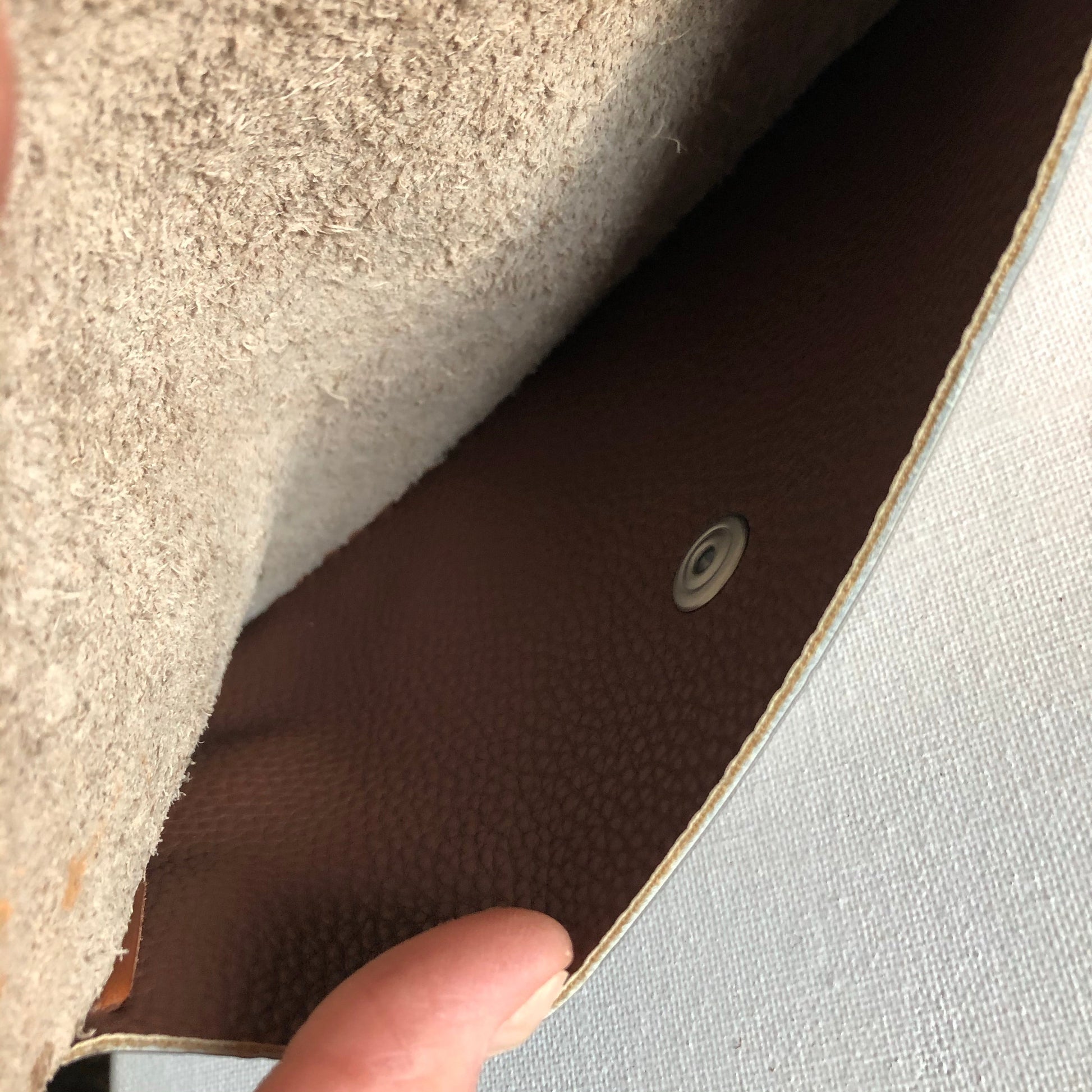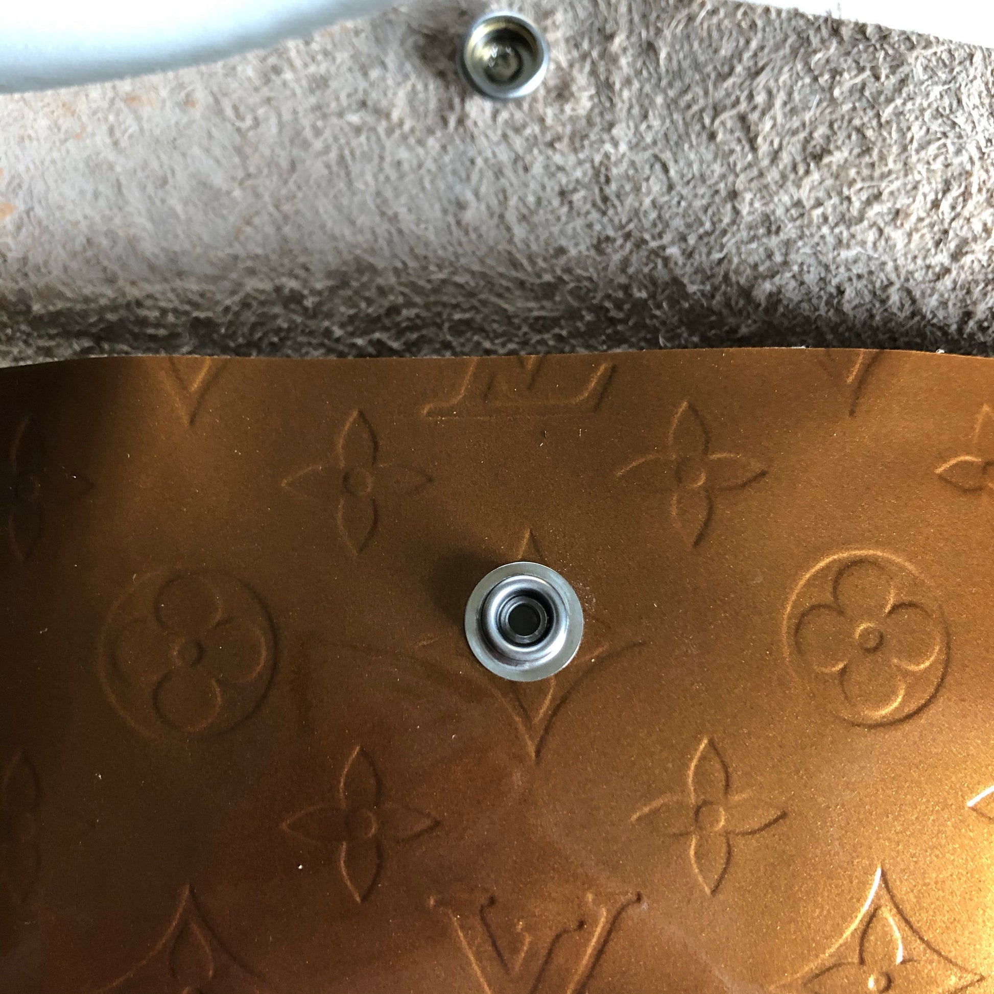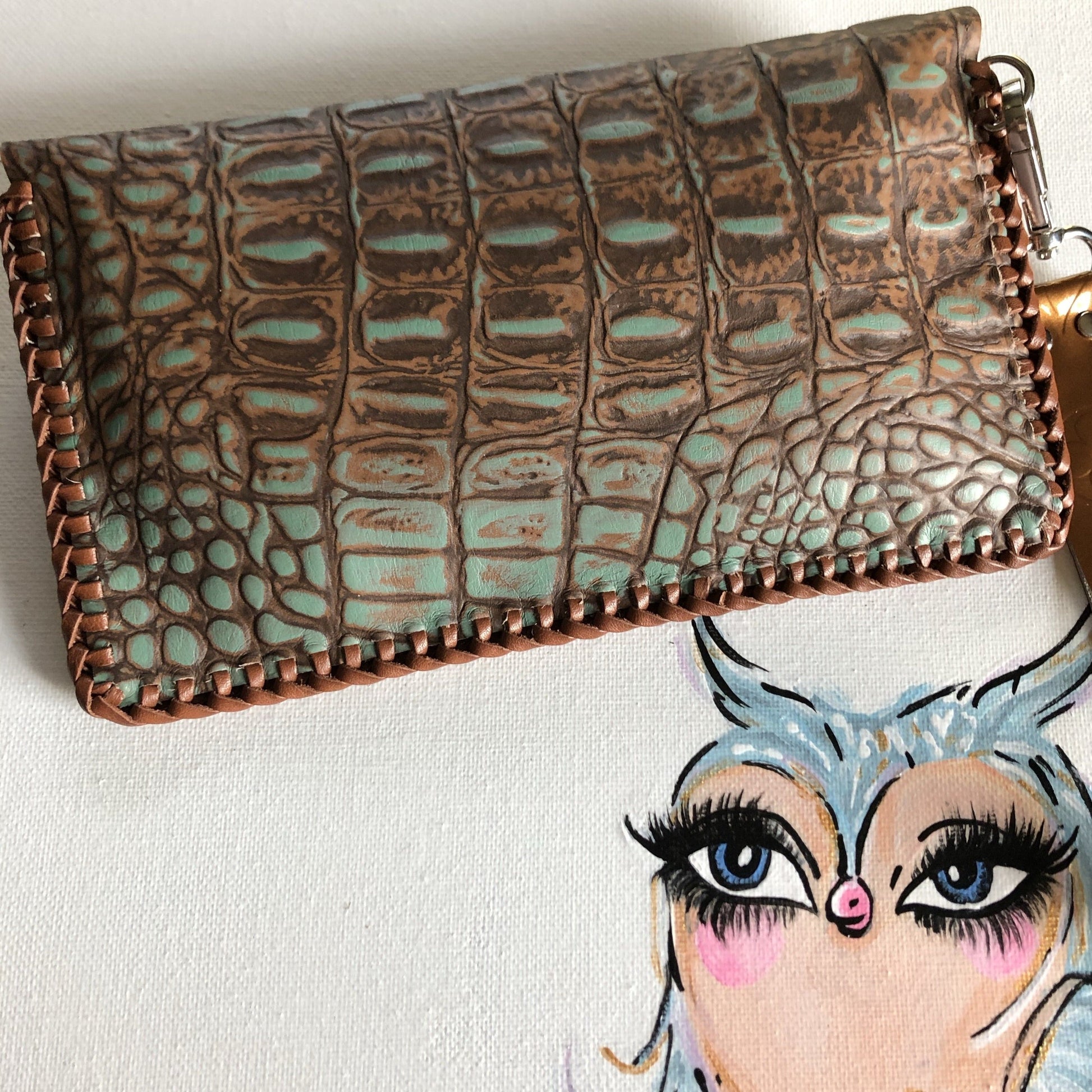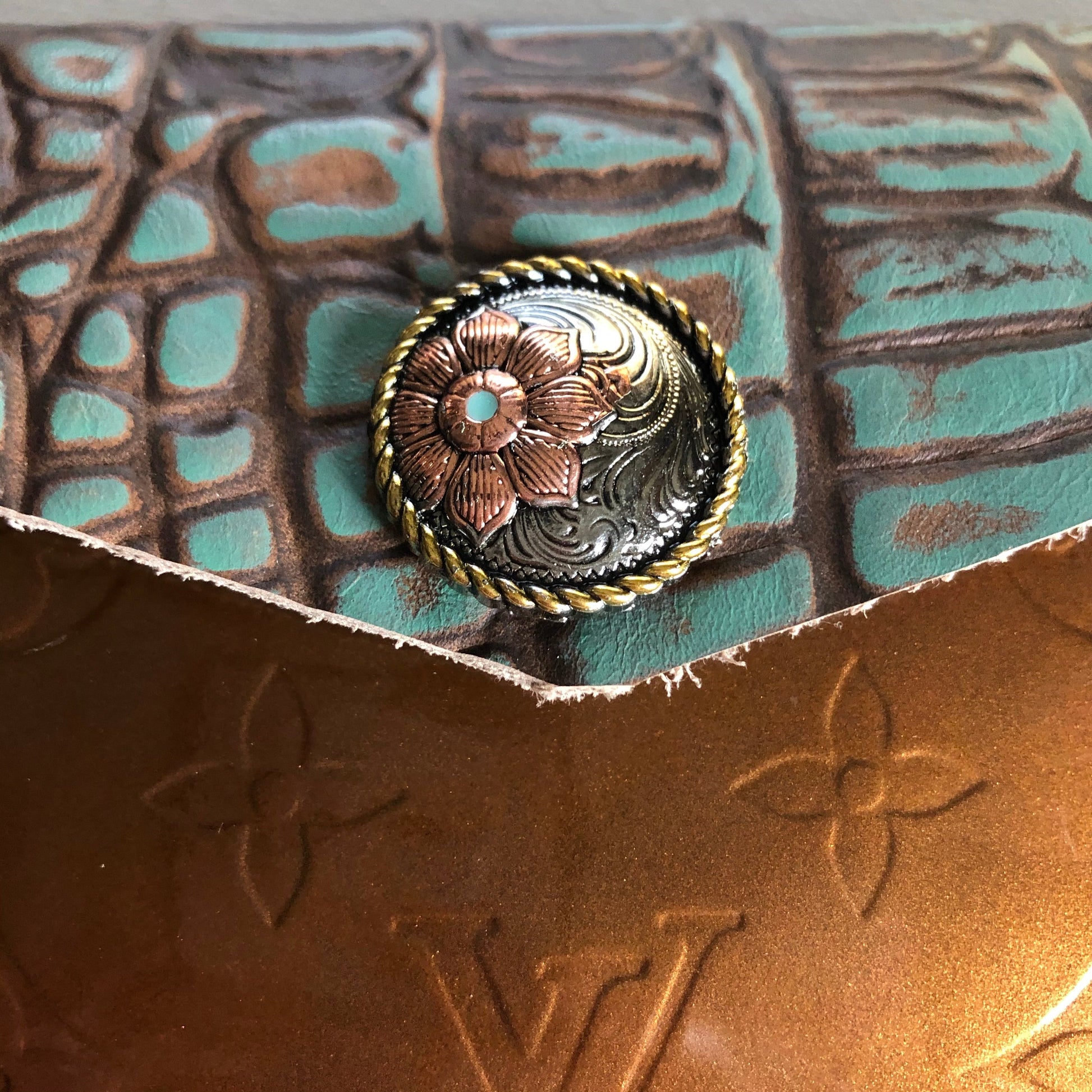An Prestige Totes Bronze Vernis Louis Vuitton bag was used along with a piece of turquoise and brown croc-embossed piece of leather. The outside edge is caramel colored lace which has been stitched by hand. There is a silver D-ring stitched into the side. This can be used to easily click the wristlet to, or remove the wristlet and have a beautiful clutch! The silver click-n-go is easy to remove, and even easier to add your keys to! APrestige Totes silver snap completes this look.