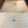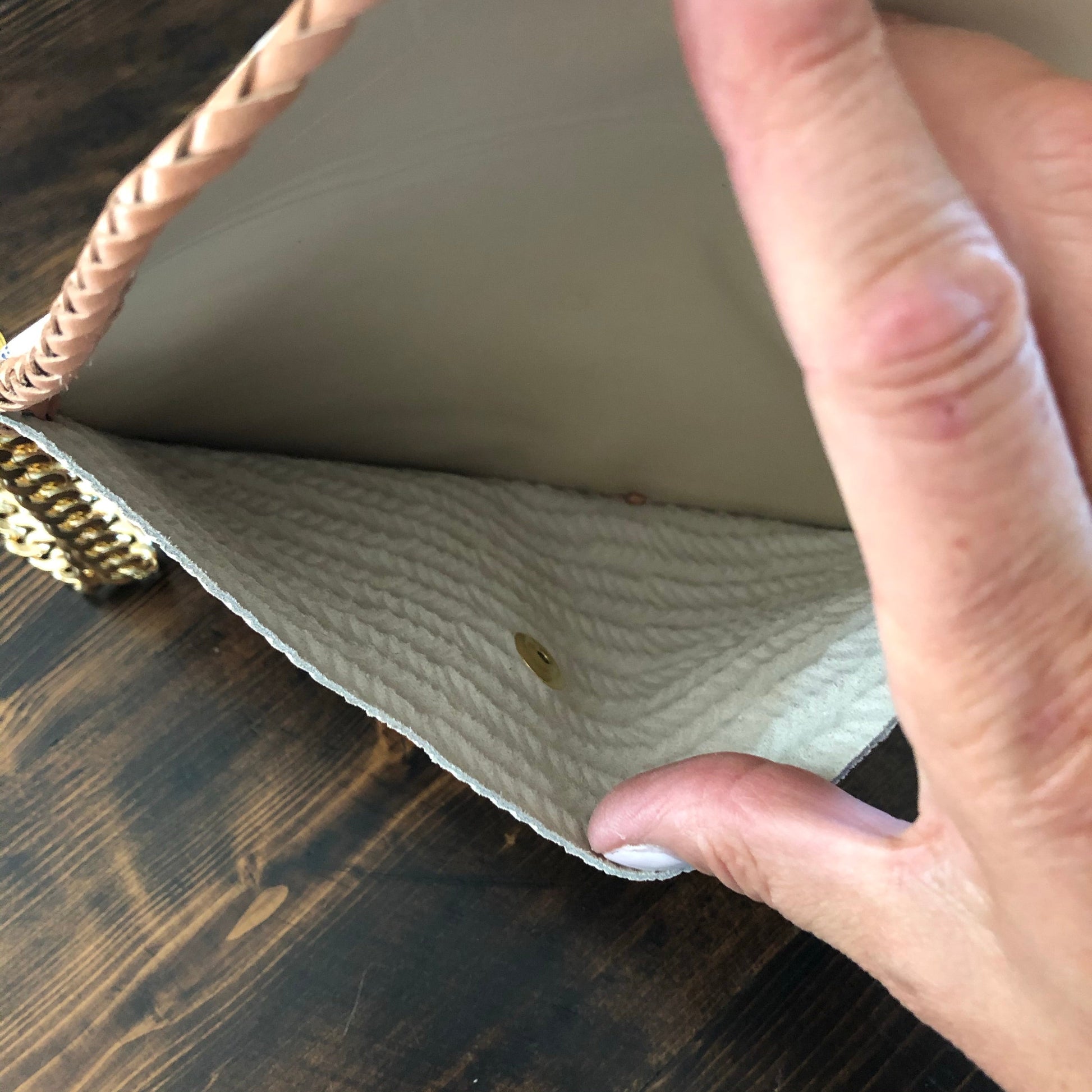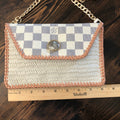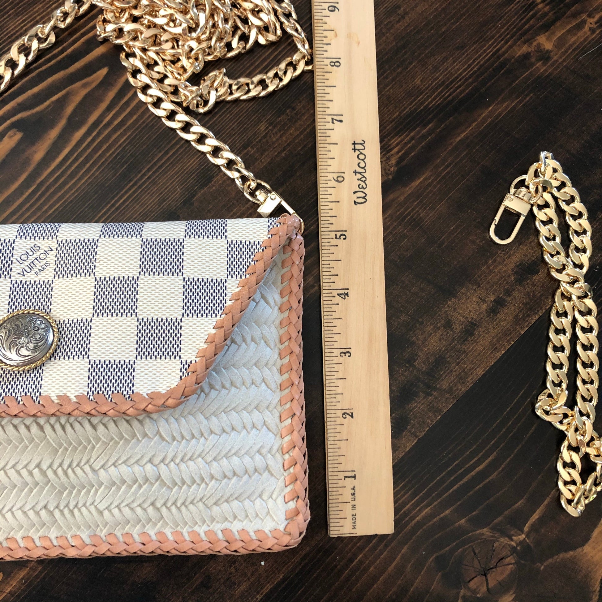 The outside edge is a natural colored leather lace which has been stitched by hand. The Damier Azur is lined with a cream colored leather, making the canvas more substantial. It is stitched to a beautiful piece of embossed cream colored leather. There are gold D-rings secured in the back so that you can go from crossbody to wristlet to clutch!! The wristlet and crossbody straps are both a gold chain that add a bit of flare to this Prestige Totes!! And remember, both straps can be removed to turn this into a show-stopper clutch. APrestige Totes silver/gold snap completes this look.