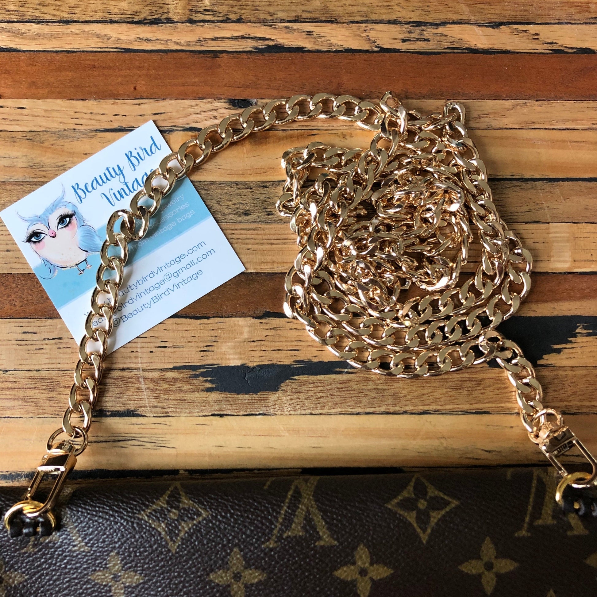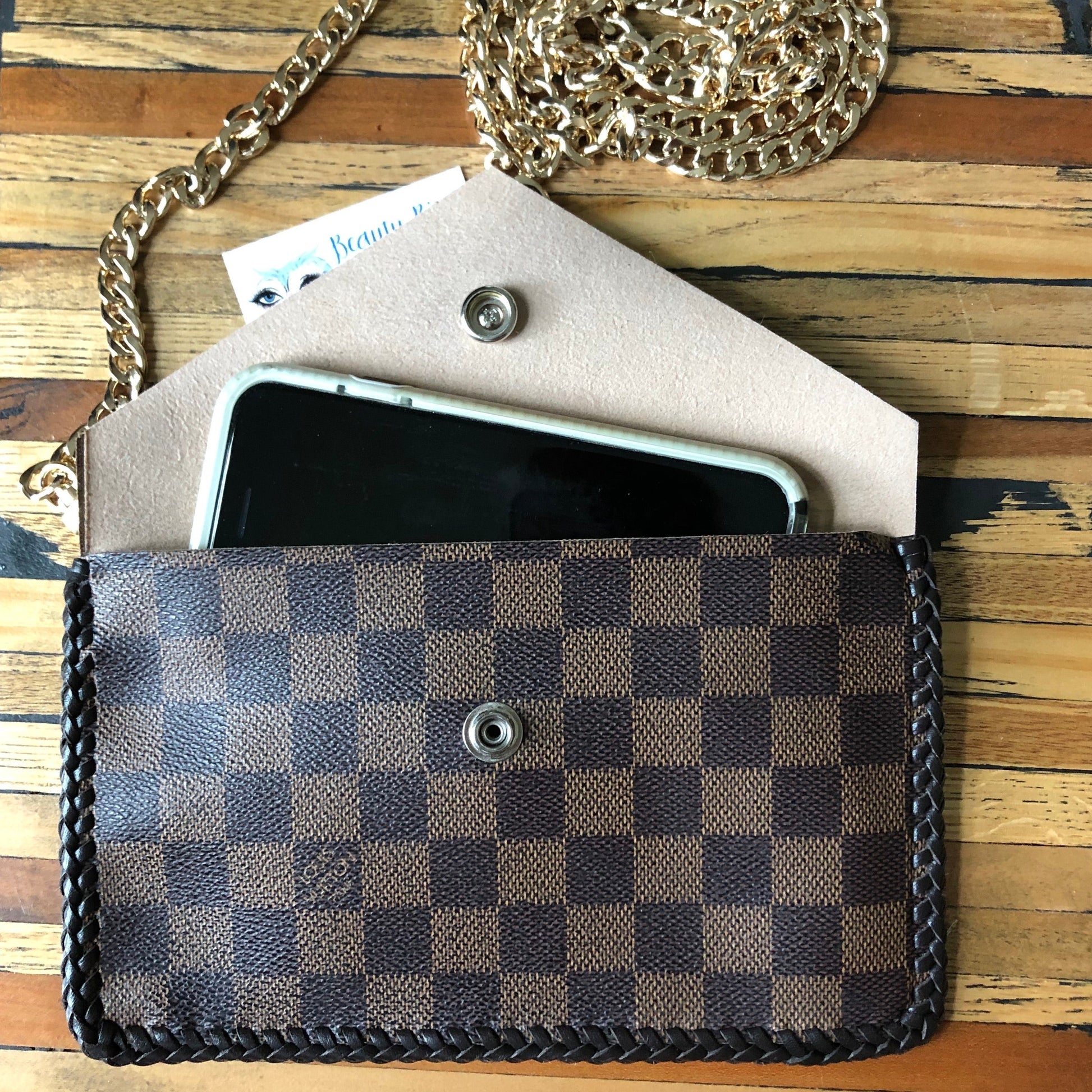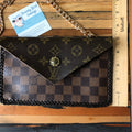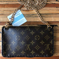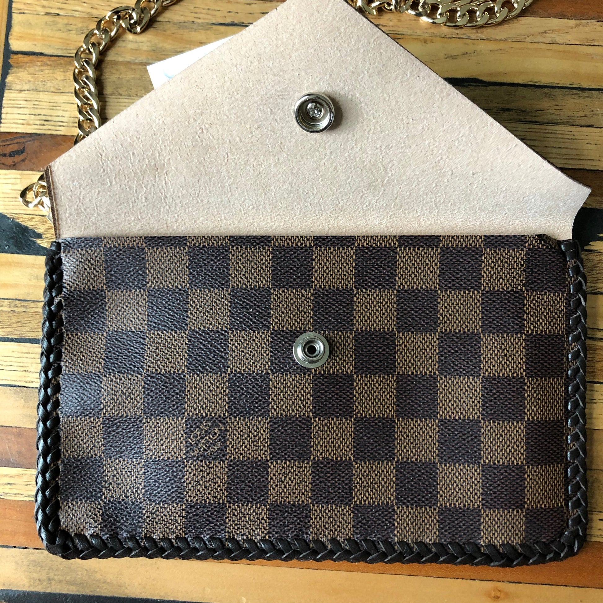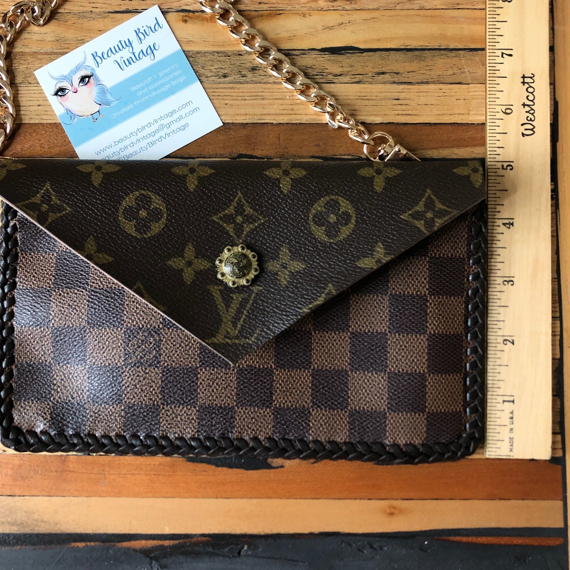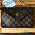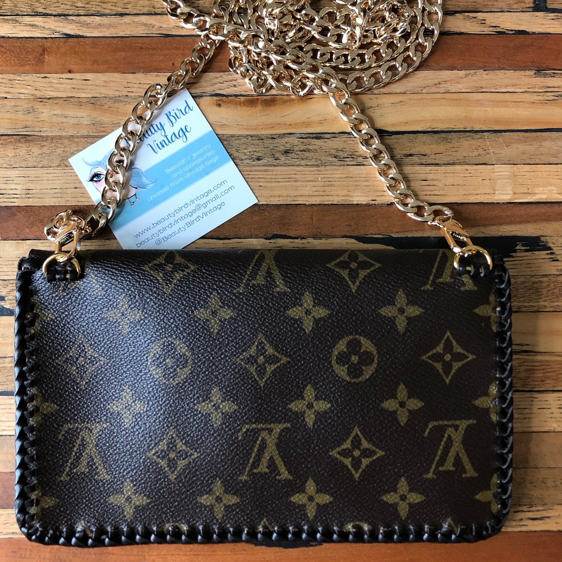 As always, Louis Vuitton bags were used to make this one-of-a-kind piece. The outside edge is brown leather lace which has been stitched by hand. There are gold D-rings secured in the back so that you can go from crossbody to wristlet to clutch! The wristlet strap is made from Vachetta leather from another LV bag. The gold crossbody chain adds a bit of flare to this Prestige Totes, don't you think?! And remember, both straps can be removed to turn this into a beautiful clutch. APrestige Totes black/gold snap completes this look.