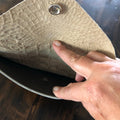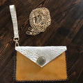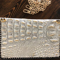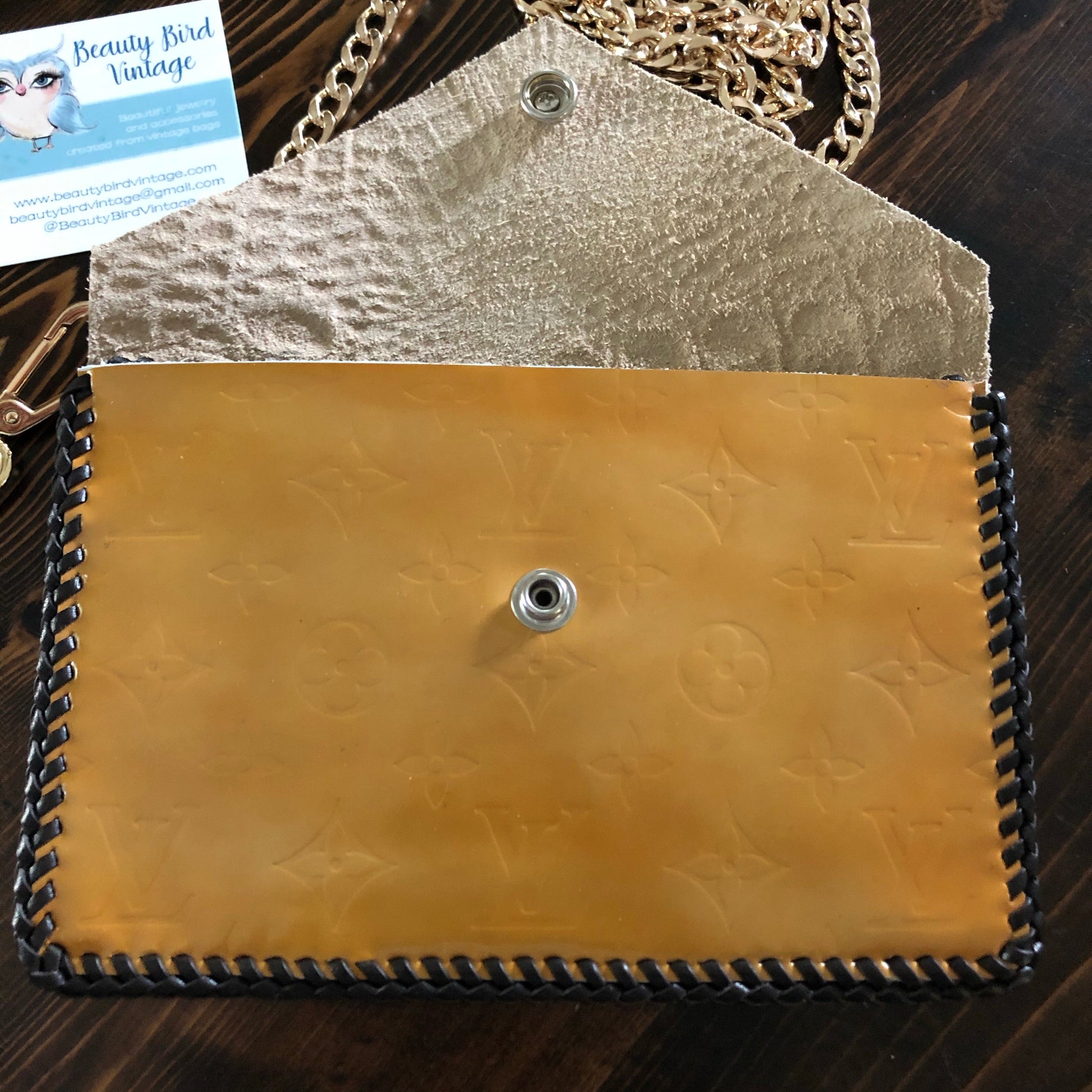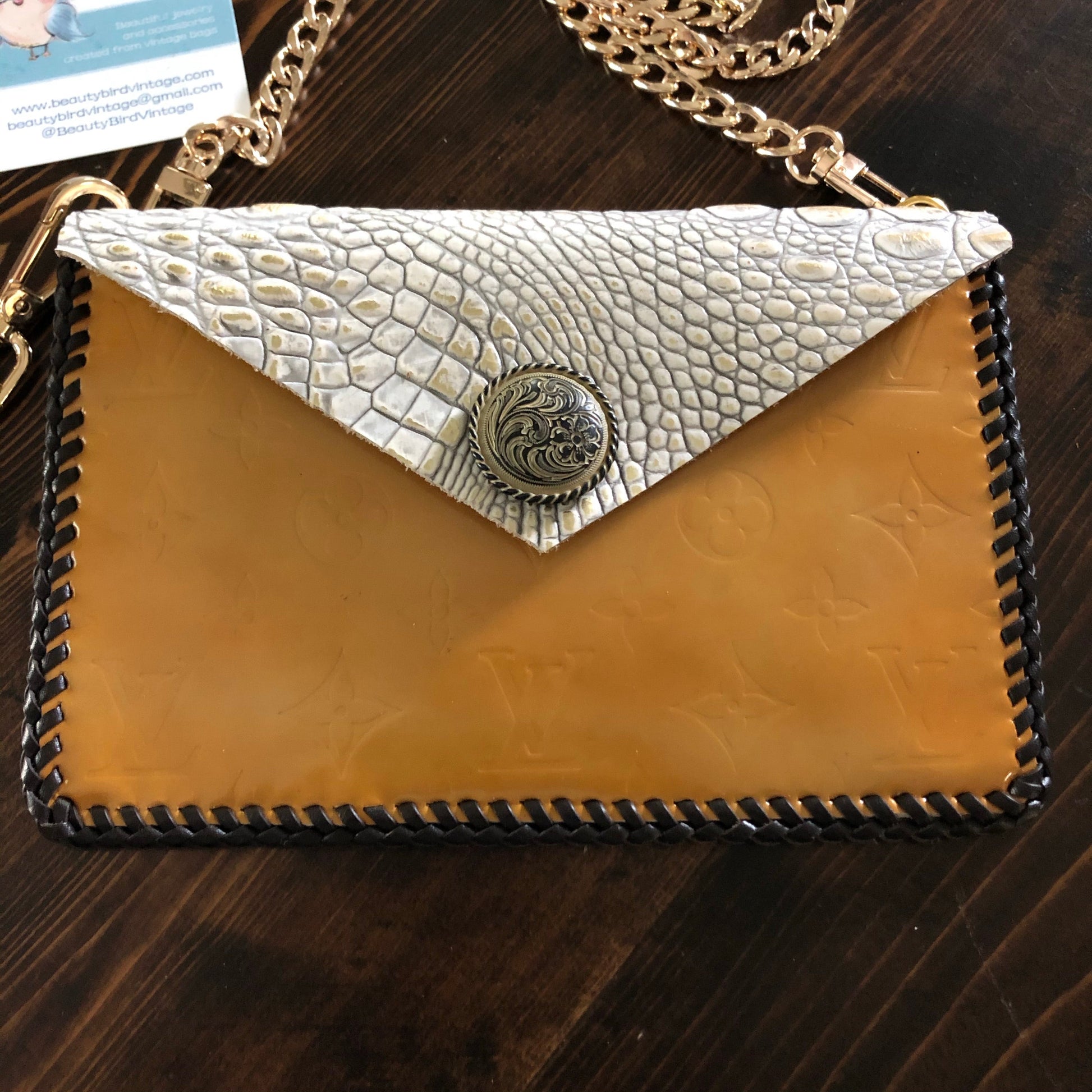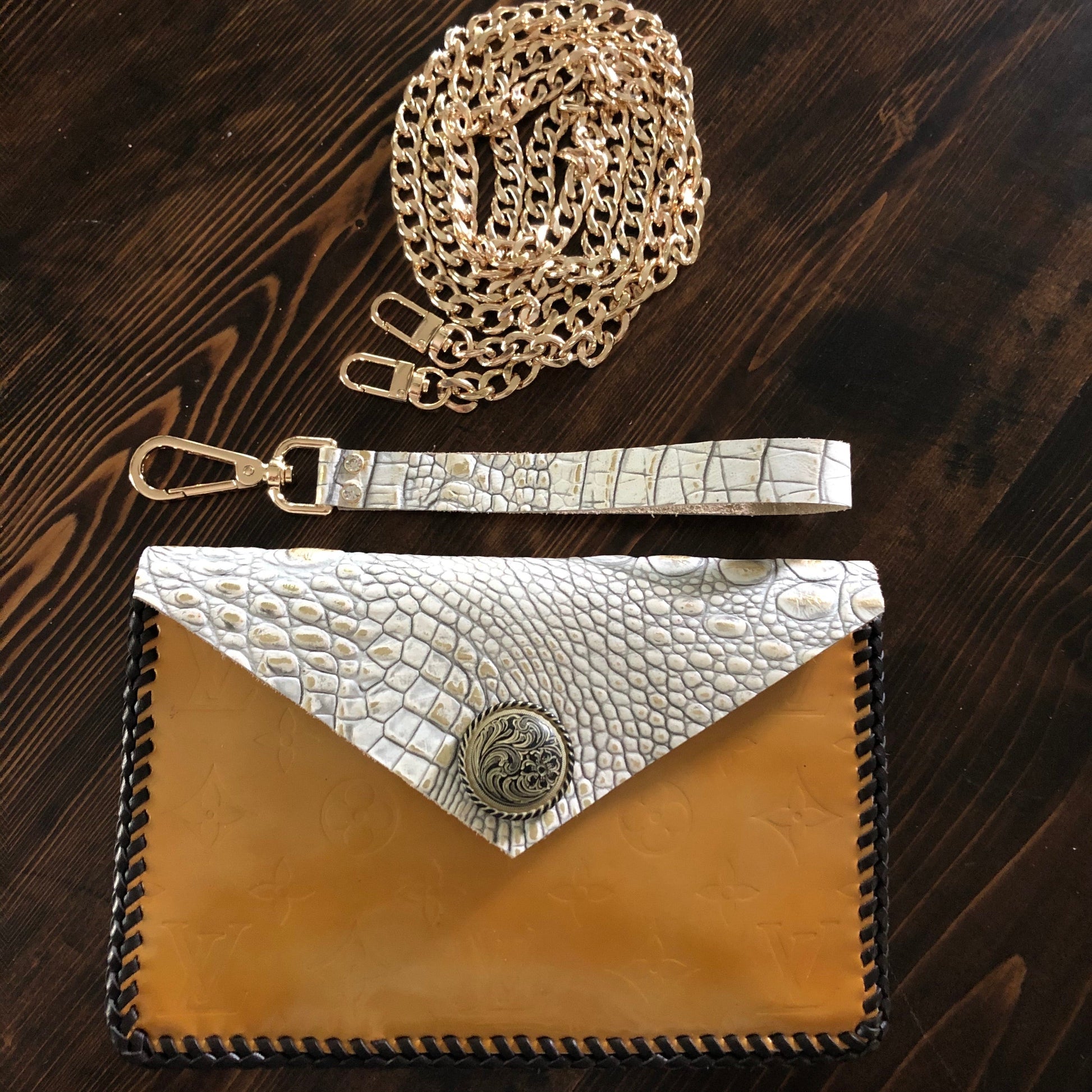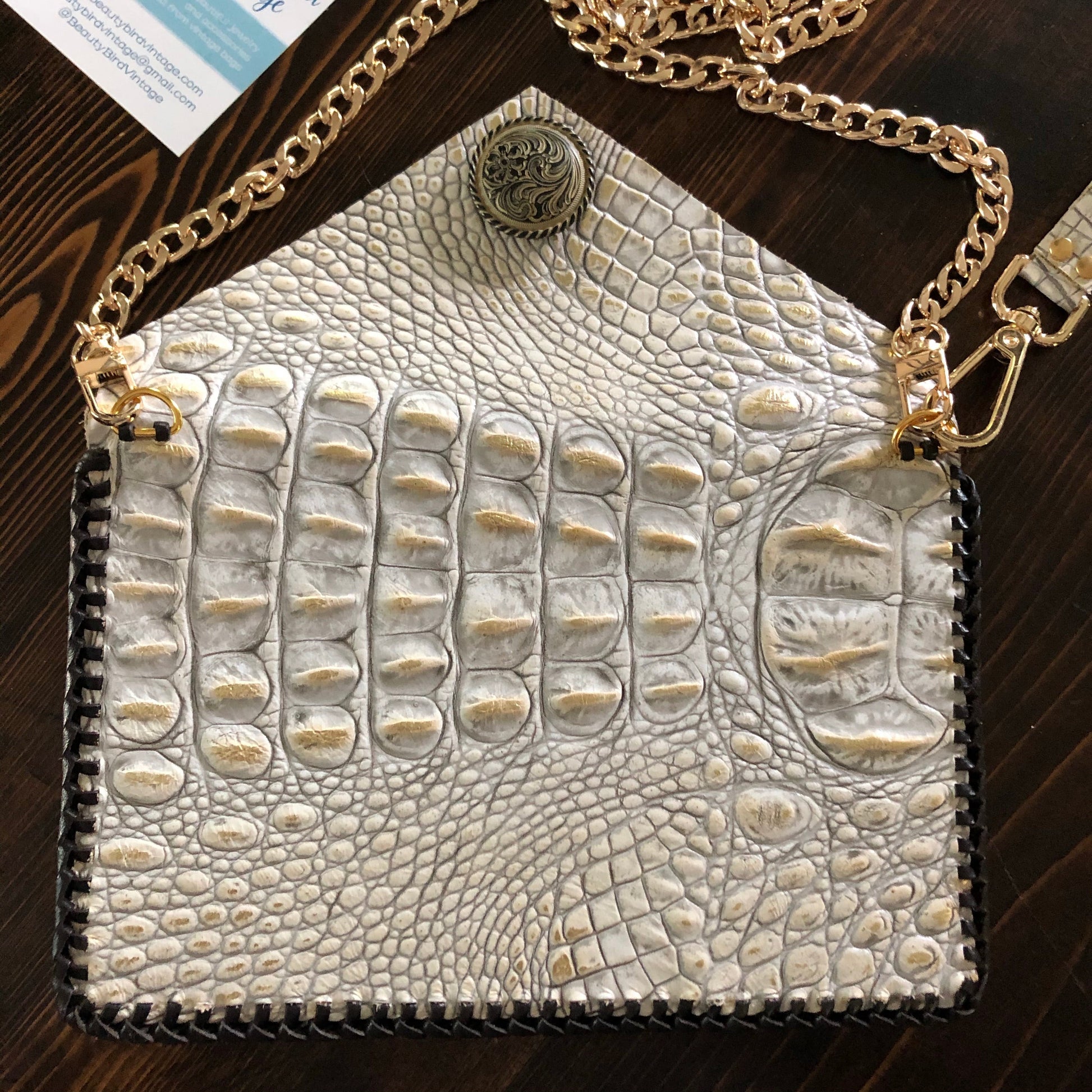 As always, an Gold Vernis Louis Vuitton bag was used to create this beautiful little 3-in-1 bag! The Vernis is weathered a bit, but still looks beautiful. Please look at the pics! The back/front is a gorgeous white gator-embossed leather that has light touches of GOLD!! It is STUNNING!!! The outside edge has been stitched by hand with brown leather lace. There are gold D-rings stitched into the back that will hold the gold crossbody chain, or the click-n-go wristlet. Or, take both off and turn this into a beautiful clutch! APrestige Totes black and gold snap completes this look.