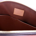 Exterior: The exterior coated canvas shows no major signs of wear. The leather trim has minor discoloration.
