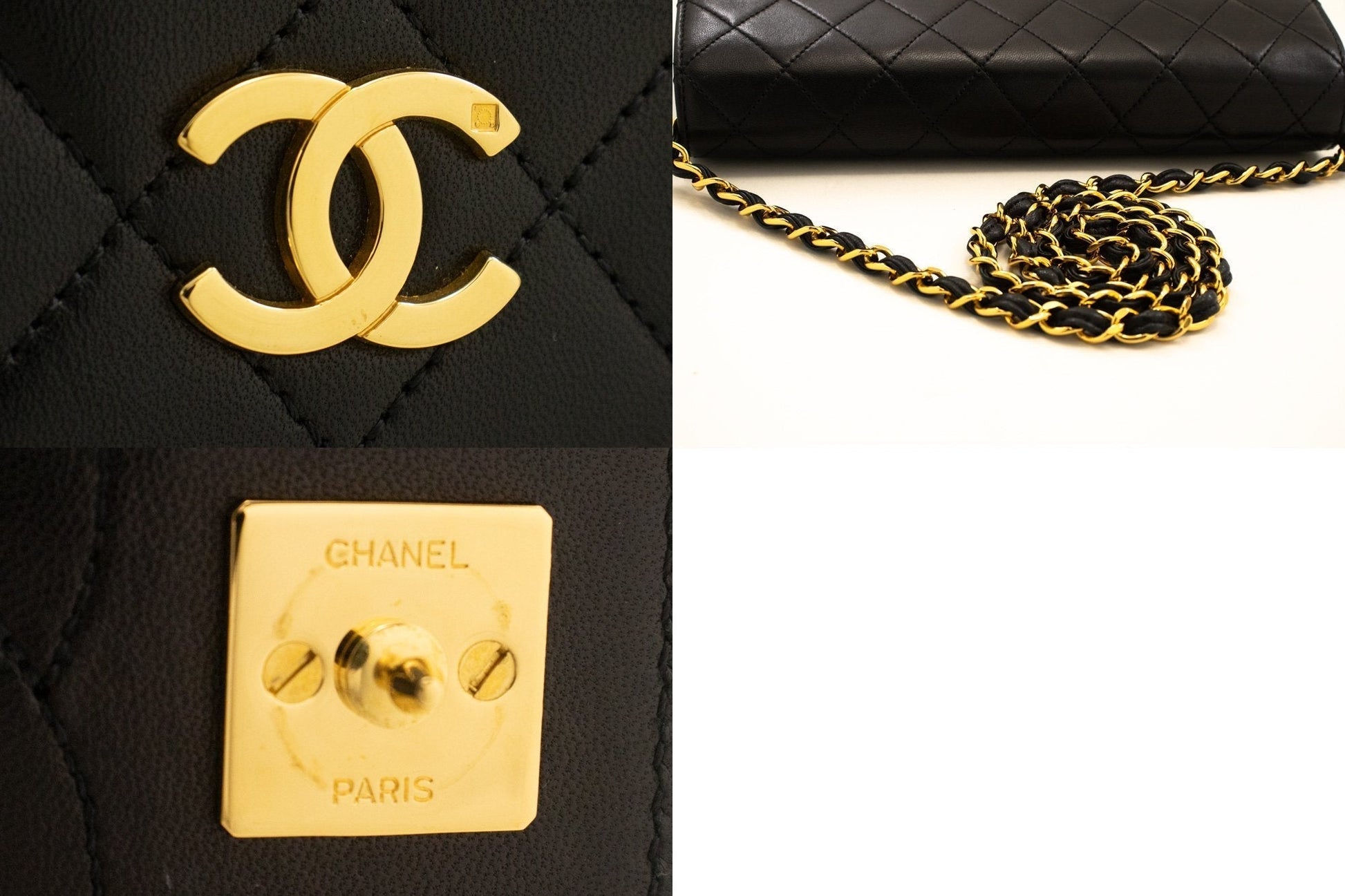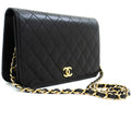 An CHANEL Full New Chain Shoulder Bag Clutch Black Quilted made of black Lambskin.