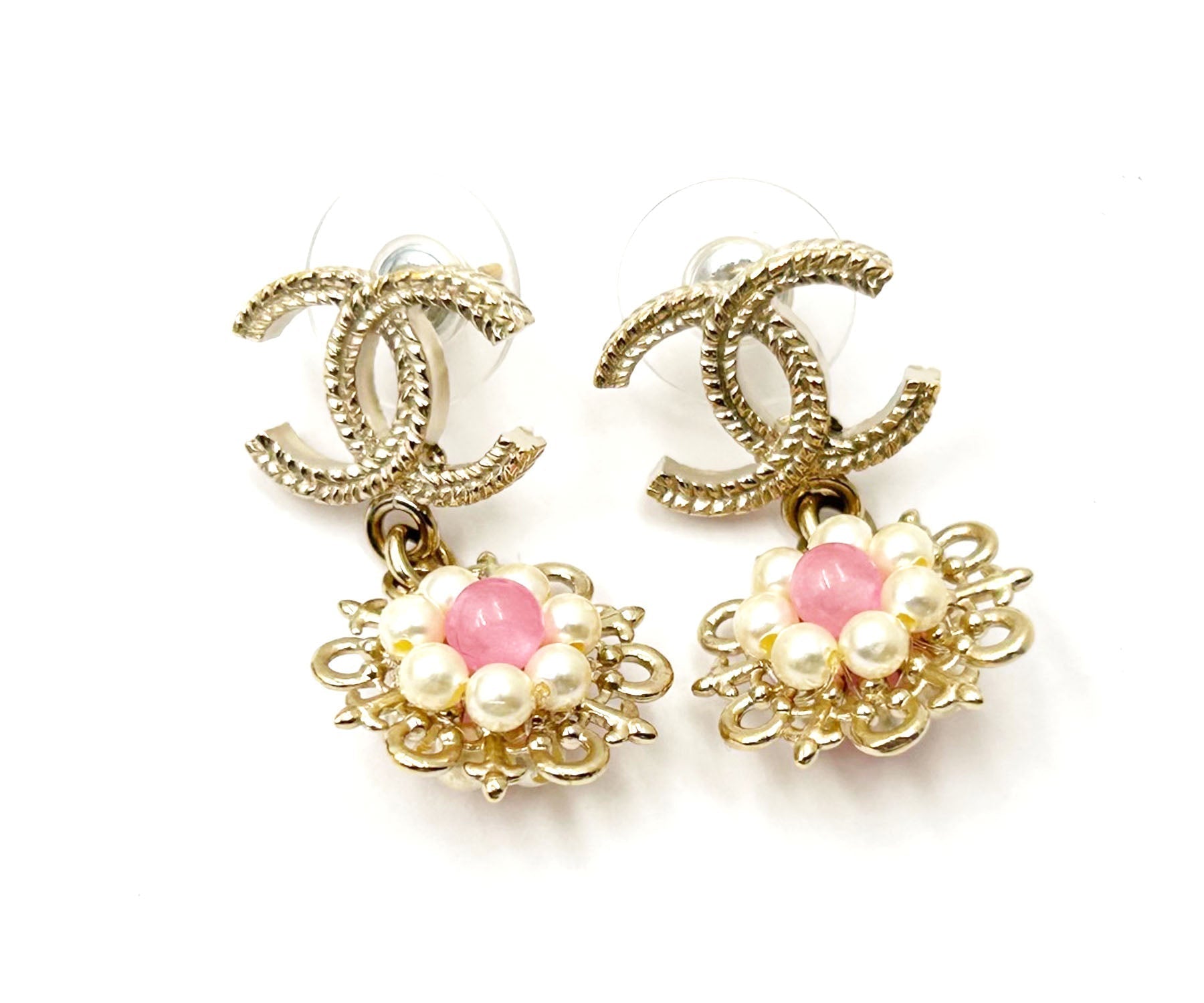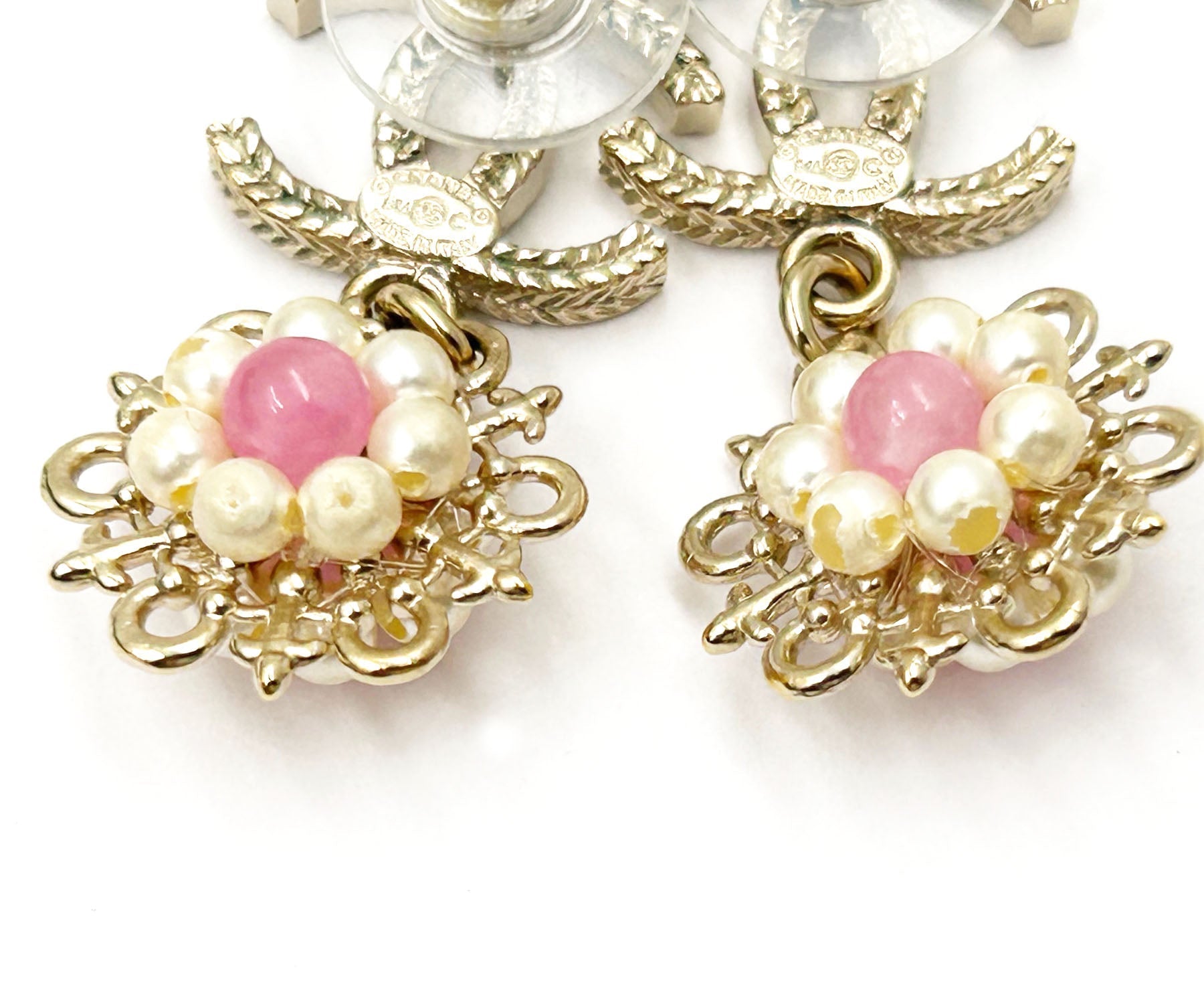Chanel Gold CC Pink Bead Pearl Wheel Piercing Earrings.