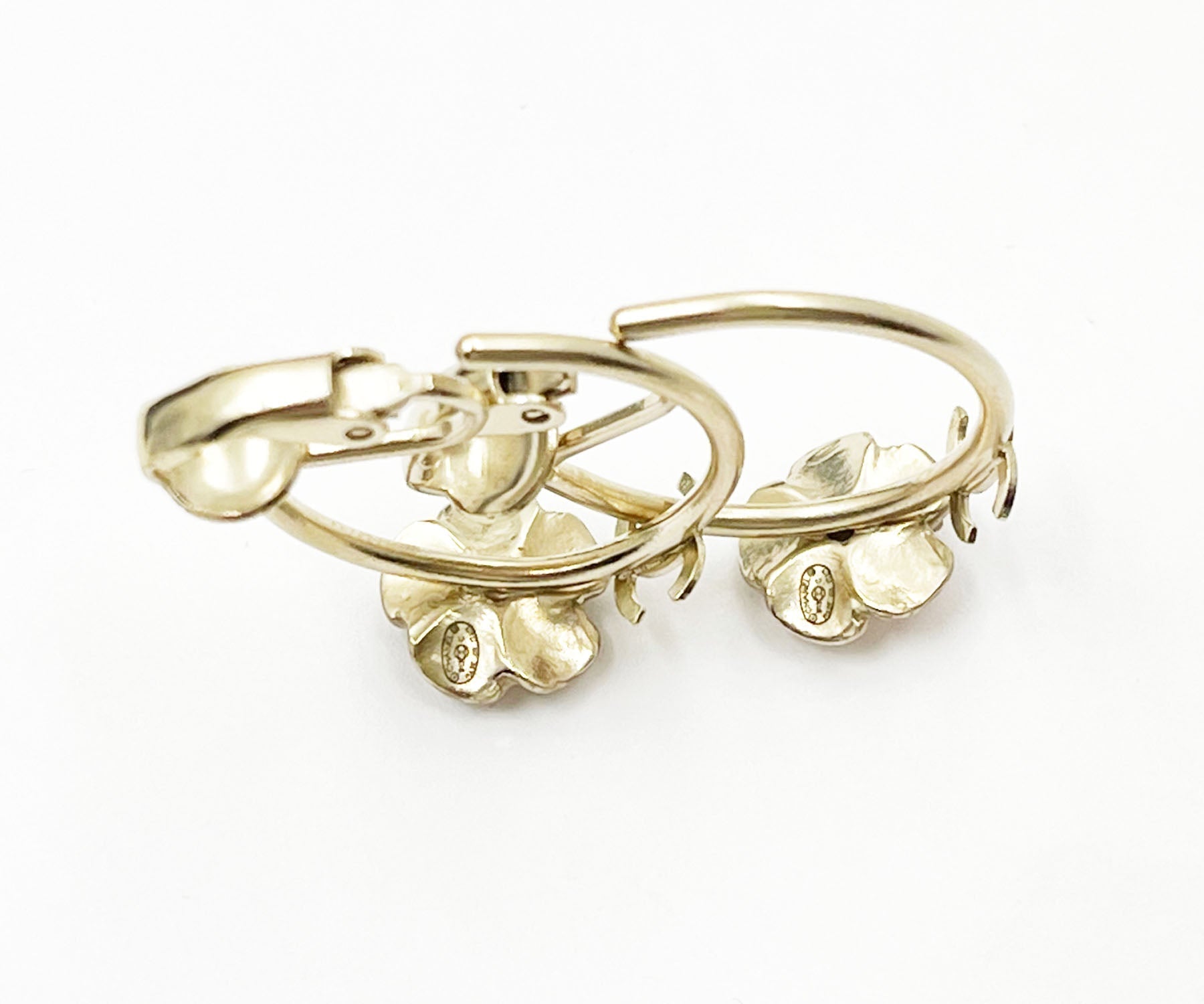Chanel Gold CC Pink Flower Hoop Clip on Earrings.