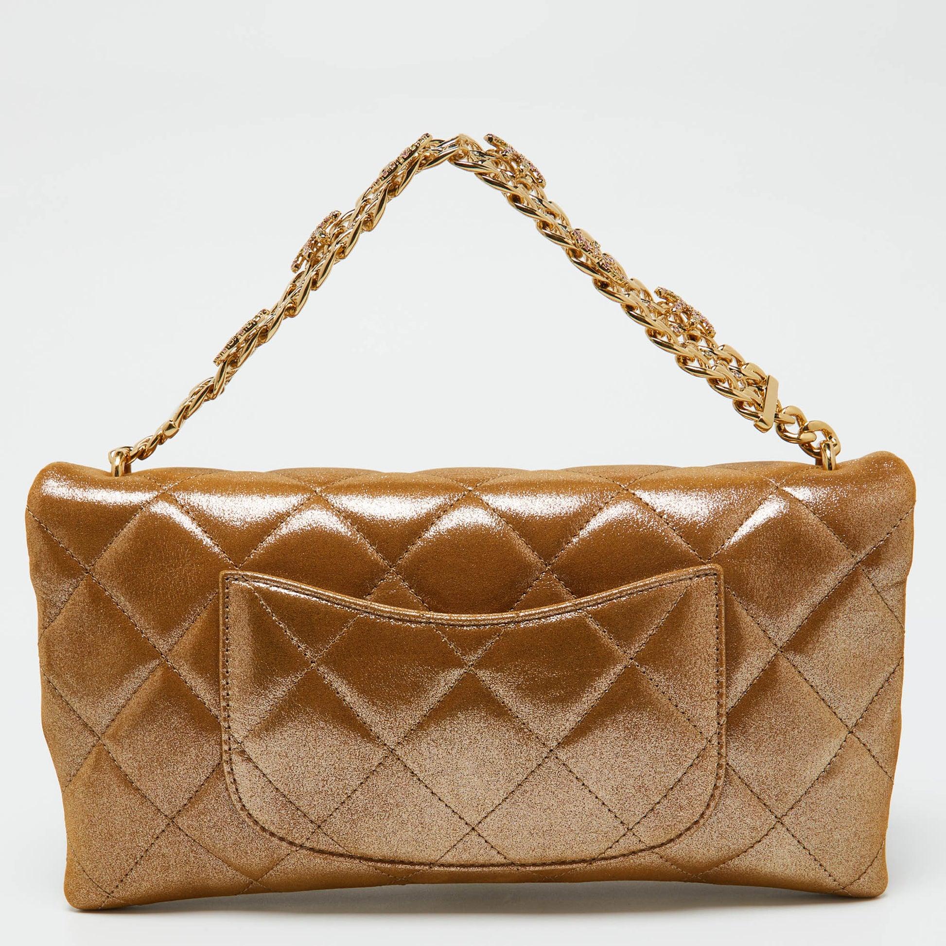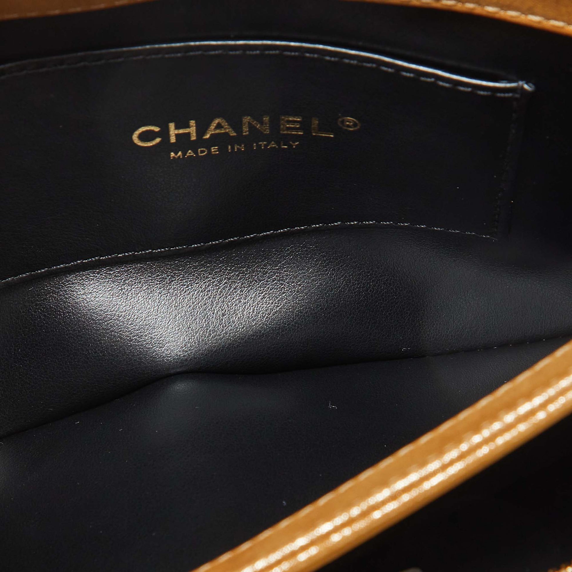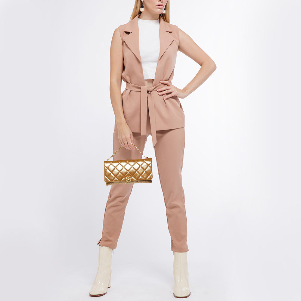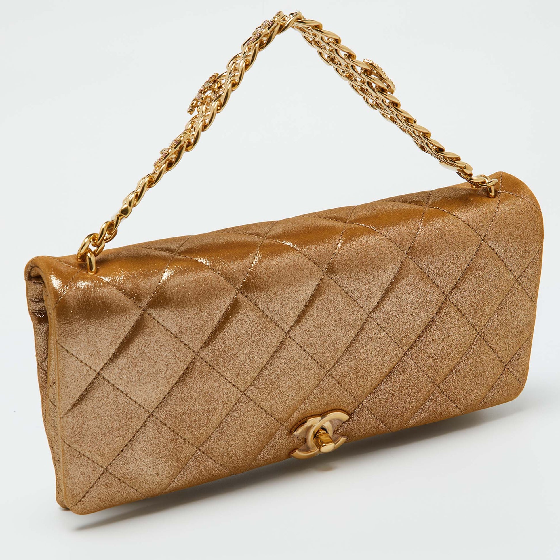 Indulge in timeless luxury with this Chanel gold bag. Meticulously crafted, this iconic piece combines heritage, elegance, and craftsmanship, elevating your style to a level of unmatched sophistication.