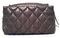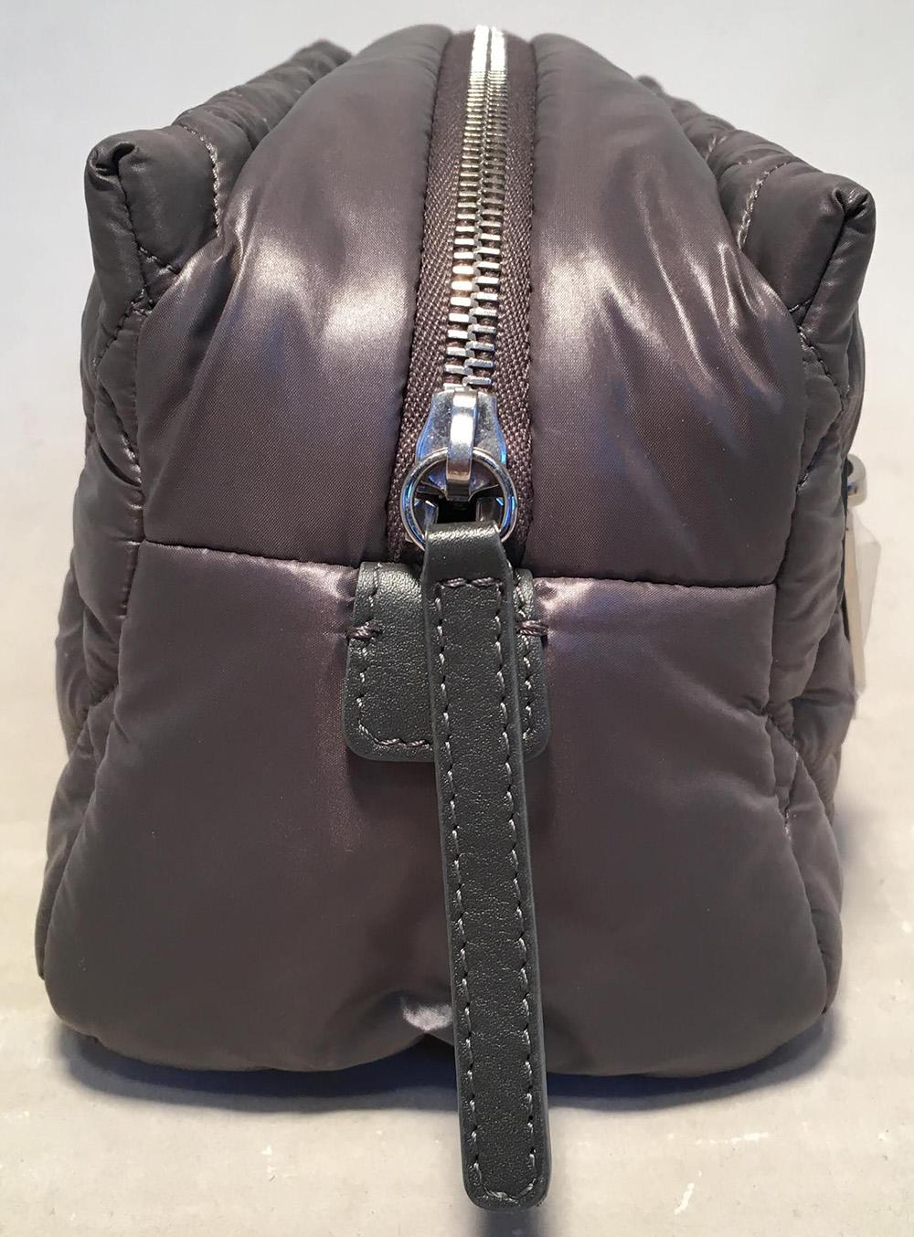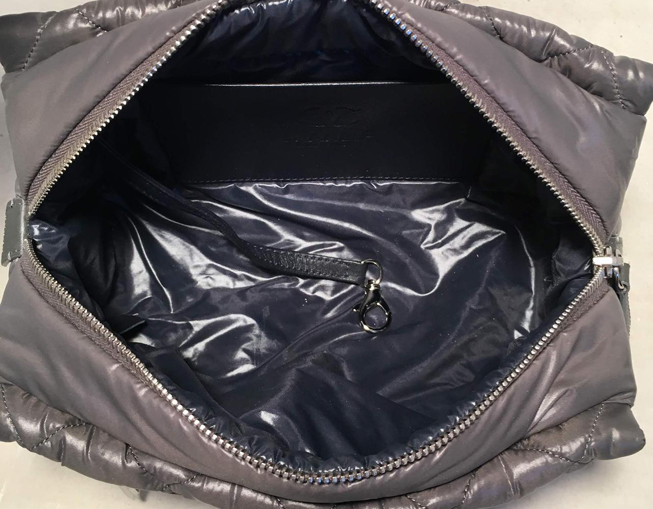 Grey quilted nylon soft puffy exterior trimmed with silver hardware and grey leather.