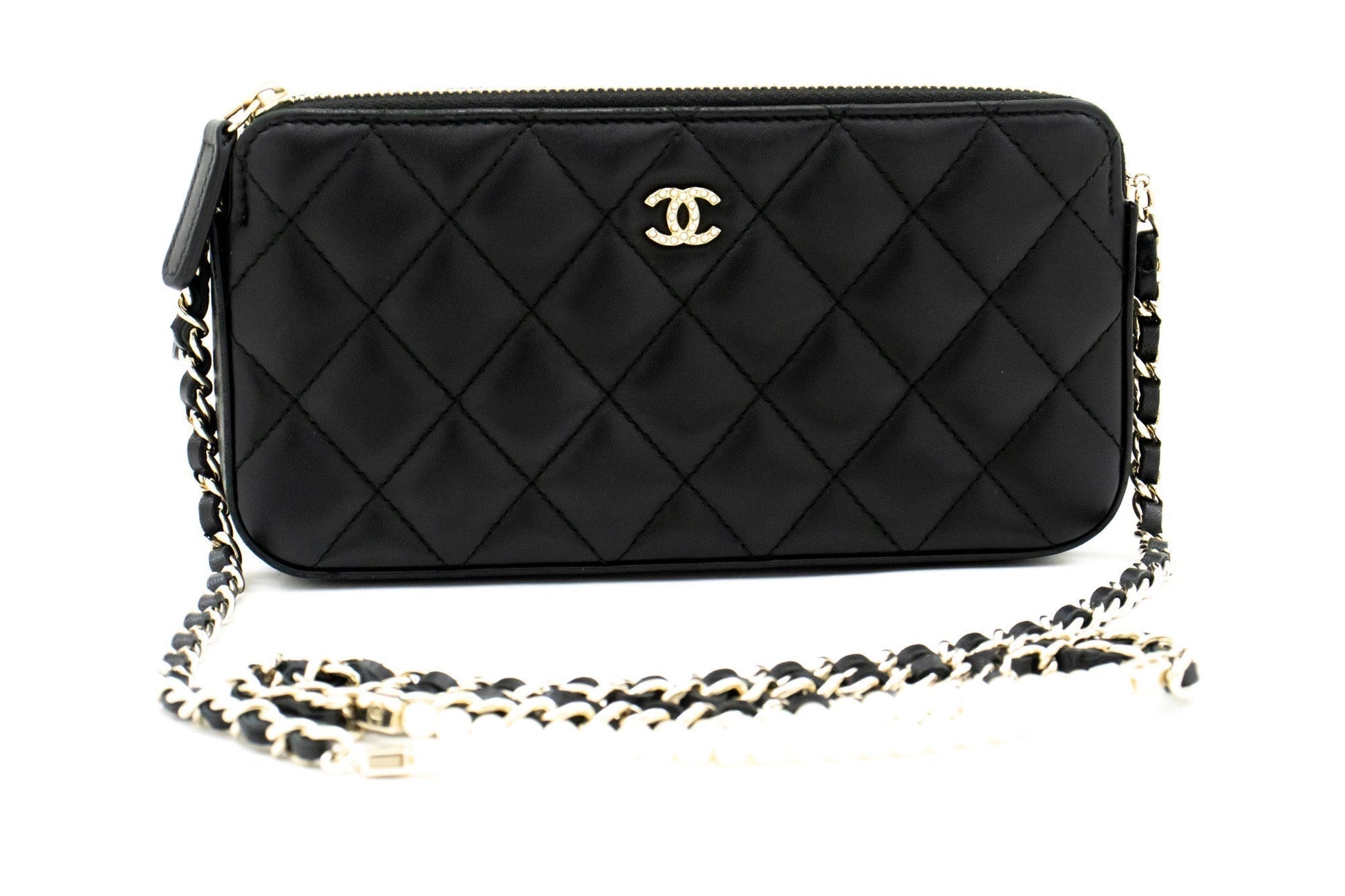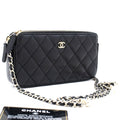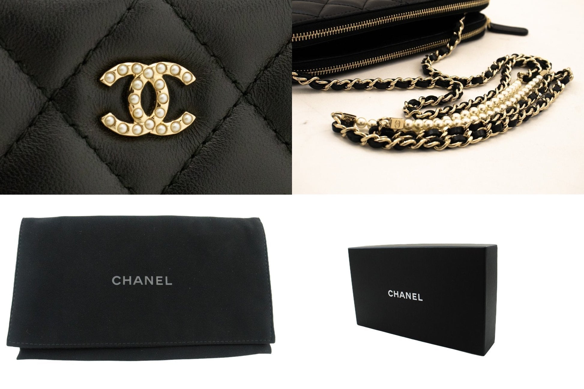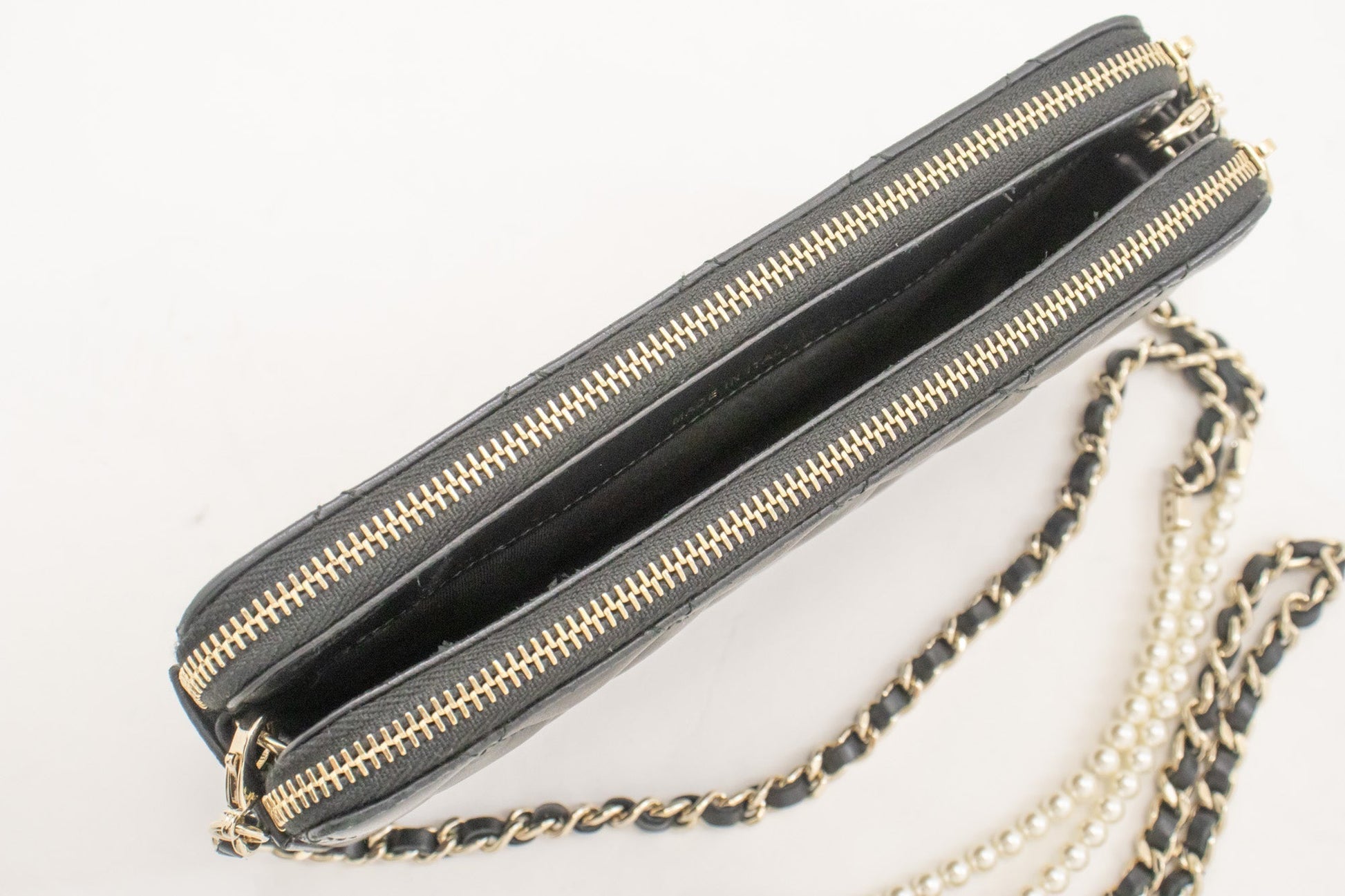 An CHANEL made of black Lambskin Pearl Wallet On Chain WOC Double Zip Chain Bag.