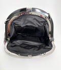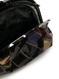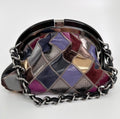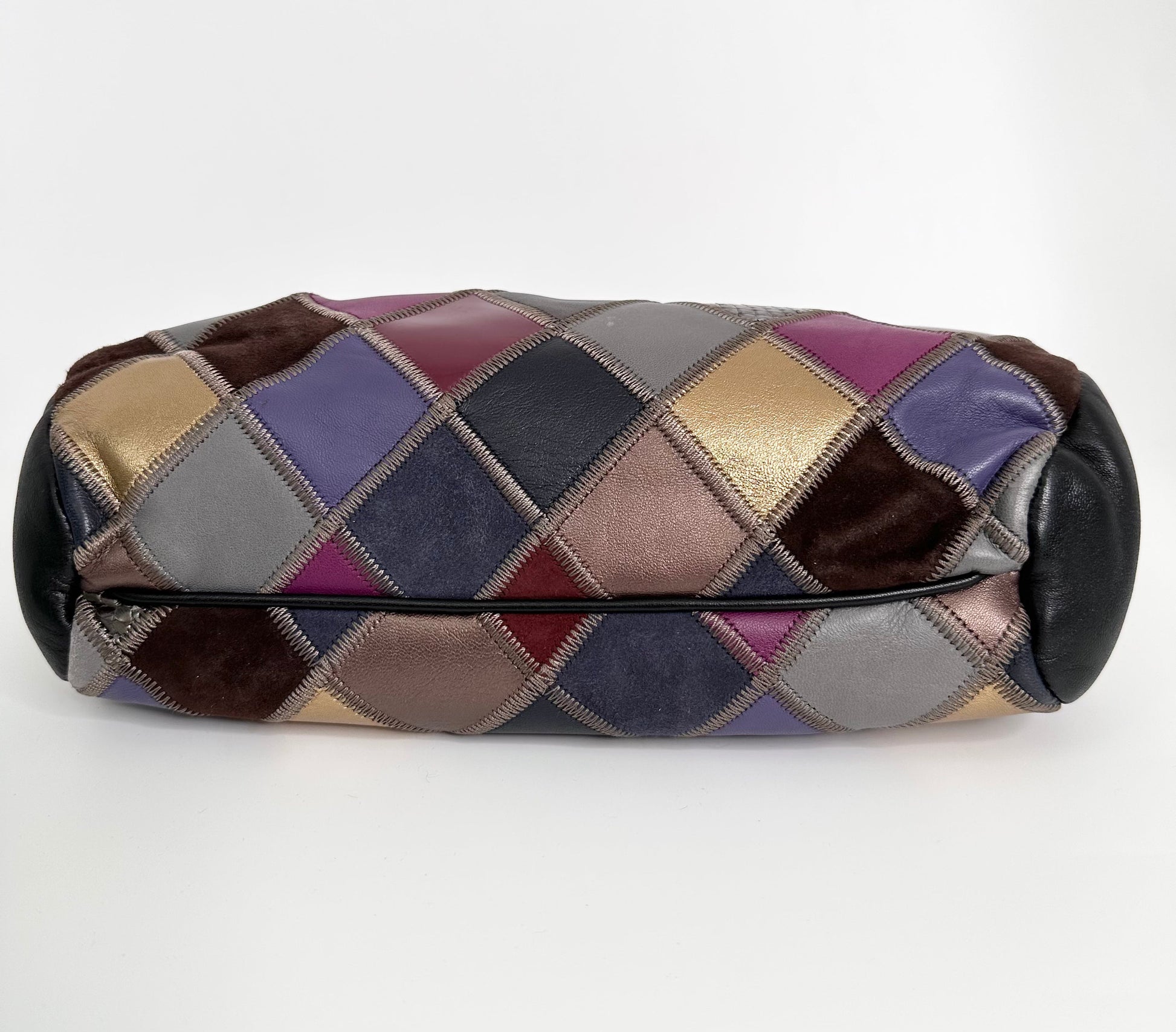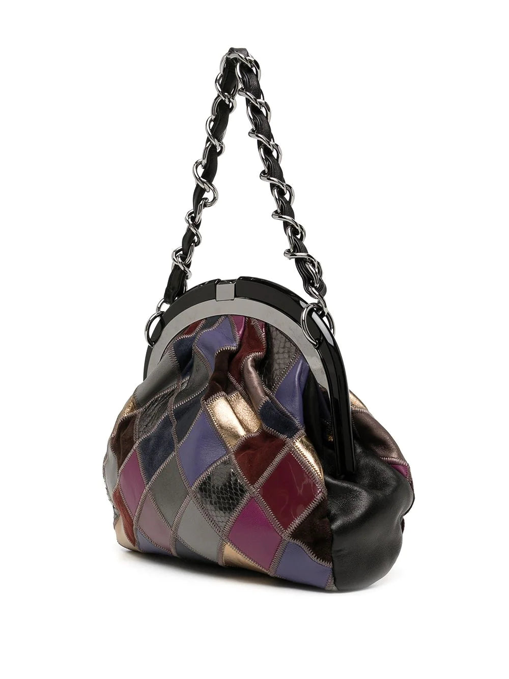 Combining various textures and colours effortlessly, the bag consists of Suede, python, and leather patches sewn together in a harlequin pattern to create an eclectic patchwork design that has been complemented by a clasp-top closure and chain strap.