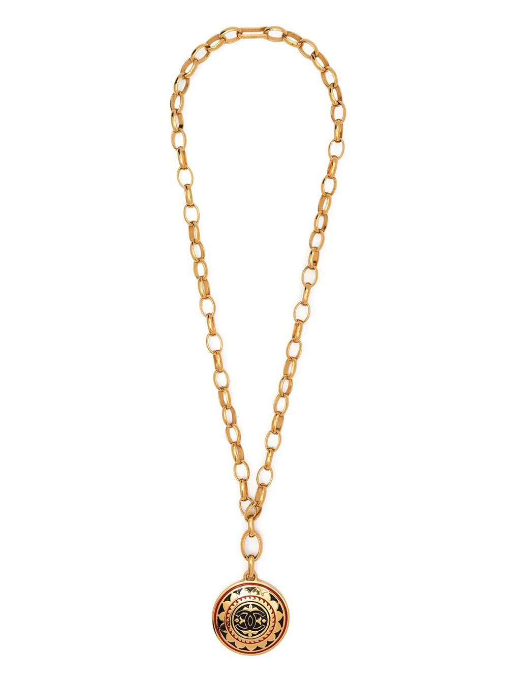 This statement Chanel necklace features a gold-toned chain strap with a CC metal medallion, enamelled in black and red.