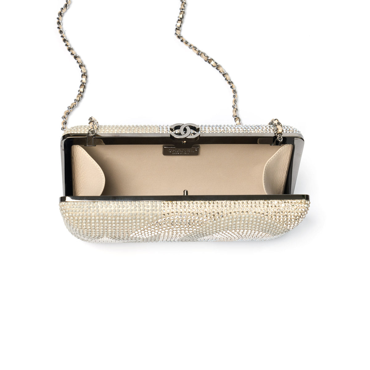 Circa 20013-2014 Silver-tone Satin finish Rhinestone embellishment Signature interlocking CC logo Detachable fabric and chain-link shoulder strap Clasp fastening Main compartment Internal logo patch Leather lining Gunmetal-tone hardware