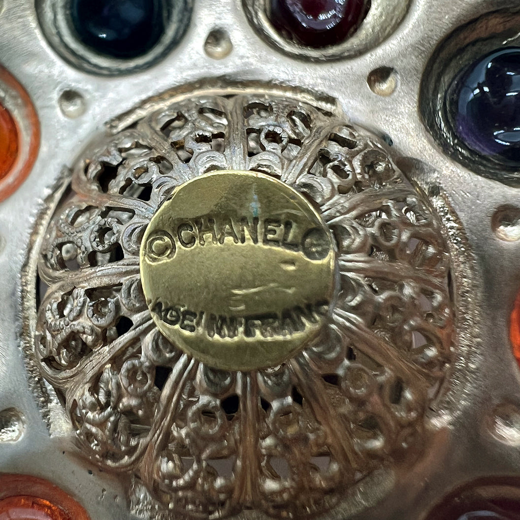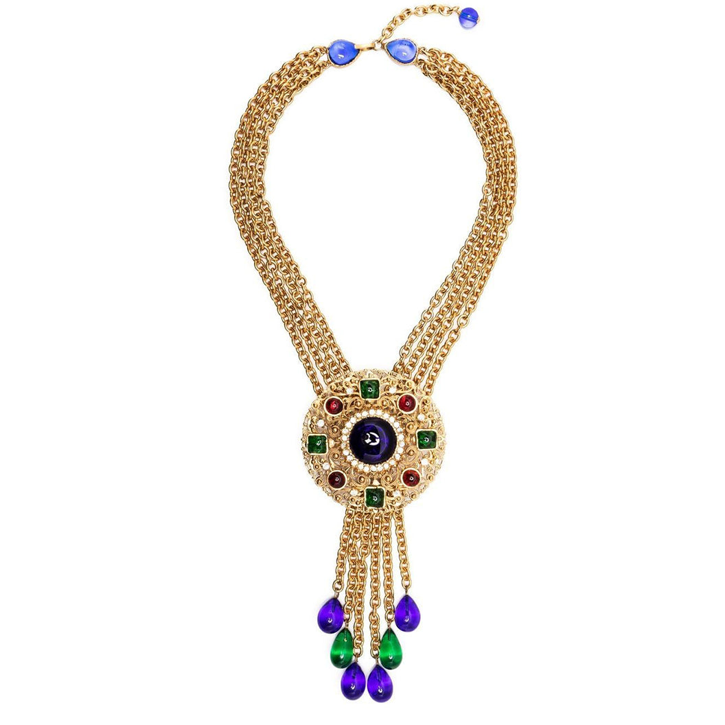 Perfect for a special celebration, this beautiful Chanel necklace by Gripoix from the 1980's showcases an alluring openwork design with a blue centered gripoix stone surrounded by multi-colour faux gemstones in a circular pattern.