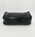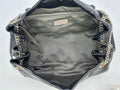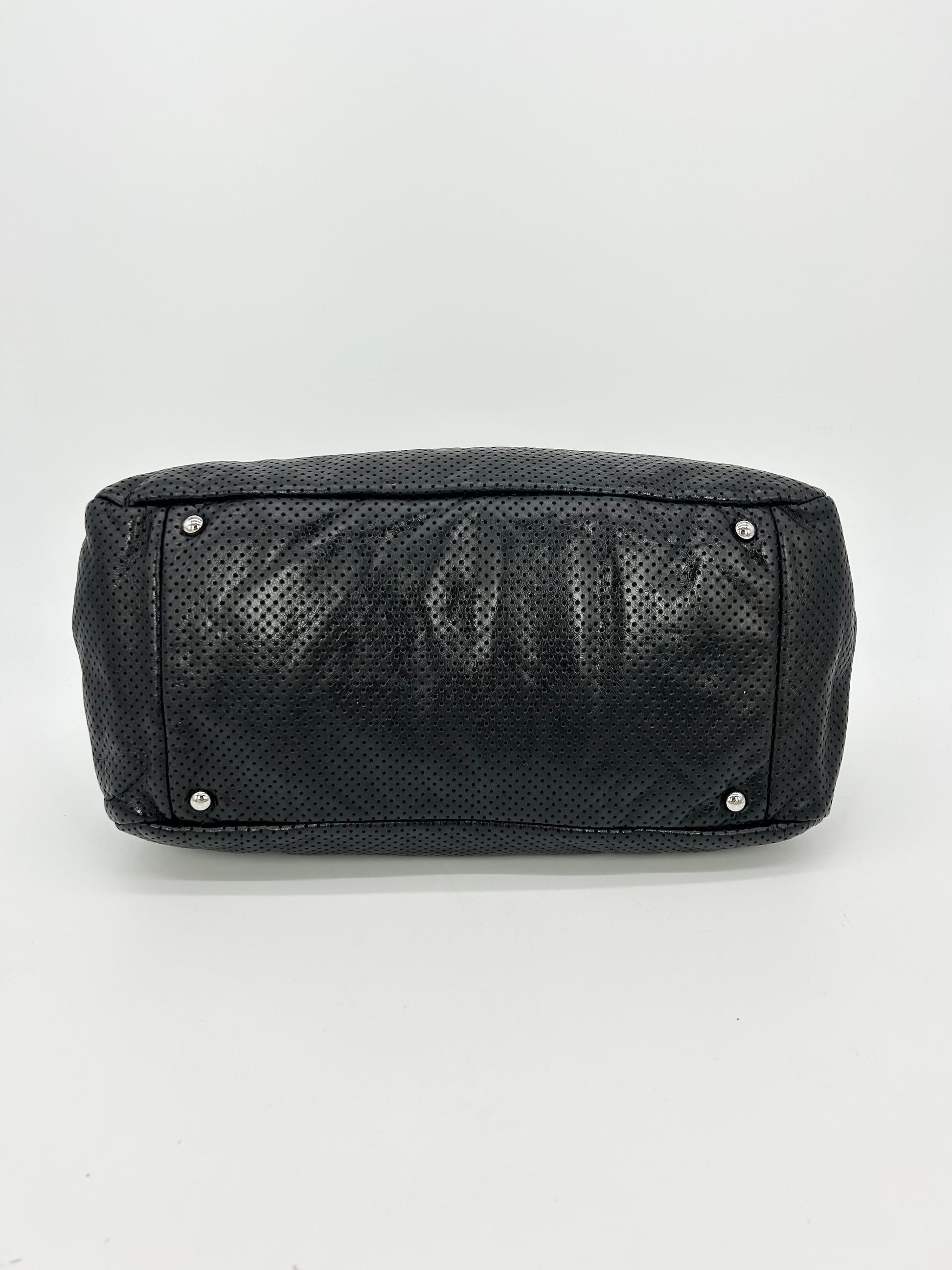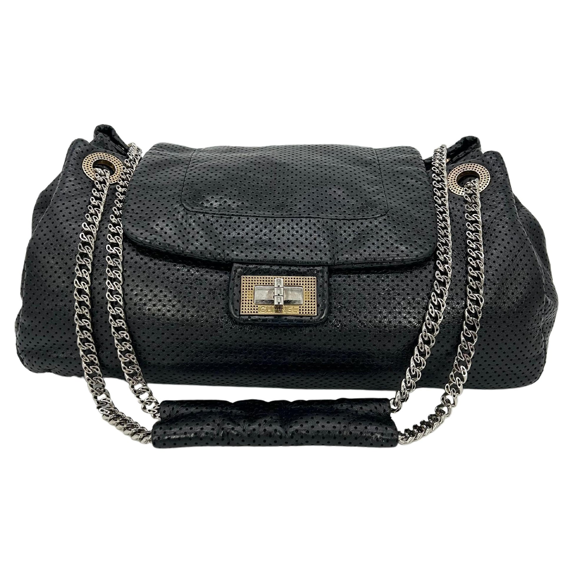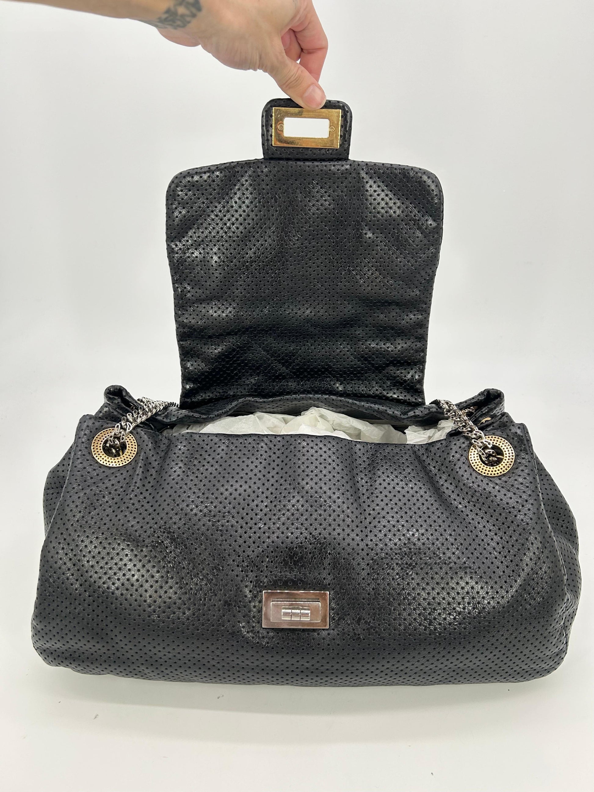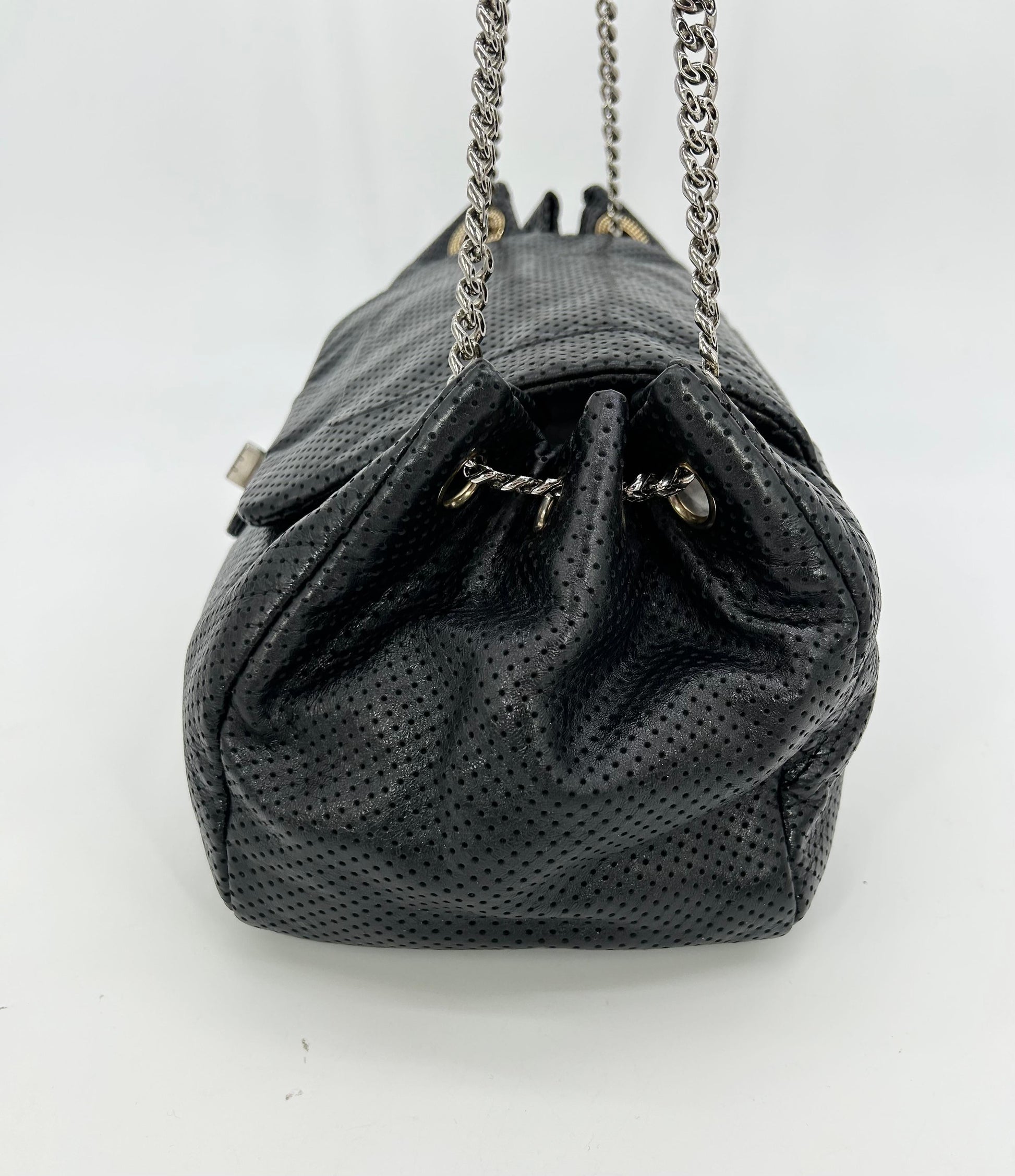 Soft black perforated leather body trimmed with gold hardware and sparkling silver chain shoulder strap handle.