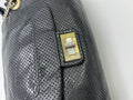 Signature front twisting mademoiselle style lock closure which opens the top New to a gray satin lined interior.