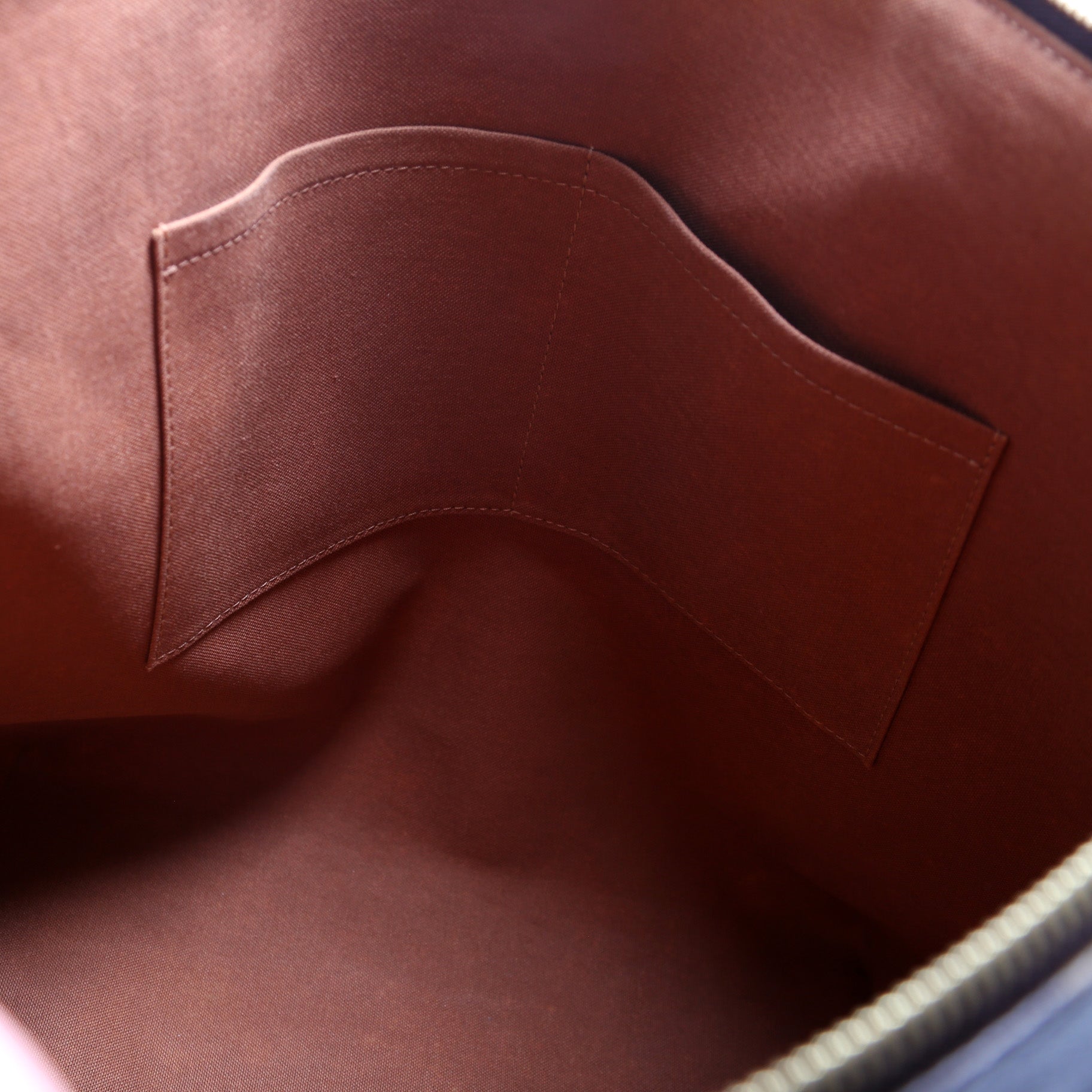 Exterior: The exterior coated canvas is free of any rips or cracks. The exterior features two open pockets. The leather trim shows minor wear.