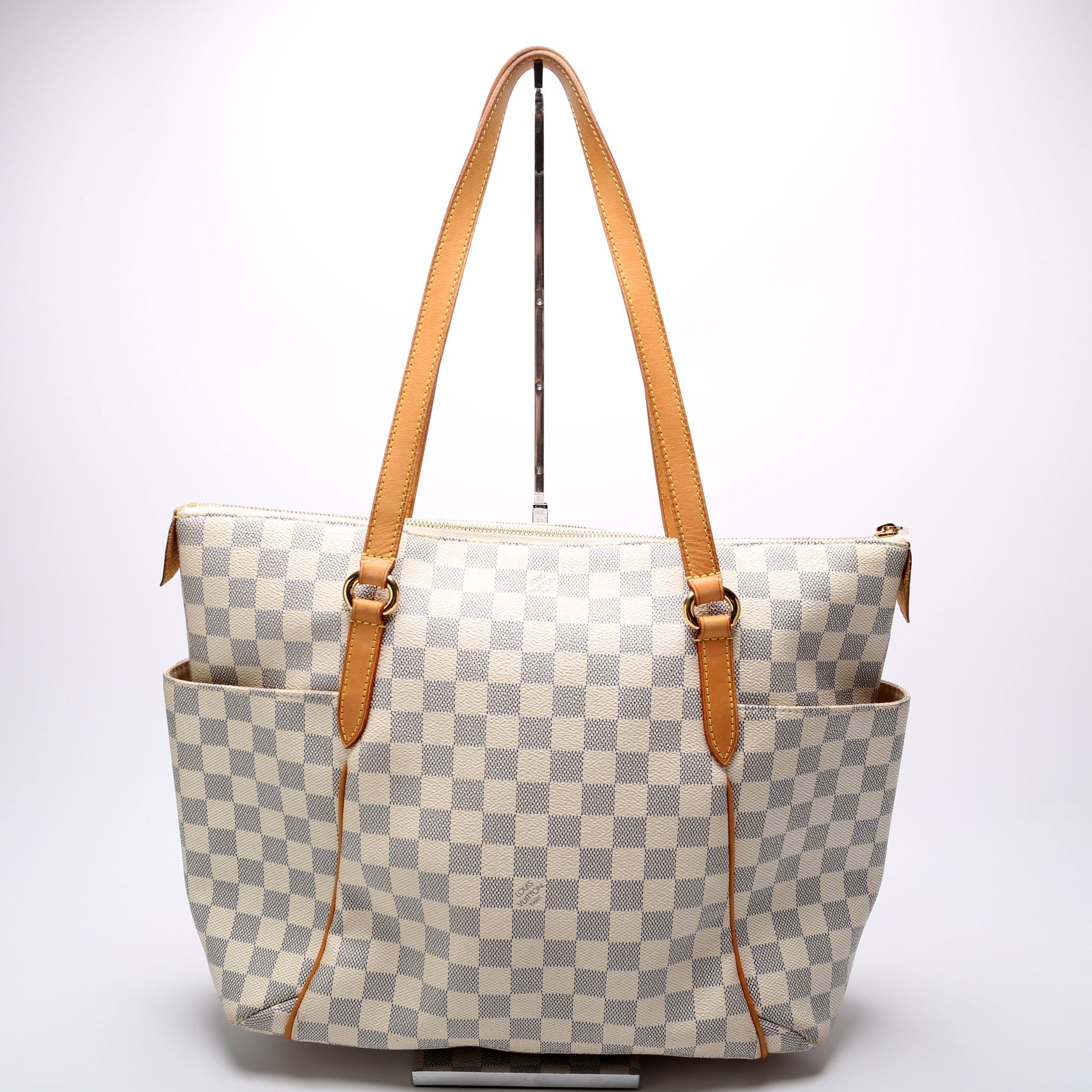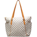 This Louis Vuitton Totally MMis eye catching bag. The exterior is in the classic Louis Vuitton Damier Azur coated canvas.