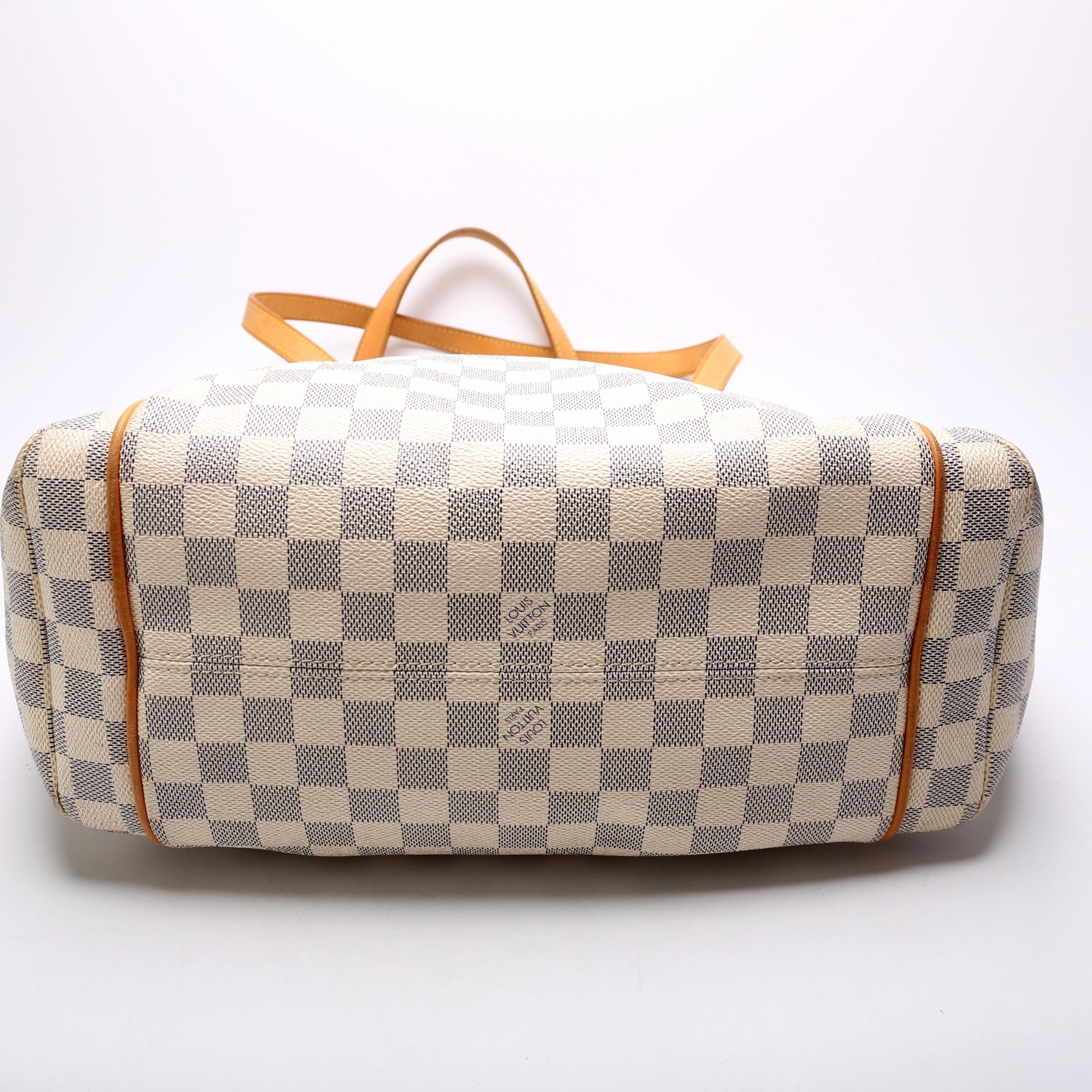Handle: The leather handles show minor wear and discoloration.
