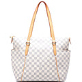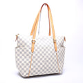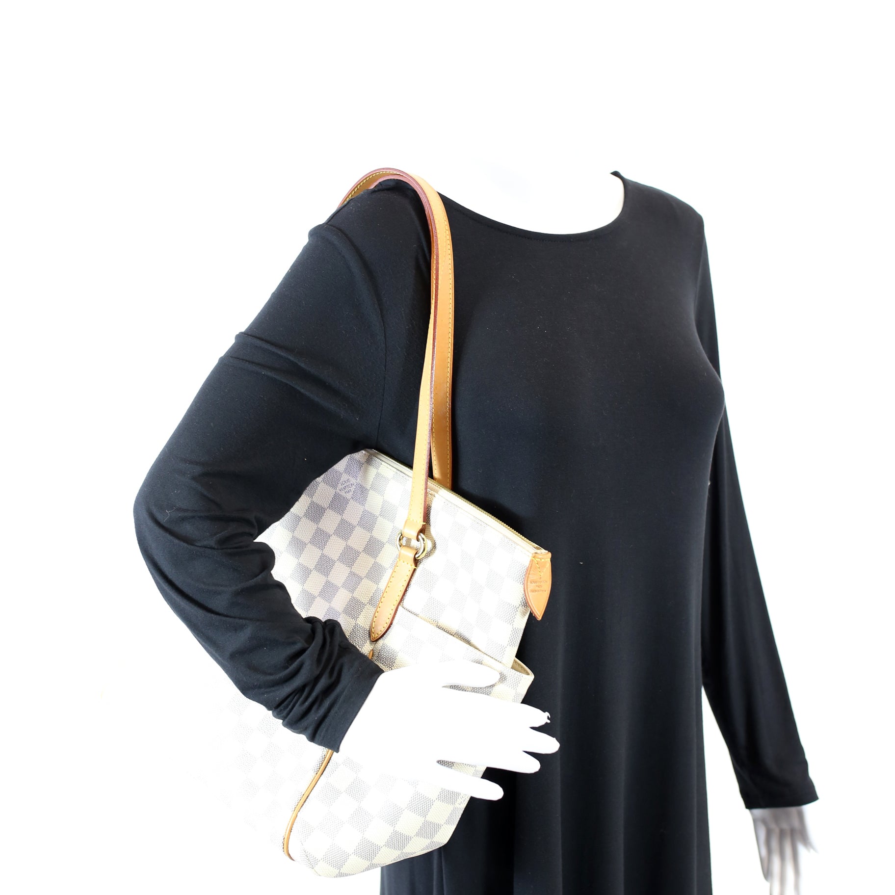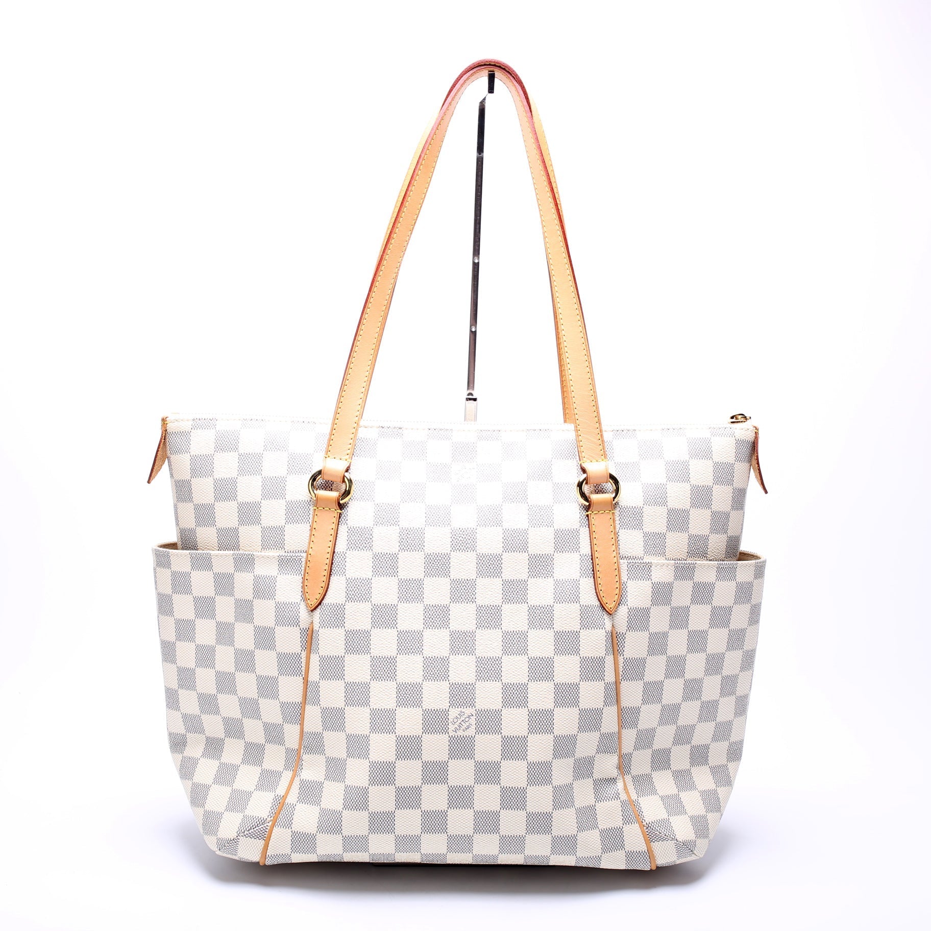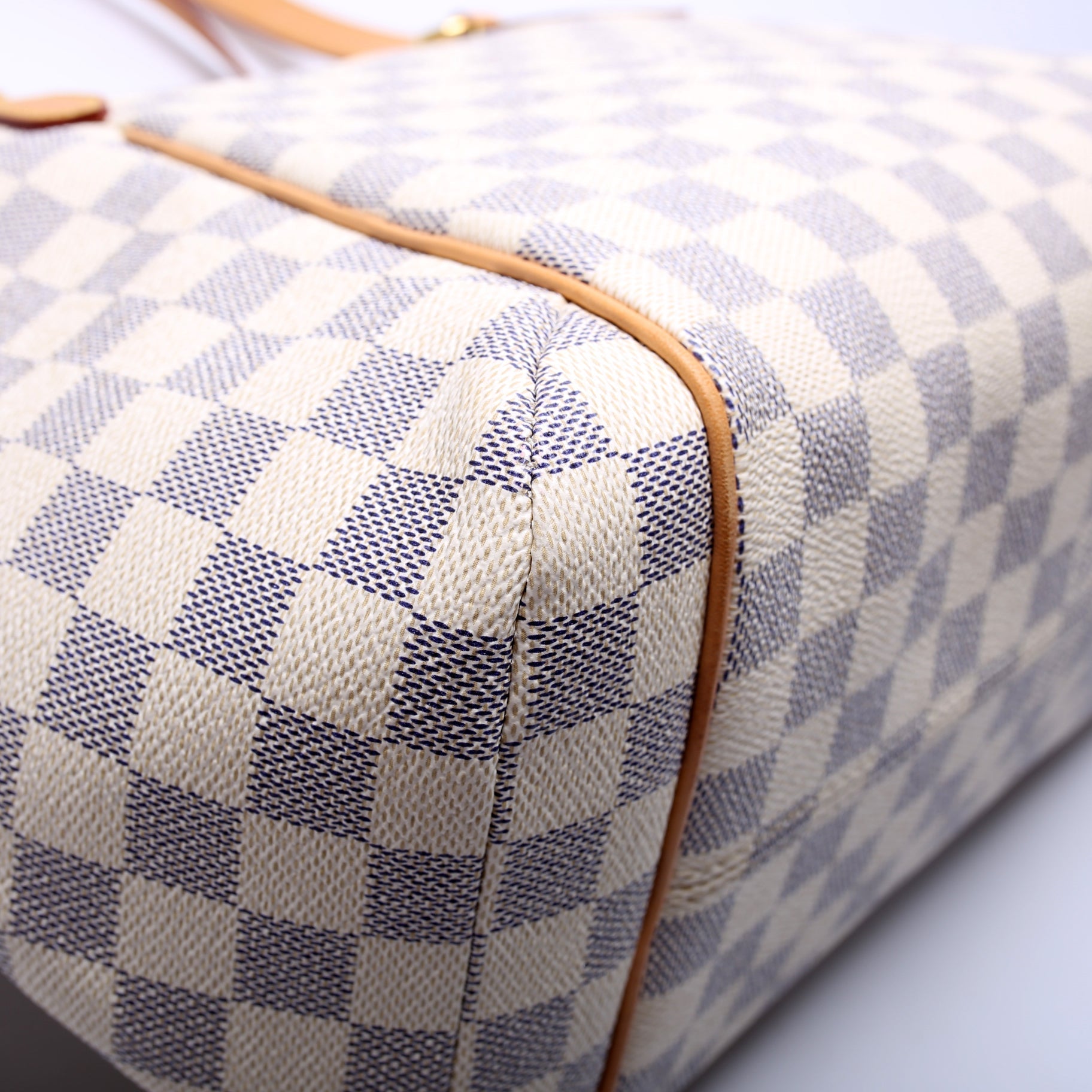 This Louis Vuitton Totally MMis eye catching bag. The exterior is in the classic Louis Vuitton Damier Azur coated canvas.