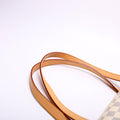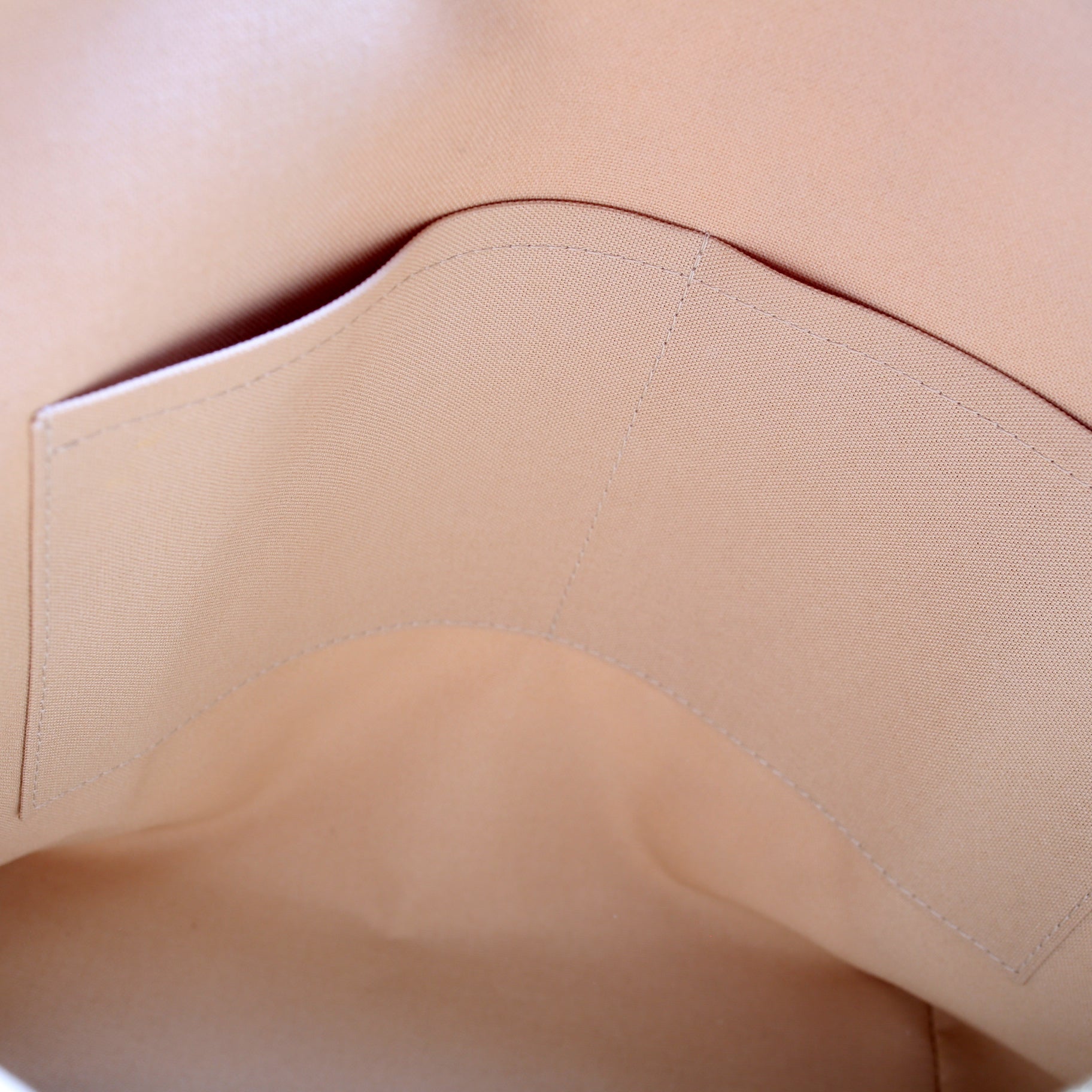 Exterior: The exterior coated canvas is free from any rips or cracks. The leather trim shows minimal discoloration throughout. The exterior features two open pockets.