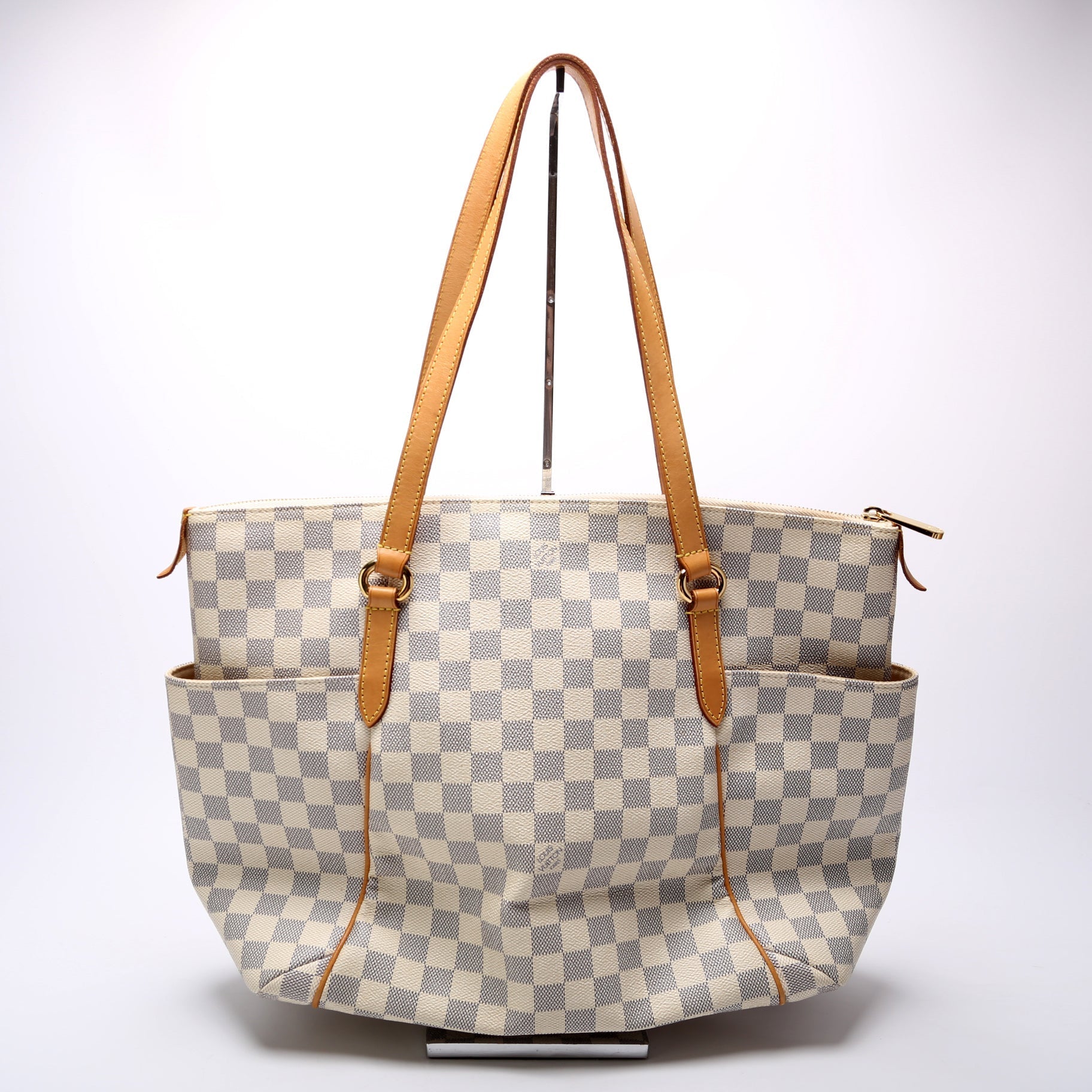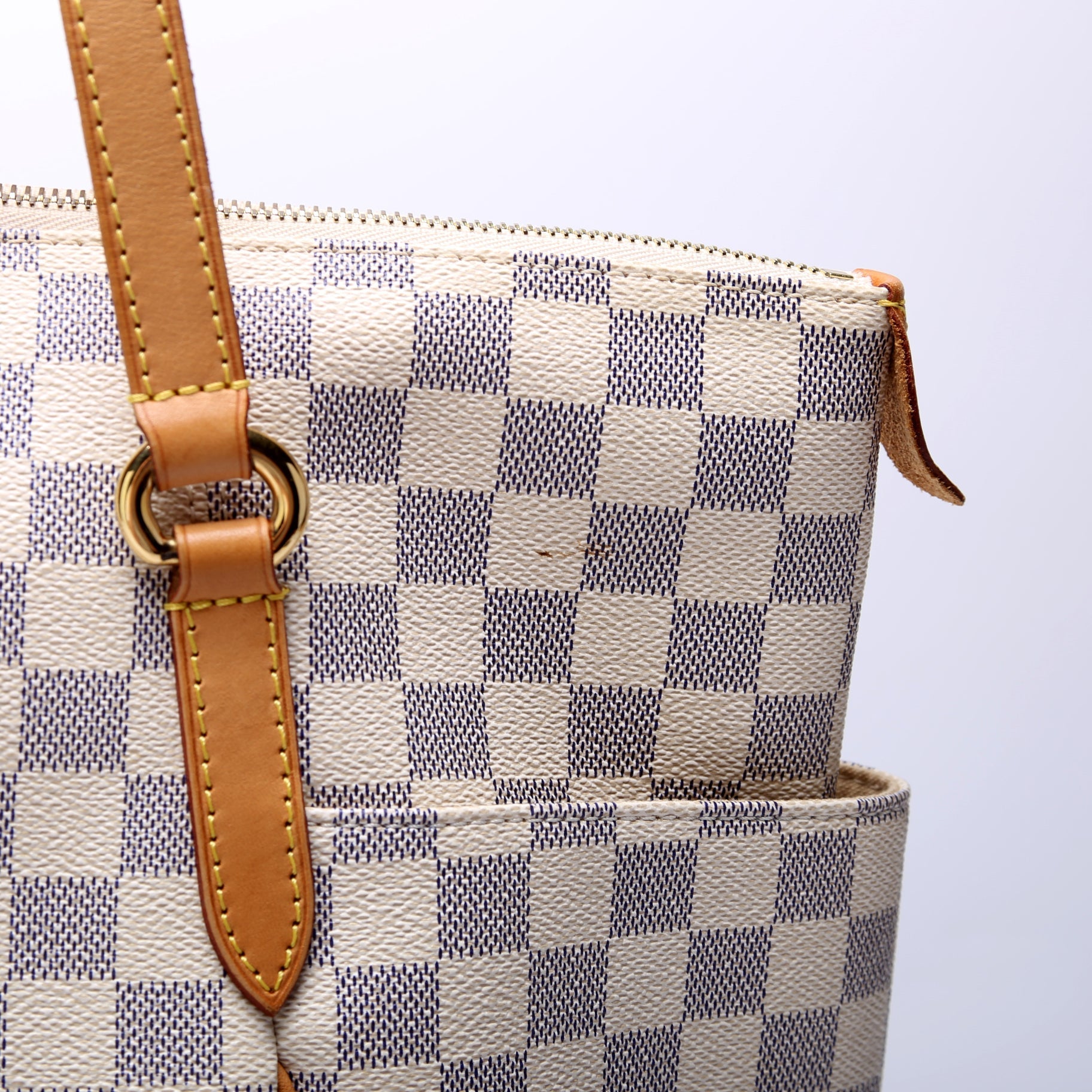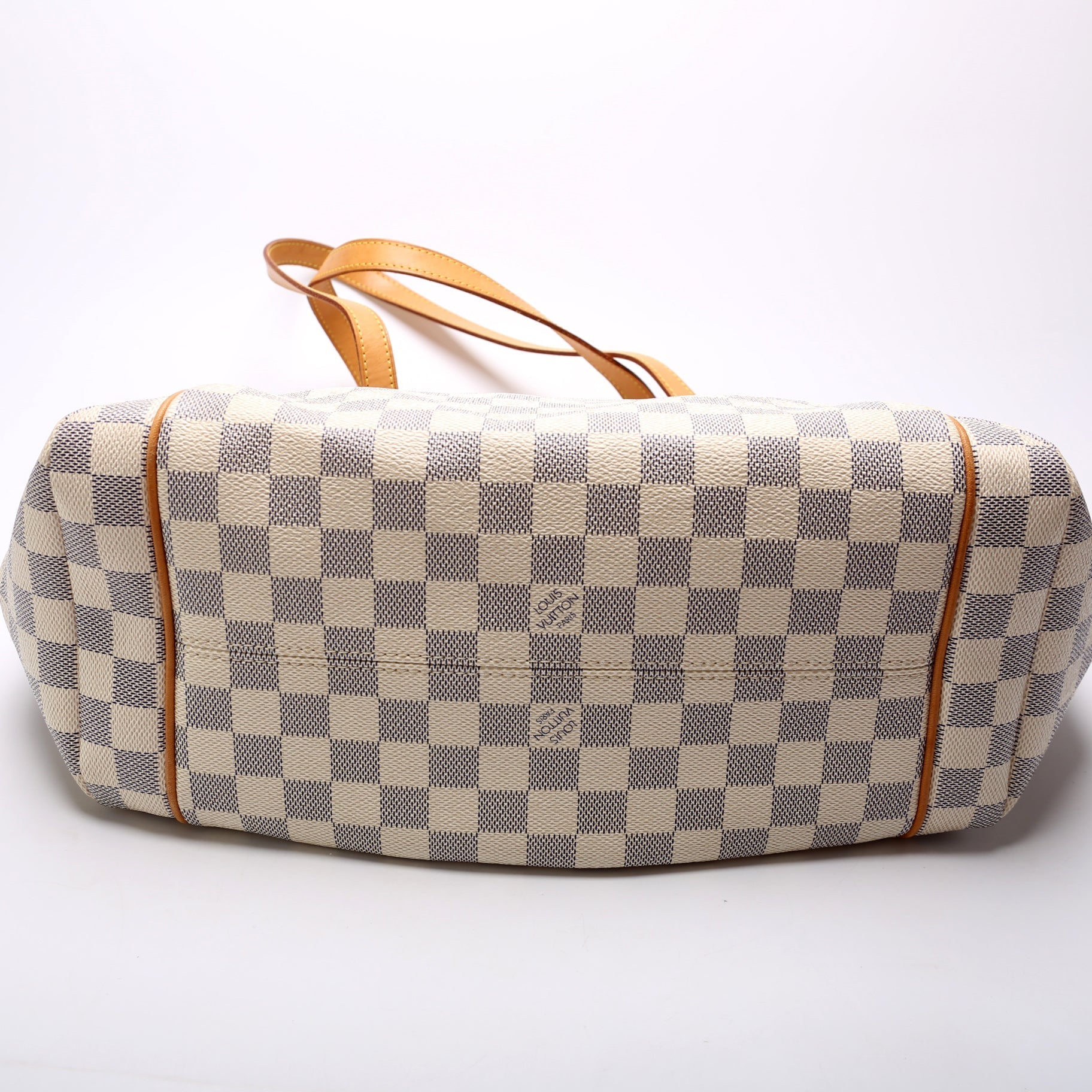 This Louis Vuitton Totally MMis eye catching bag. The exterior is in the classic Louis Vuitton Damier Azur coated canvas.