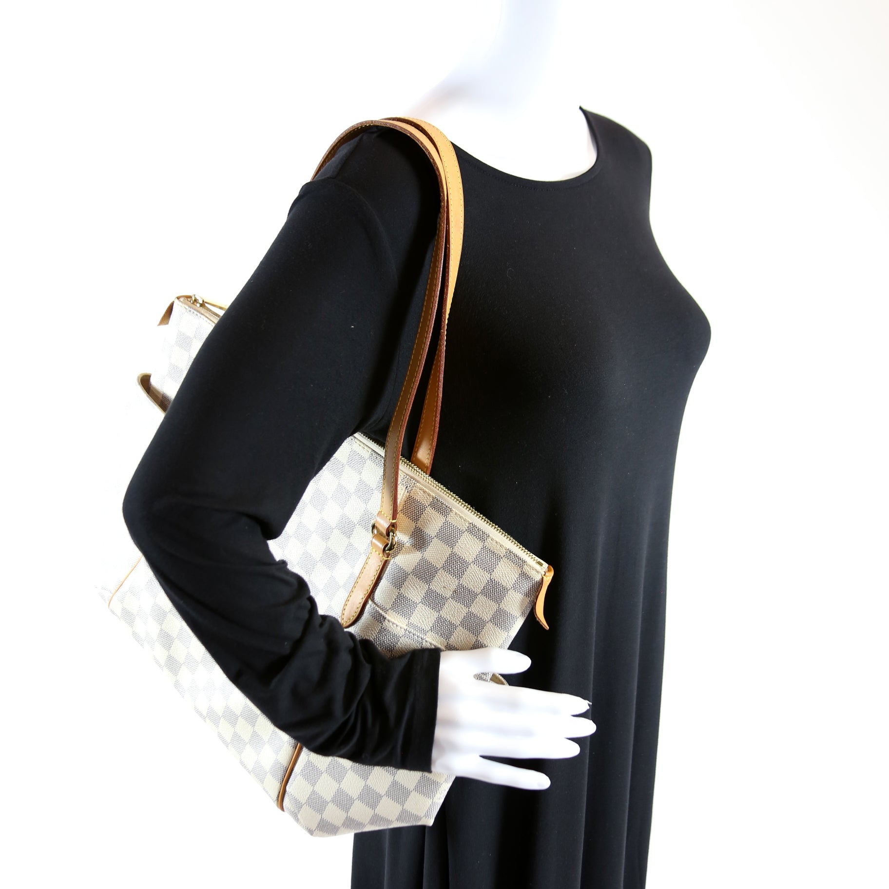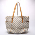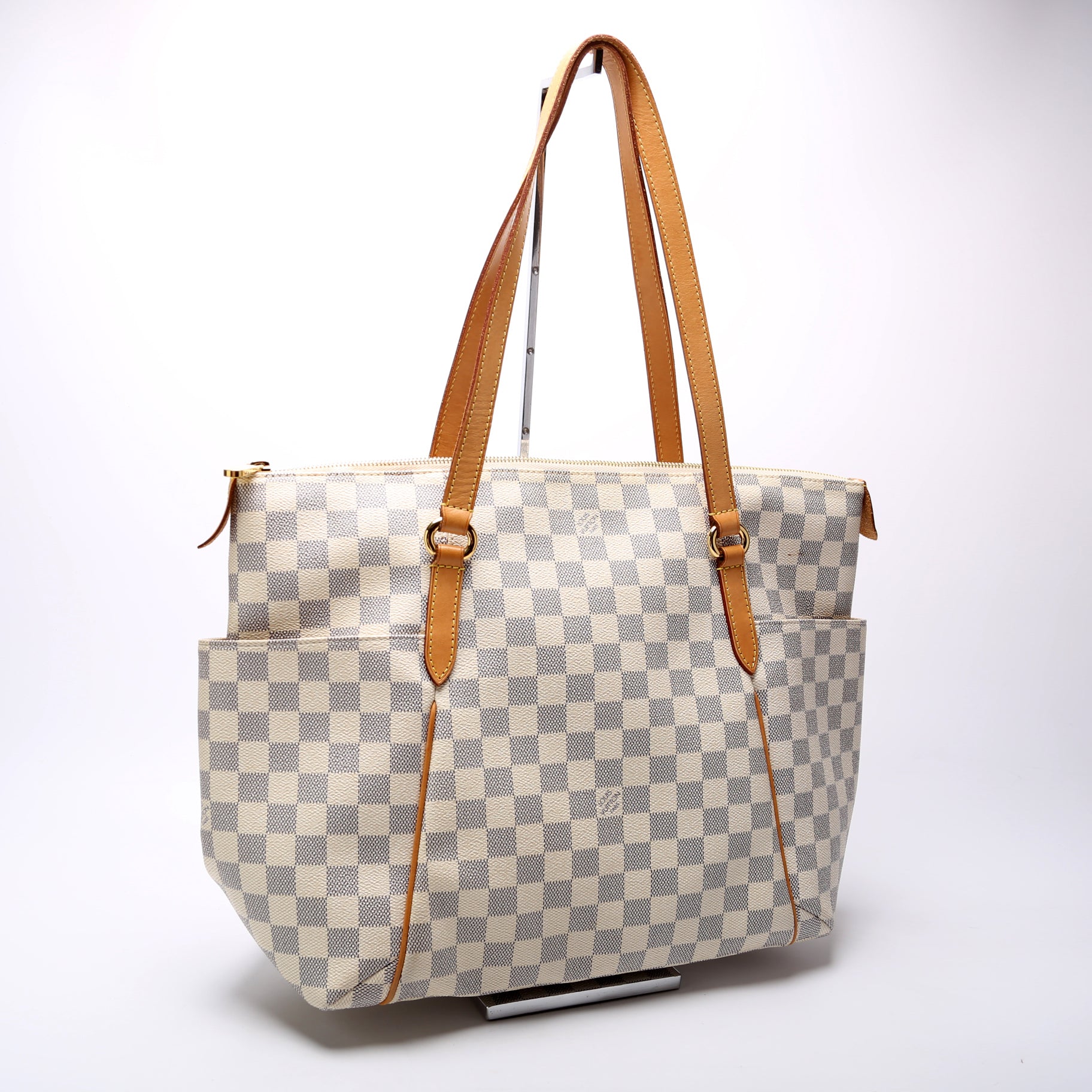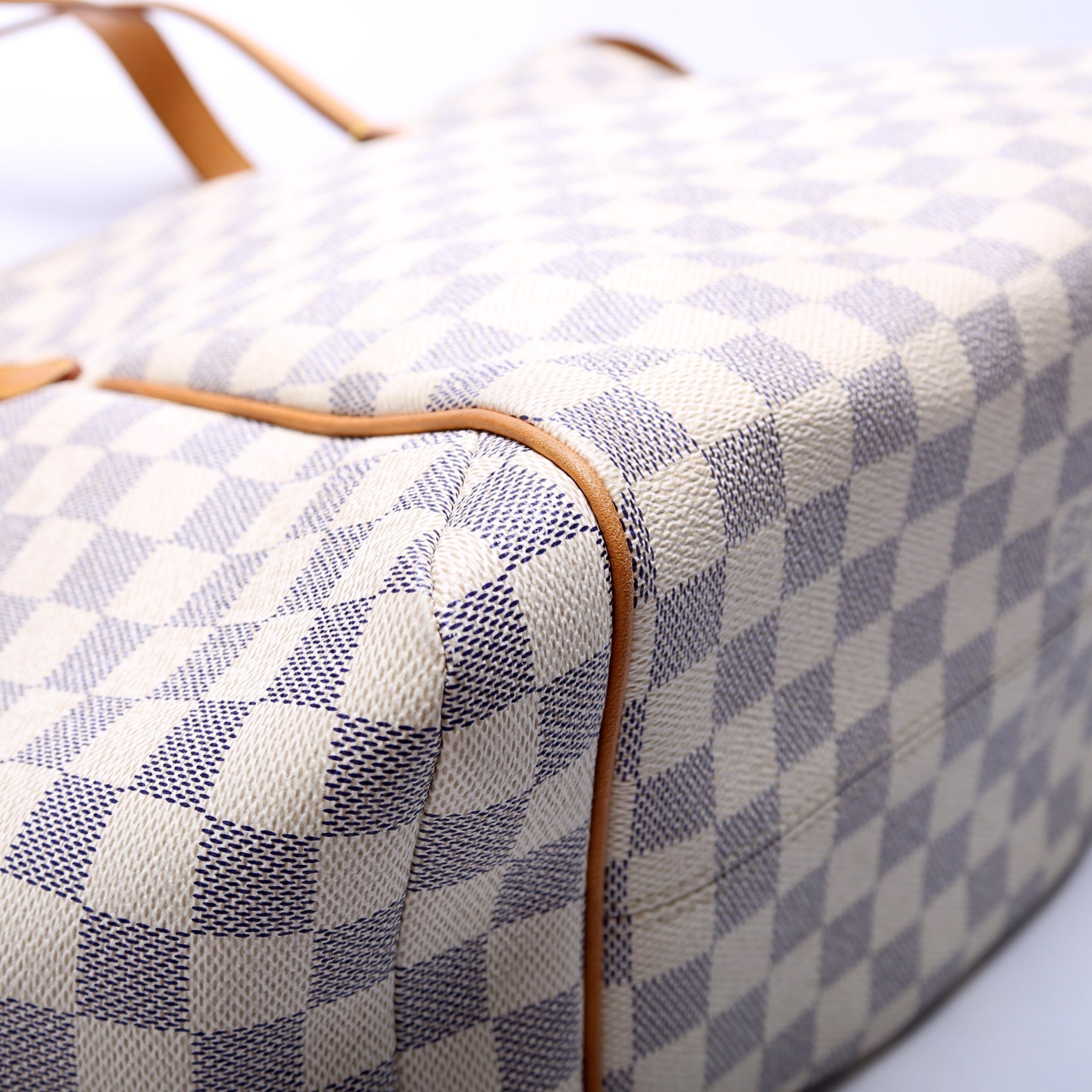 This Louis Vuitton Totally MMis eye catching bag. The exterior is in the classic Louis Vuitton Damier Azur coated canvas.