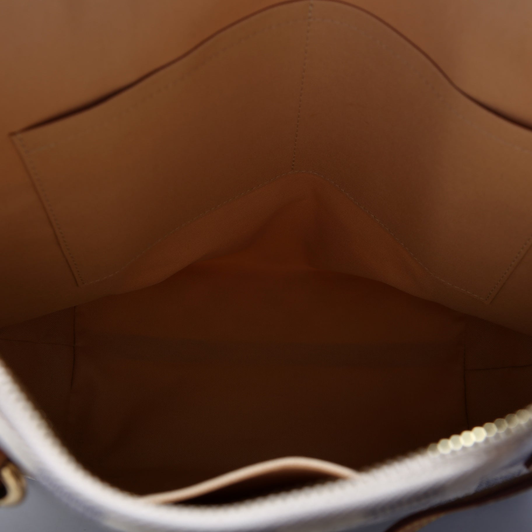 Exterior: The exterior coated canvas is free from any rips or cracks, there are light marks throughout. There is light discoloration throughout the coated canvas. The corners show light wear. The exterior features two open pockets. The leather trim shows light wear and discoloration.