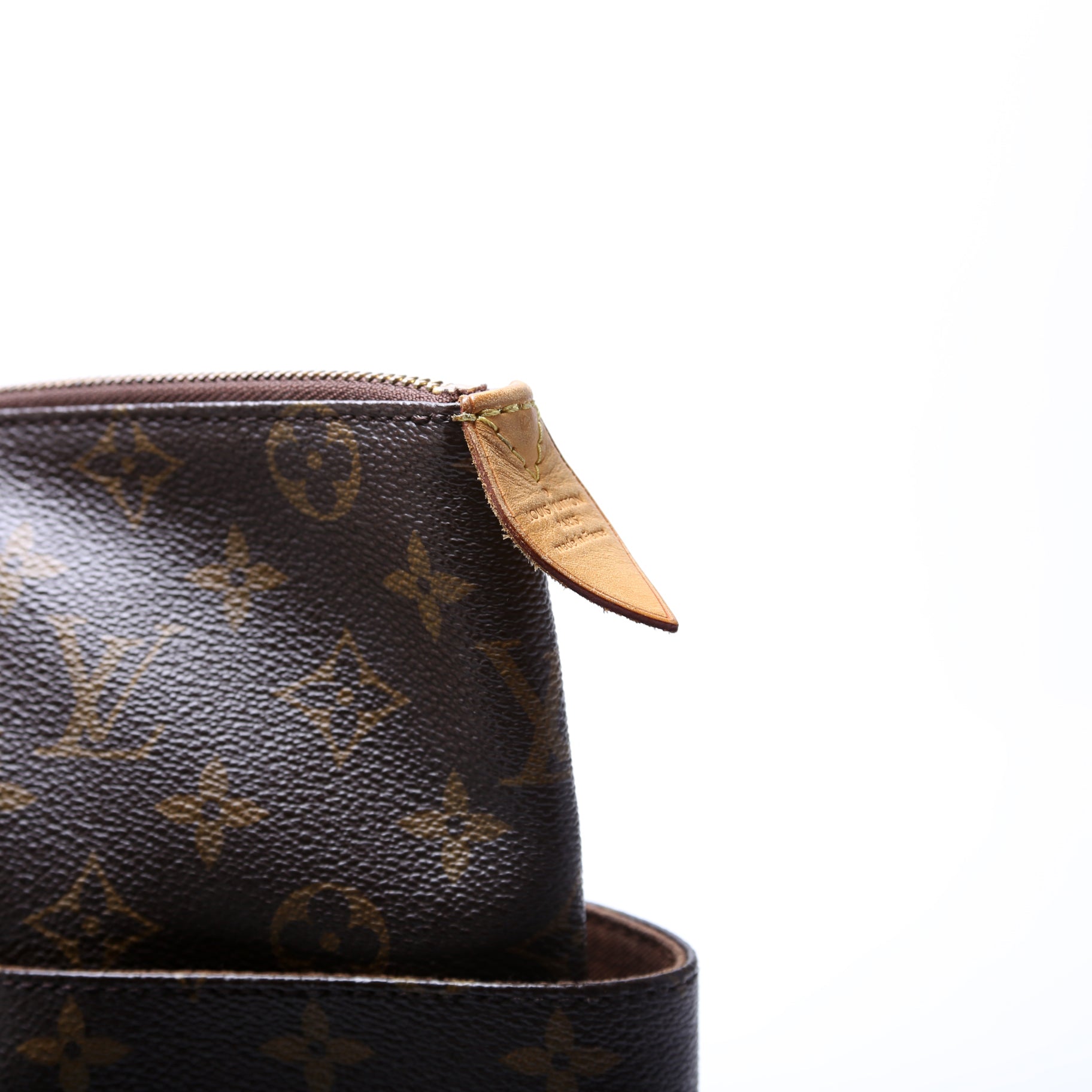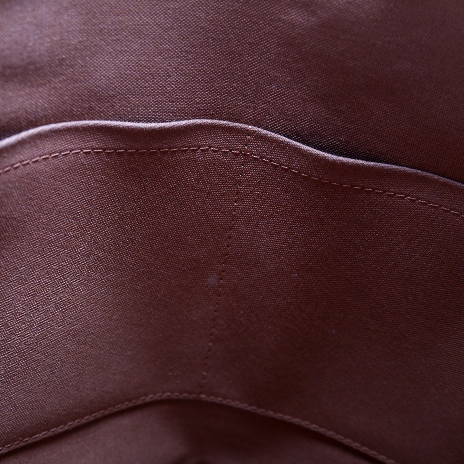 Exterior: The exterior coated canvas is free of any rips or cracks. The corners show minor rubbing. The leather trim shows minor wear and discoloration. The exterior features two open pockets.