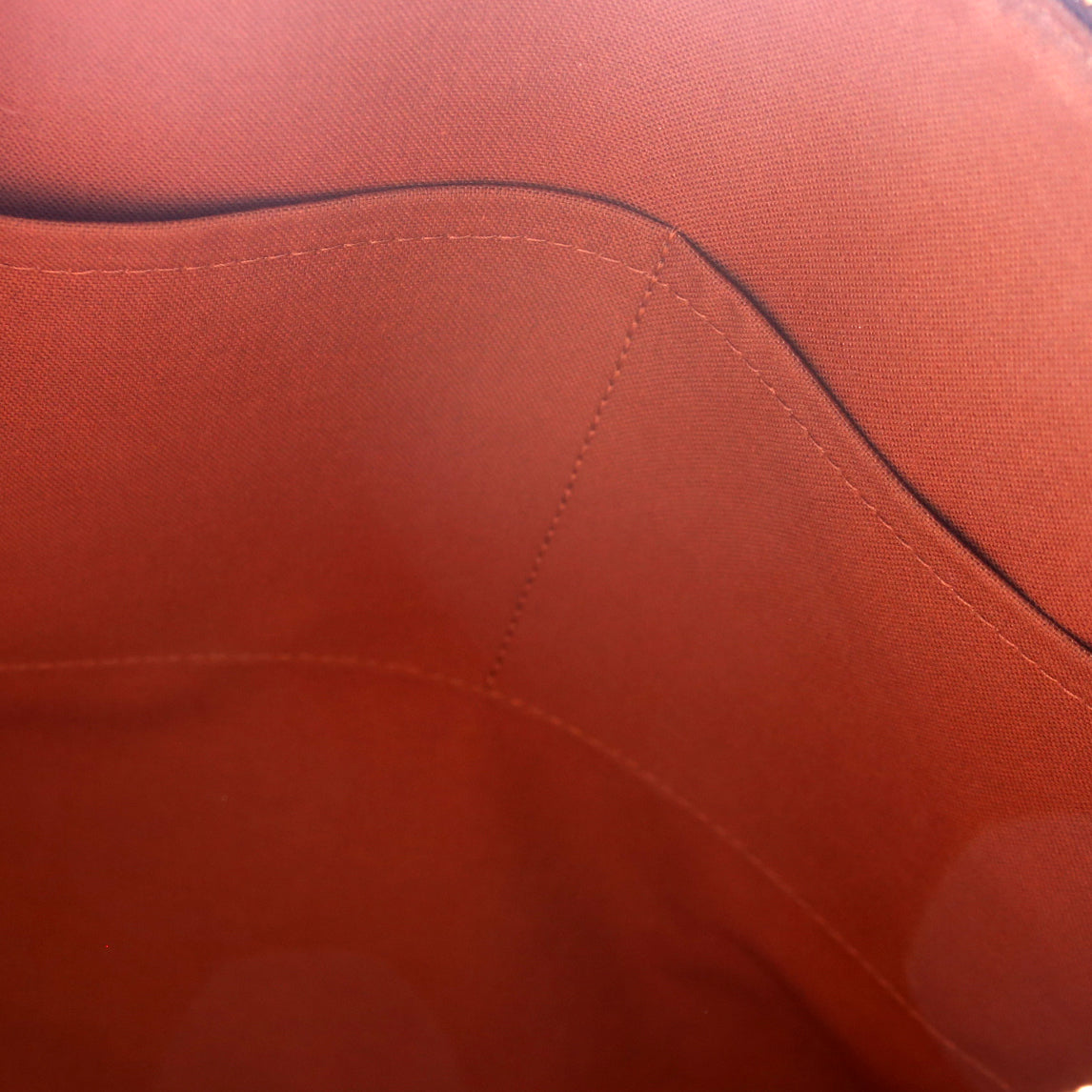 Exterior: The exterior coated canvas is free of any rips or cracks. The leather trim shows an even patina. The corners show light rubbing. The exterior features two open pockets.