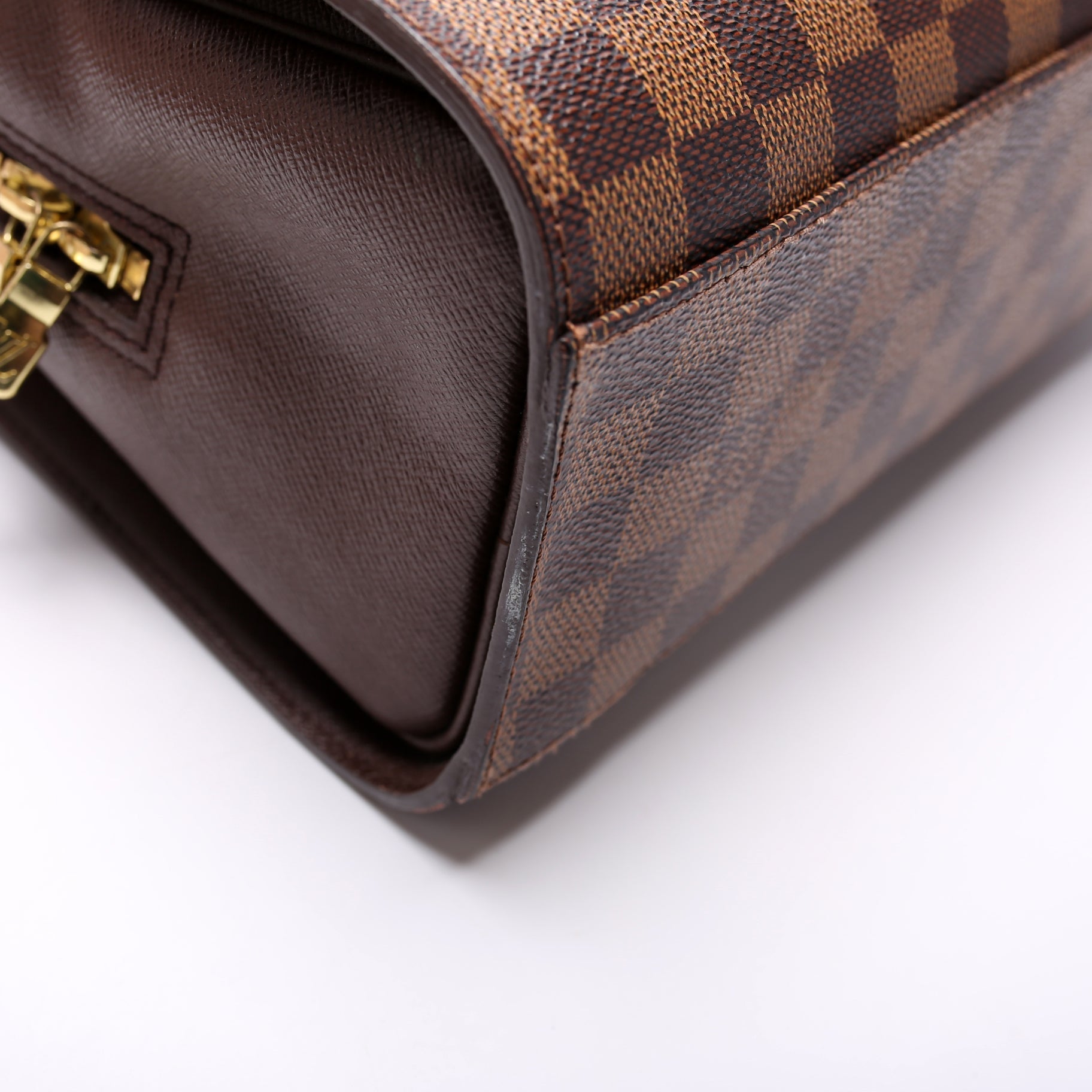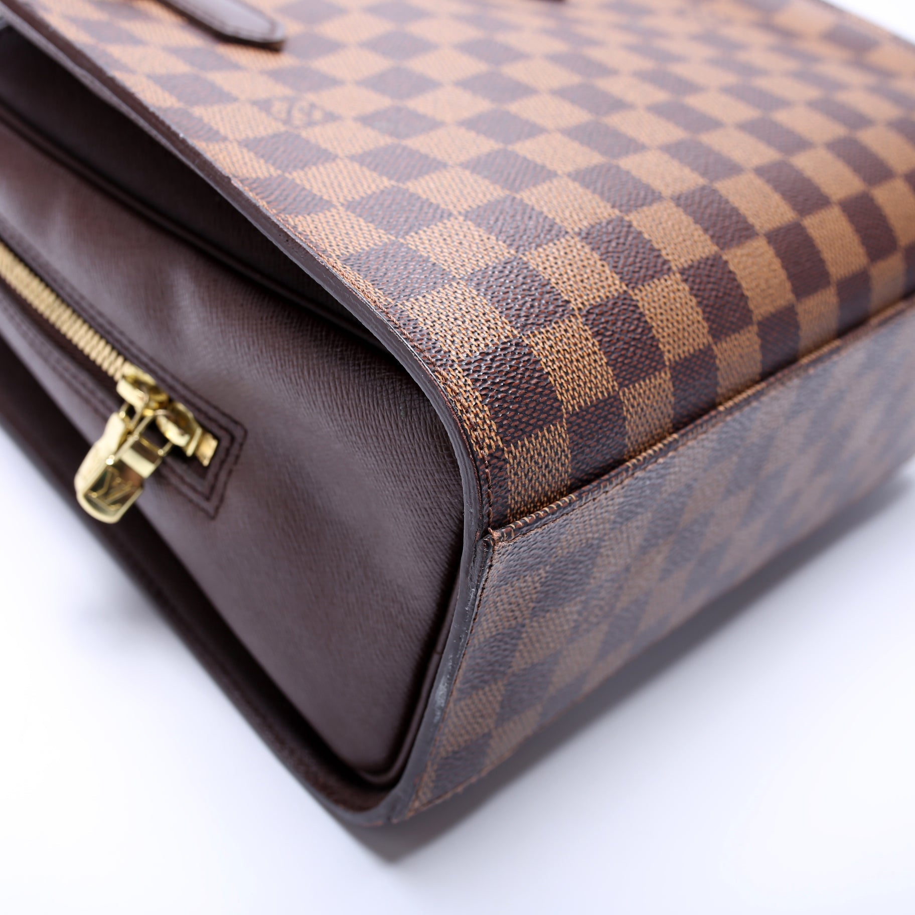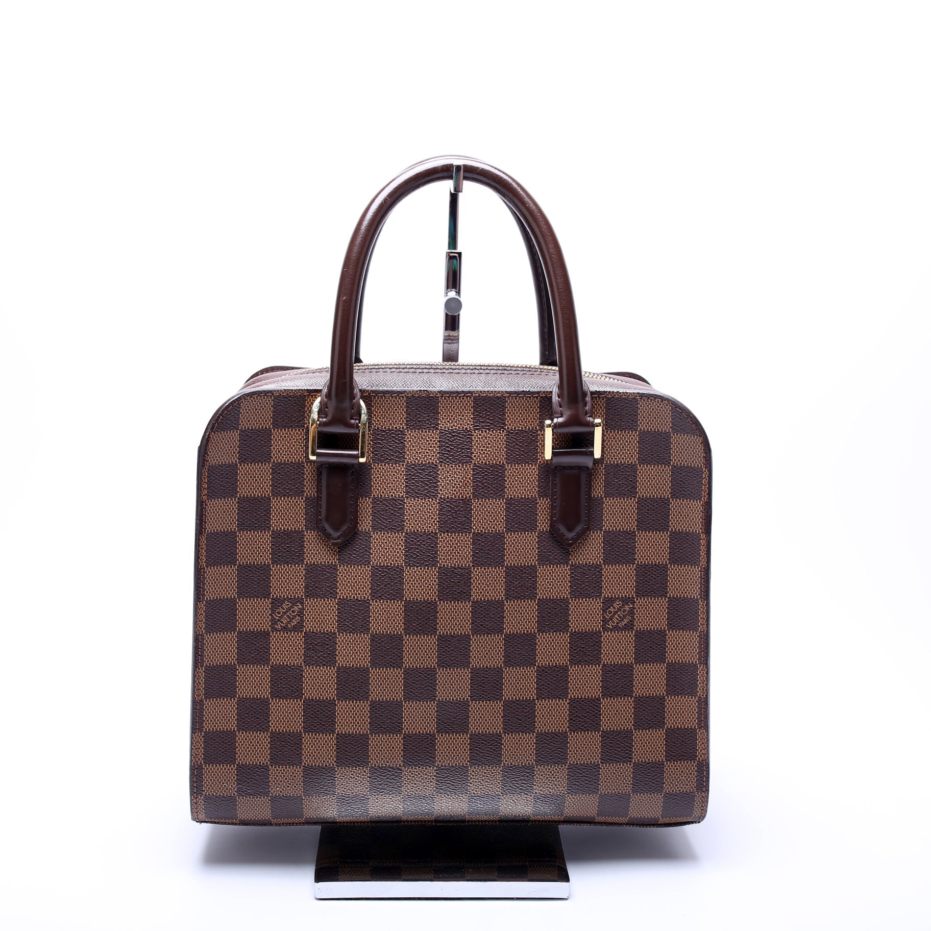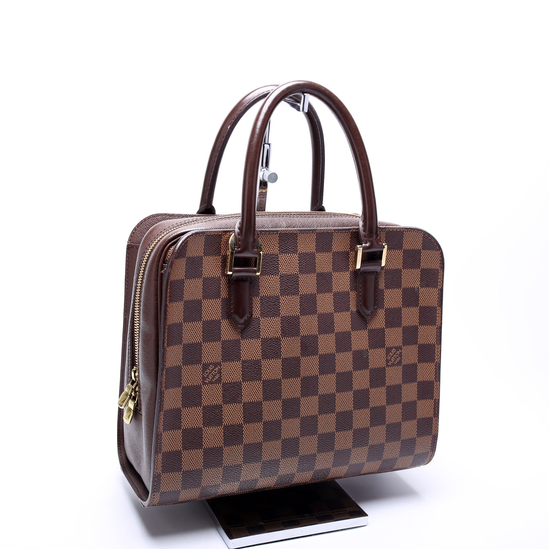 This Louis Vuitton Trianais eye catching bag. The exterior is in the classic Louis Vuitton Damier Ebene coated canvas.