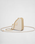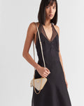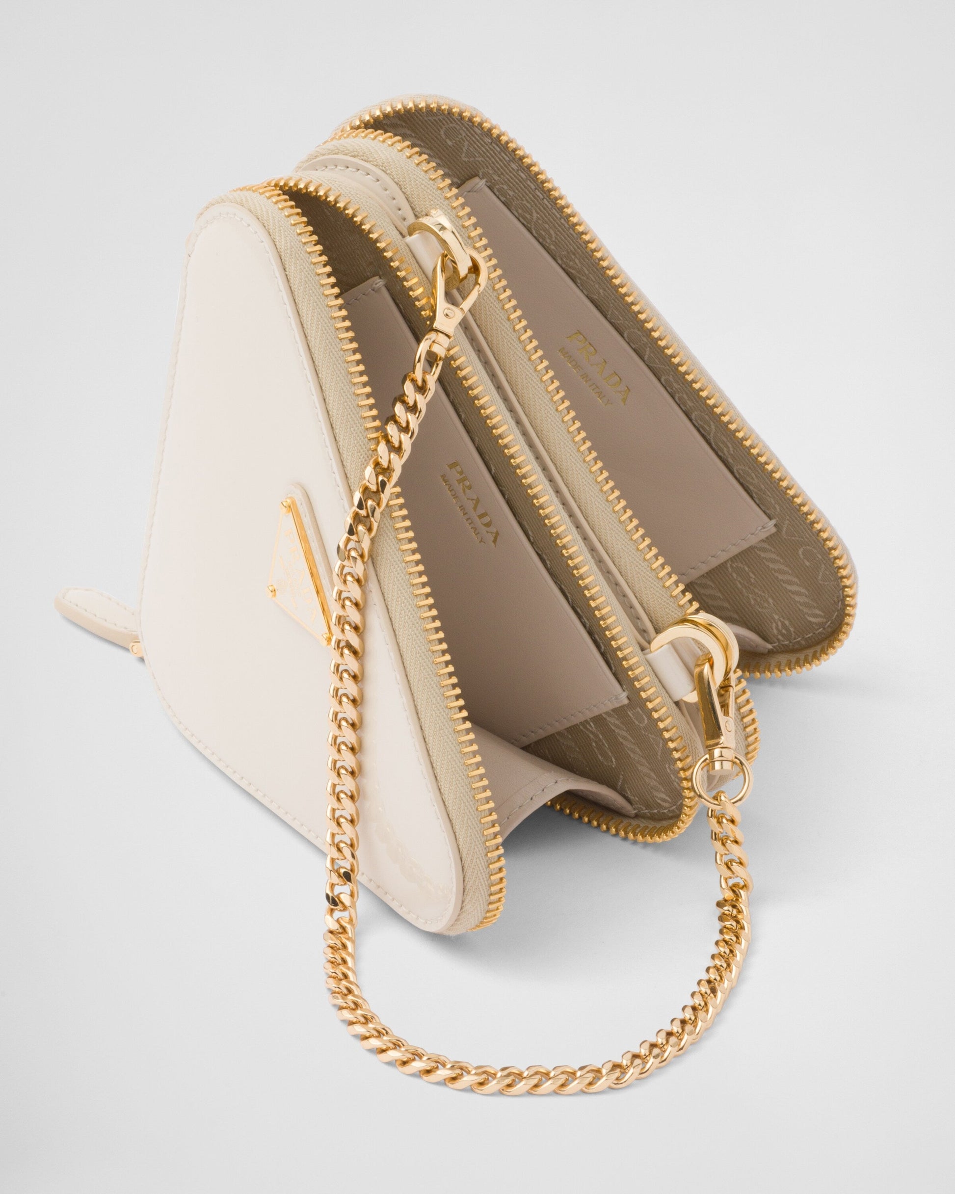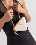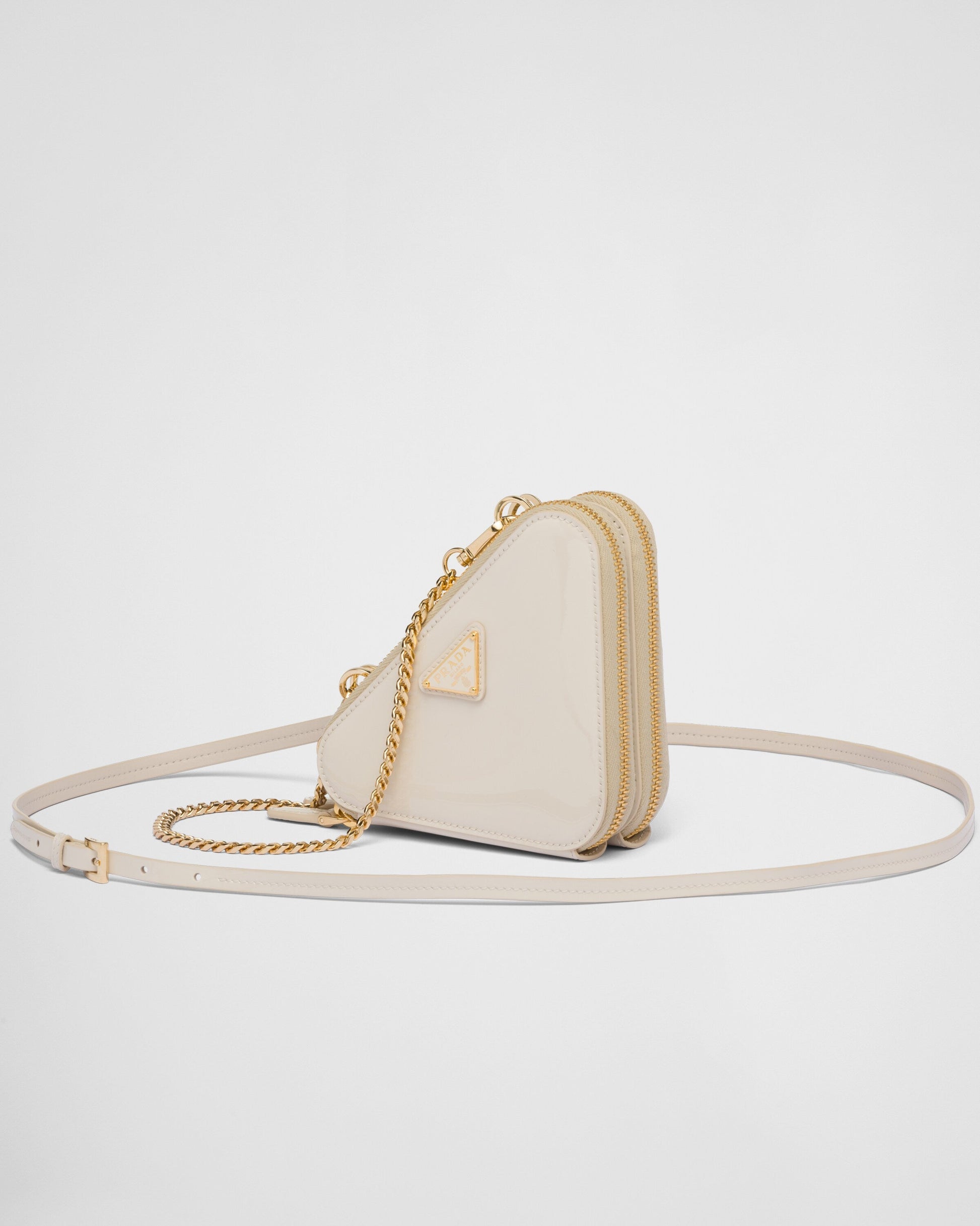 The triangle, an iconic hallmark of Prada collections, comes in a three-dimensional version in the shape of this patent leather mini pouch. The accessory with metal hardware synthesizes the brand's stylistic codes in an elegant and versatile design with removable shoulder strap and chain handle. The enameled metal triangle logo completes the look with a distinctive note.