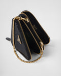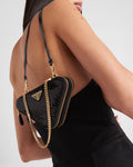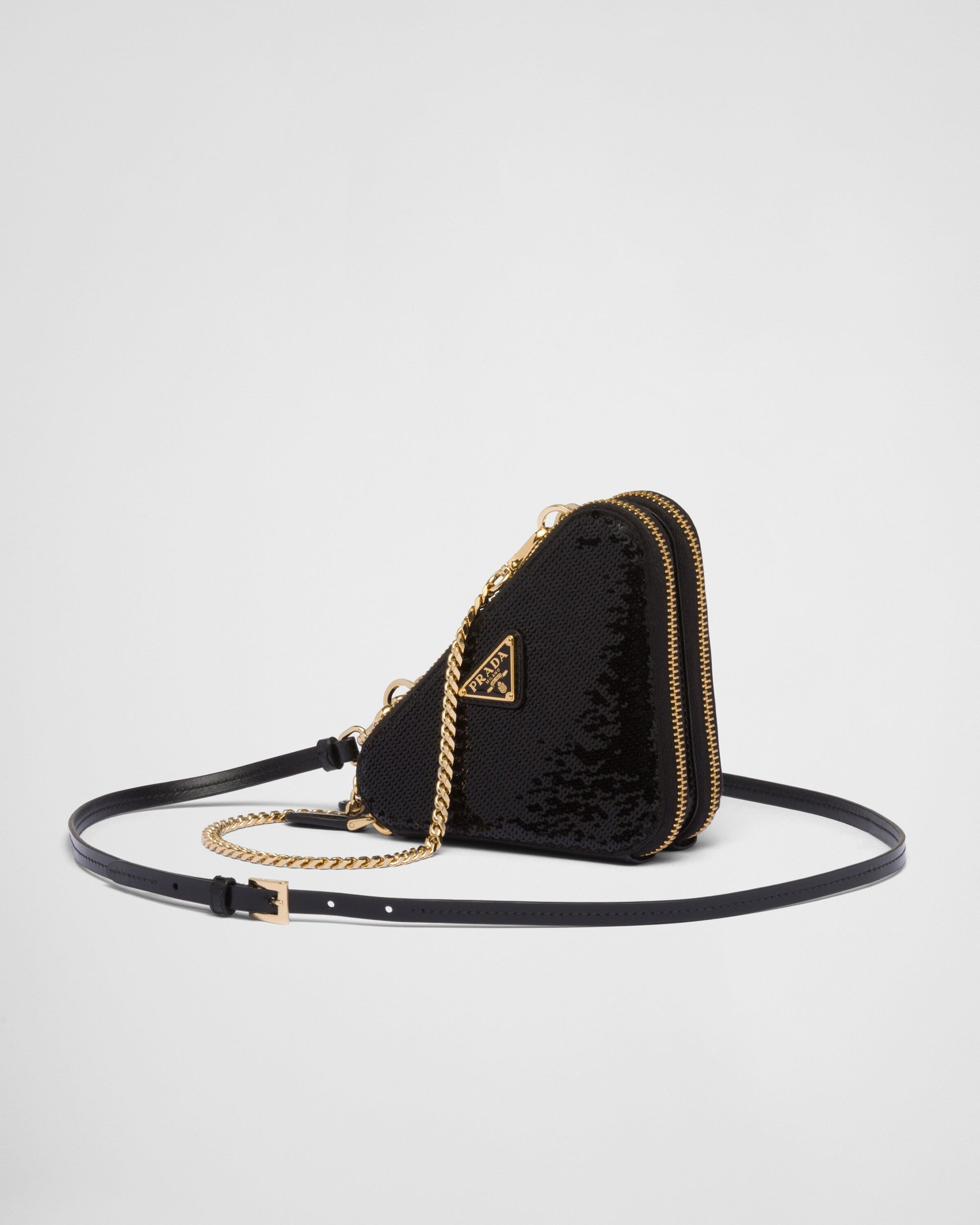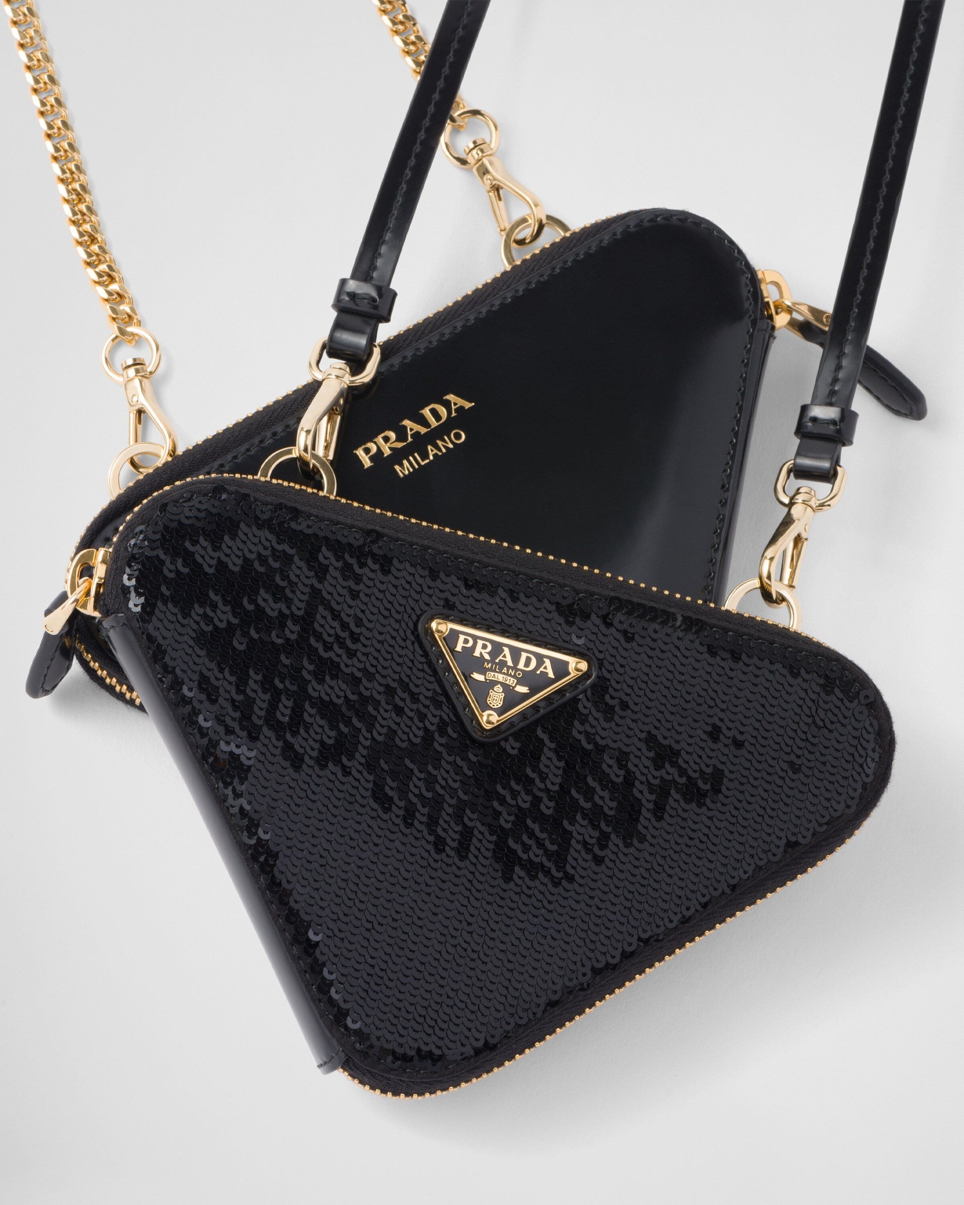The triangle, an iconic hallmark of Prada collections, comes in a three-dimensional version in the geometric shape of this mini pouch. The accessory covered in tonal sequins and brightened by metal hardware synthesizes Prada's stylistic codes in this elegant, versatile design with removable shoulder strap and chain handle. The enameled metal triangle logo completes the look with a distinctive note.