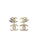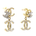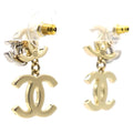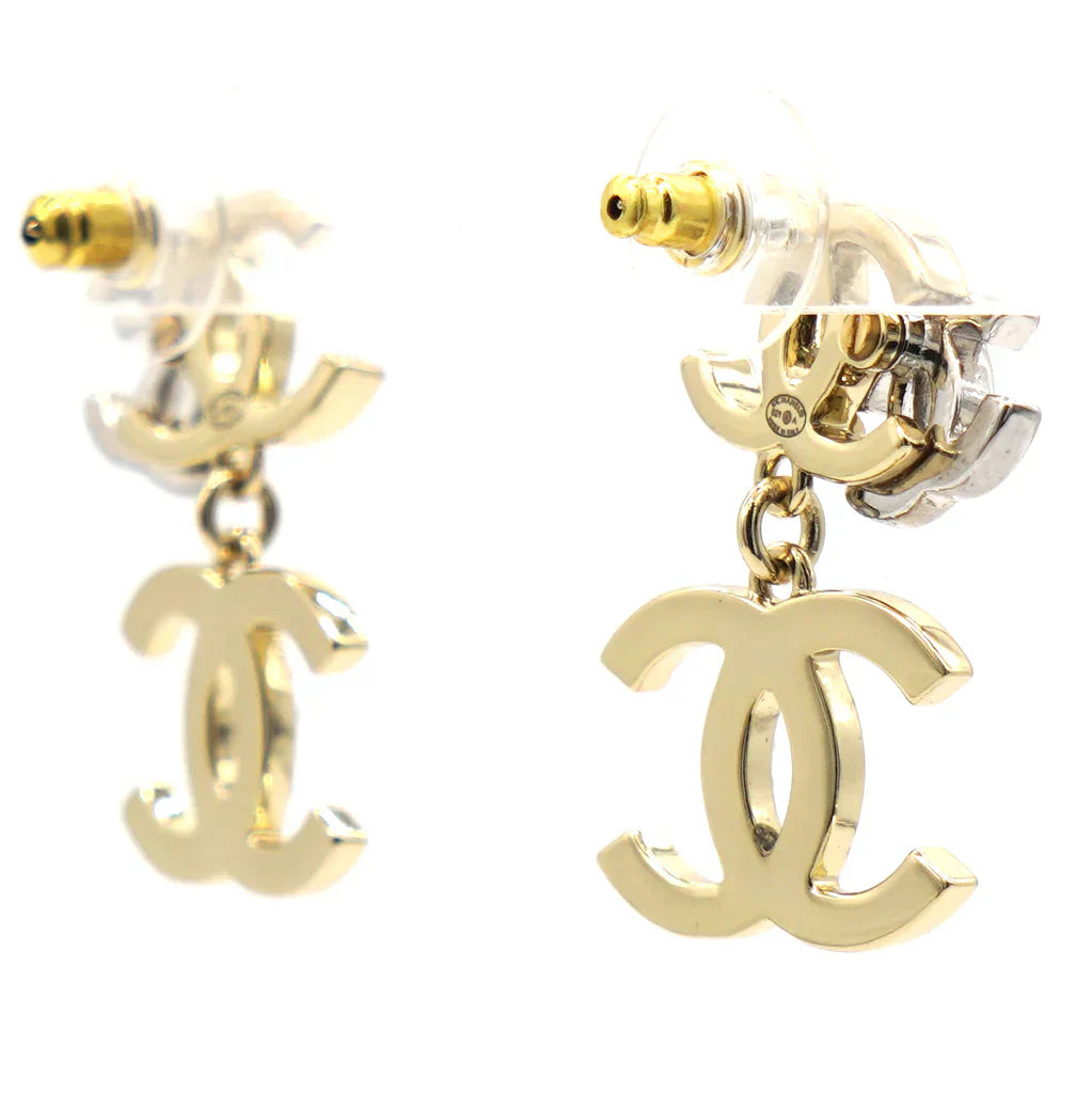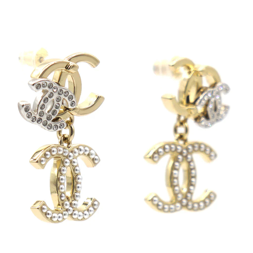 | The textured Chanel logo enhanced by a chic Triple CC logo in crystal and pearl design makes this pair of earrings an accessory to embrace the glamourous look. Crafted exquisitely with luxe champage gold-tone metal that impart a graceful élan to your look, these earrings can perfectly be paired with your evening gowns and dresses for that bit of bling. | Material: Gold color finish metal; Crystal Accessories: Serial Number:B21A Production Year:2021 | ![]() |