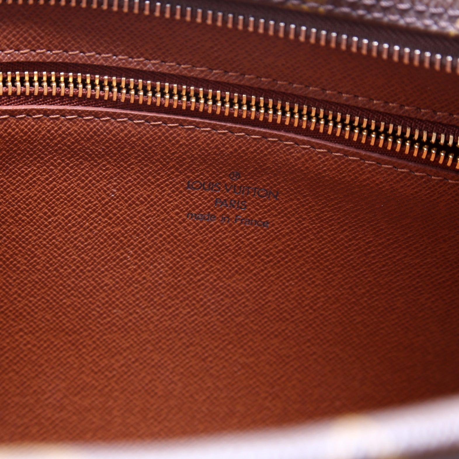 Interior: The interior shows a pen mark. The interior features one zip closure pocket.