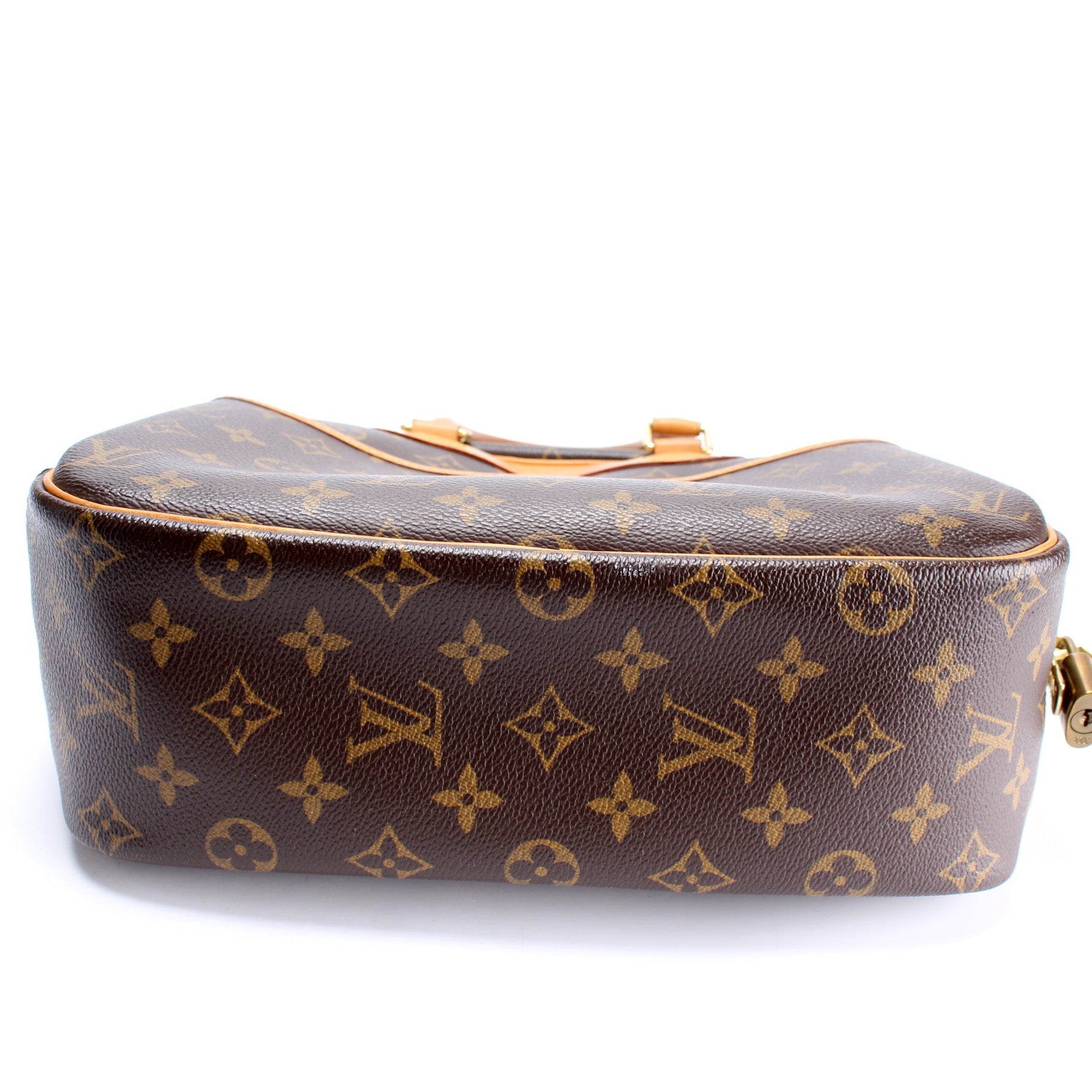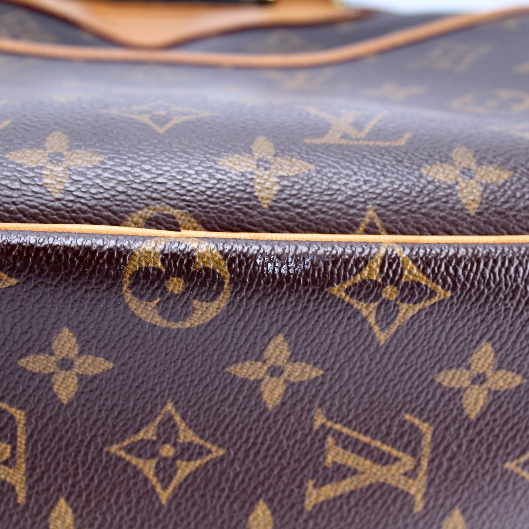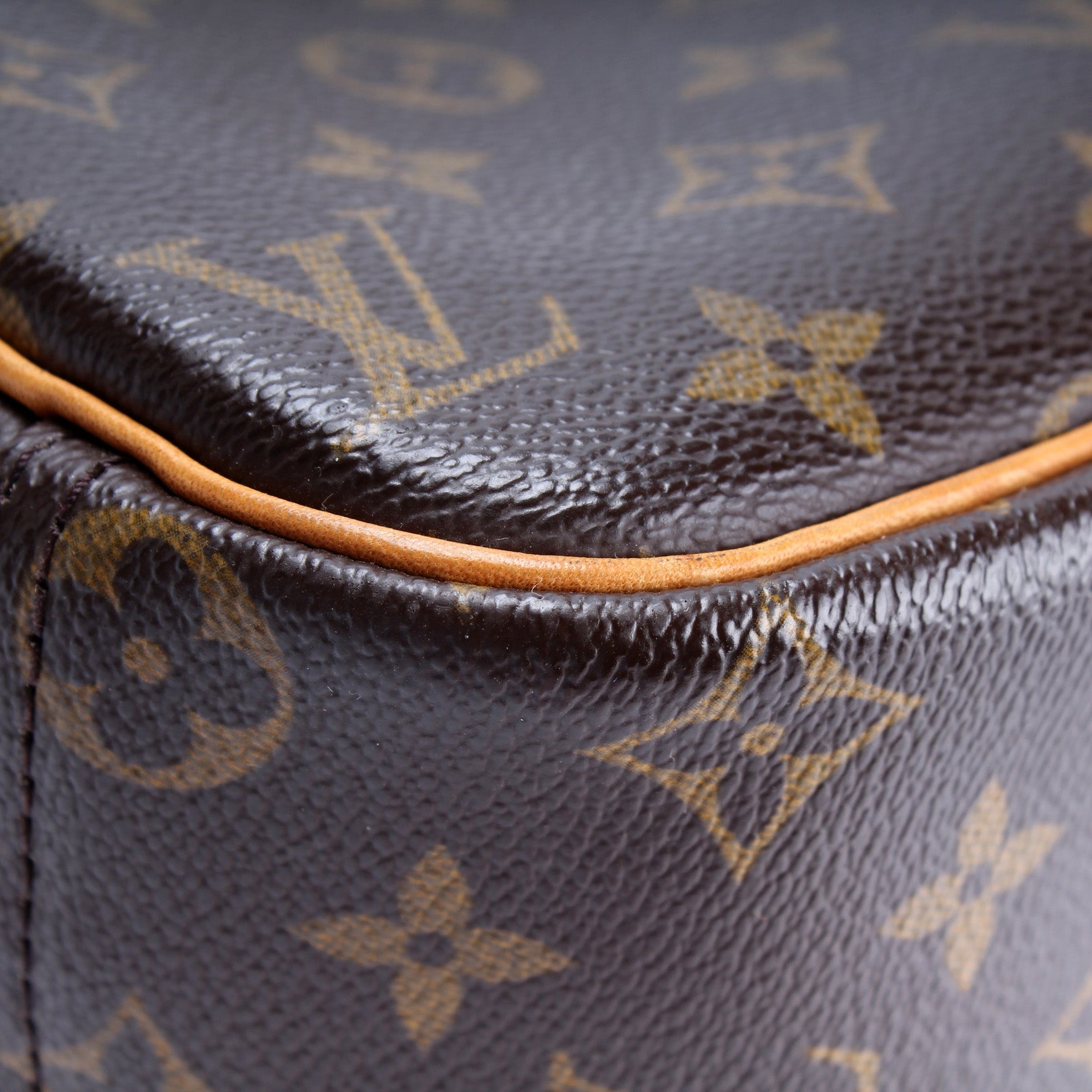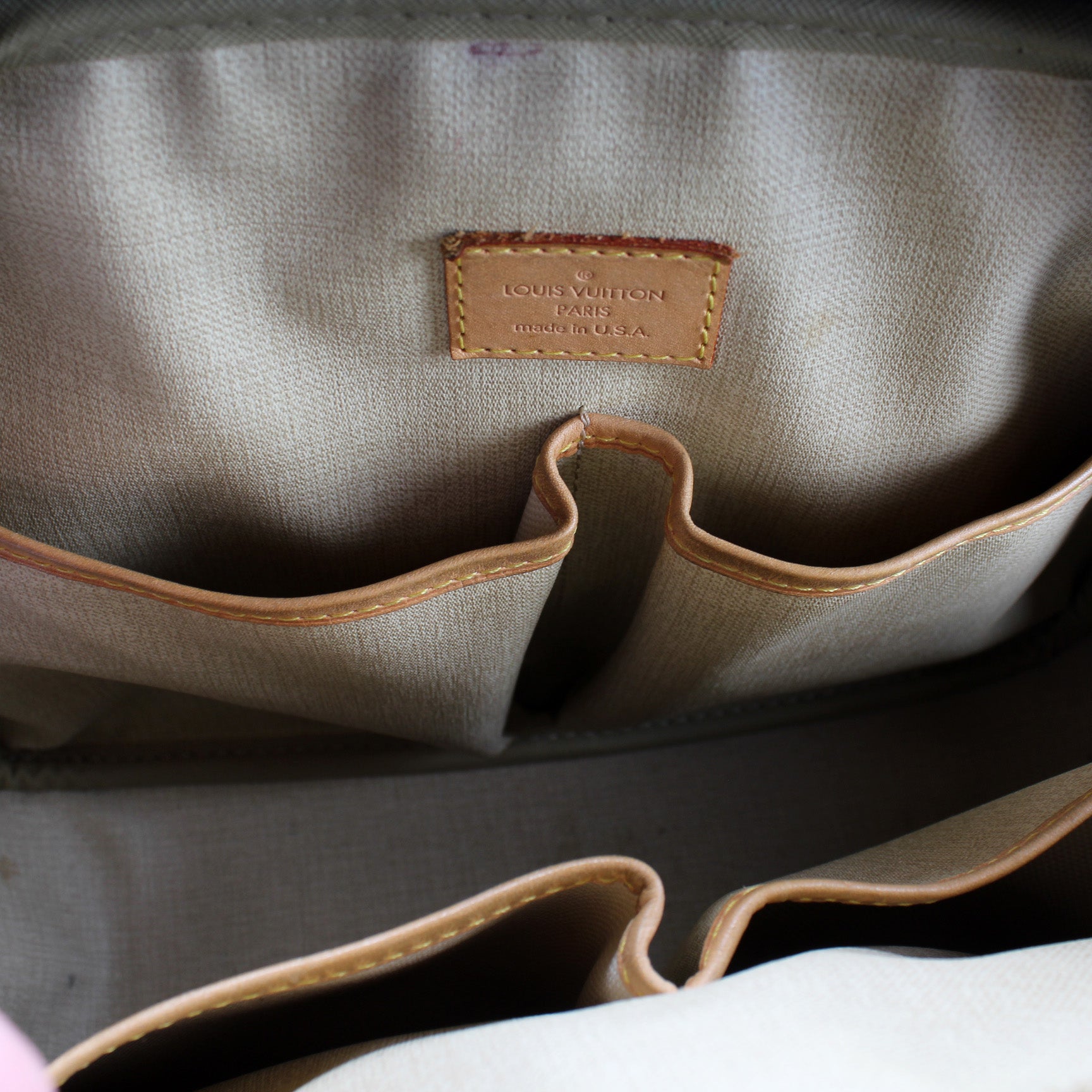 Exterior: The exterior Monogram coated canvas is free of rips or tears. The corners and leather details show minor signs of wear. The exterior includes one front open pocket.