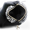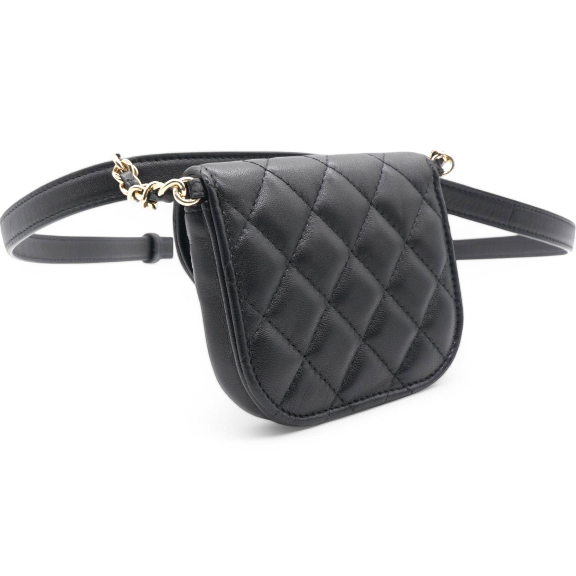 | This stylish waist bag is finely crafted of diamond quilted black lambskin leather and features a removable black and white tweed pouch. The bag features light gold hardware and leather waist strap with an adjustable buckle. The bag opens with a gold CC turn lock to a fabric interior along with the zipper on the coin purse. | Material: Leather/ Tweed Lining: Textile Hardware: Gold color finish metal Accessories: Serial Number: 28715037 Production Year: 2019 | ![]() |