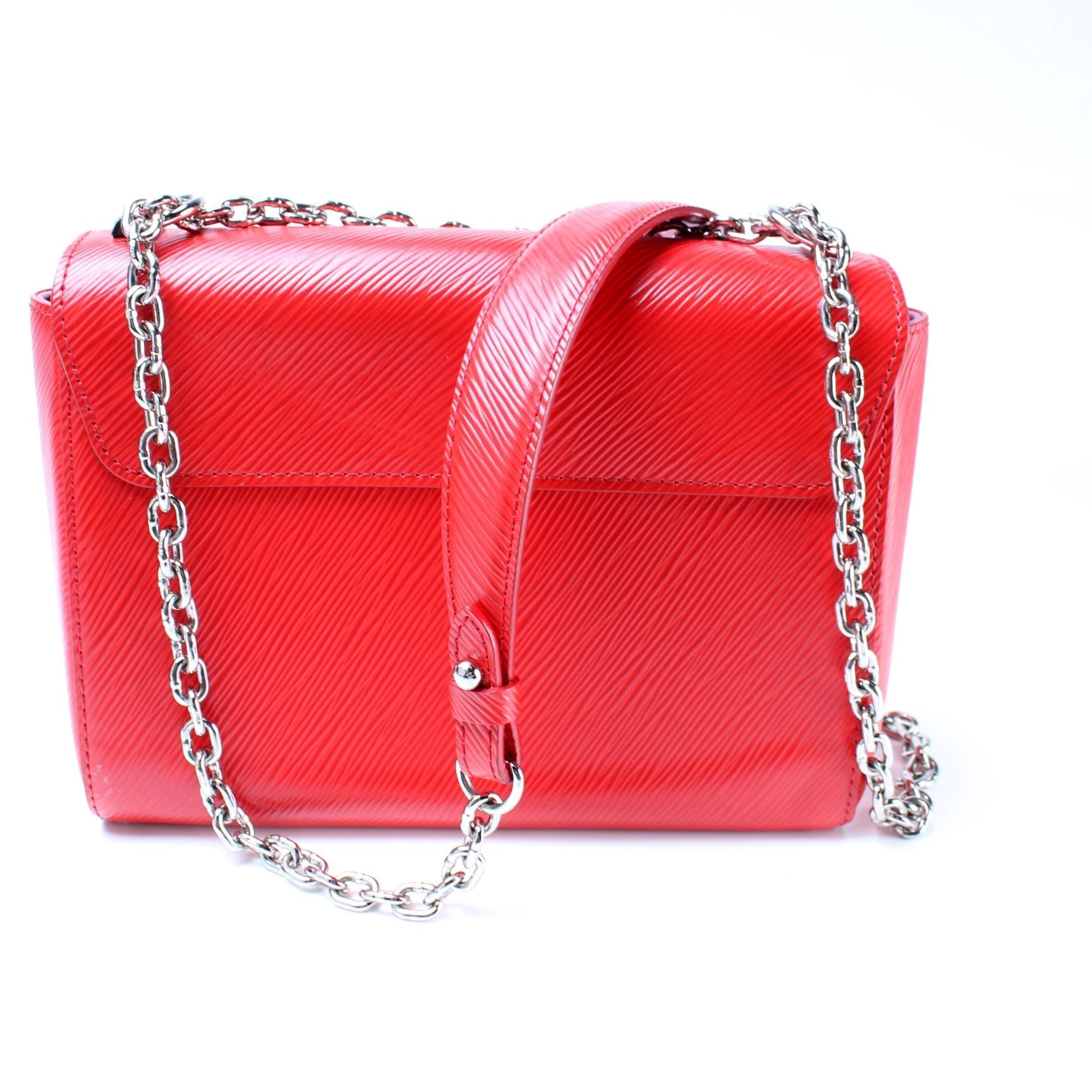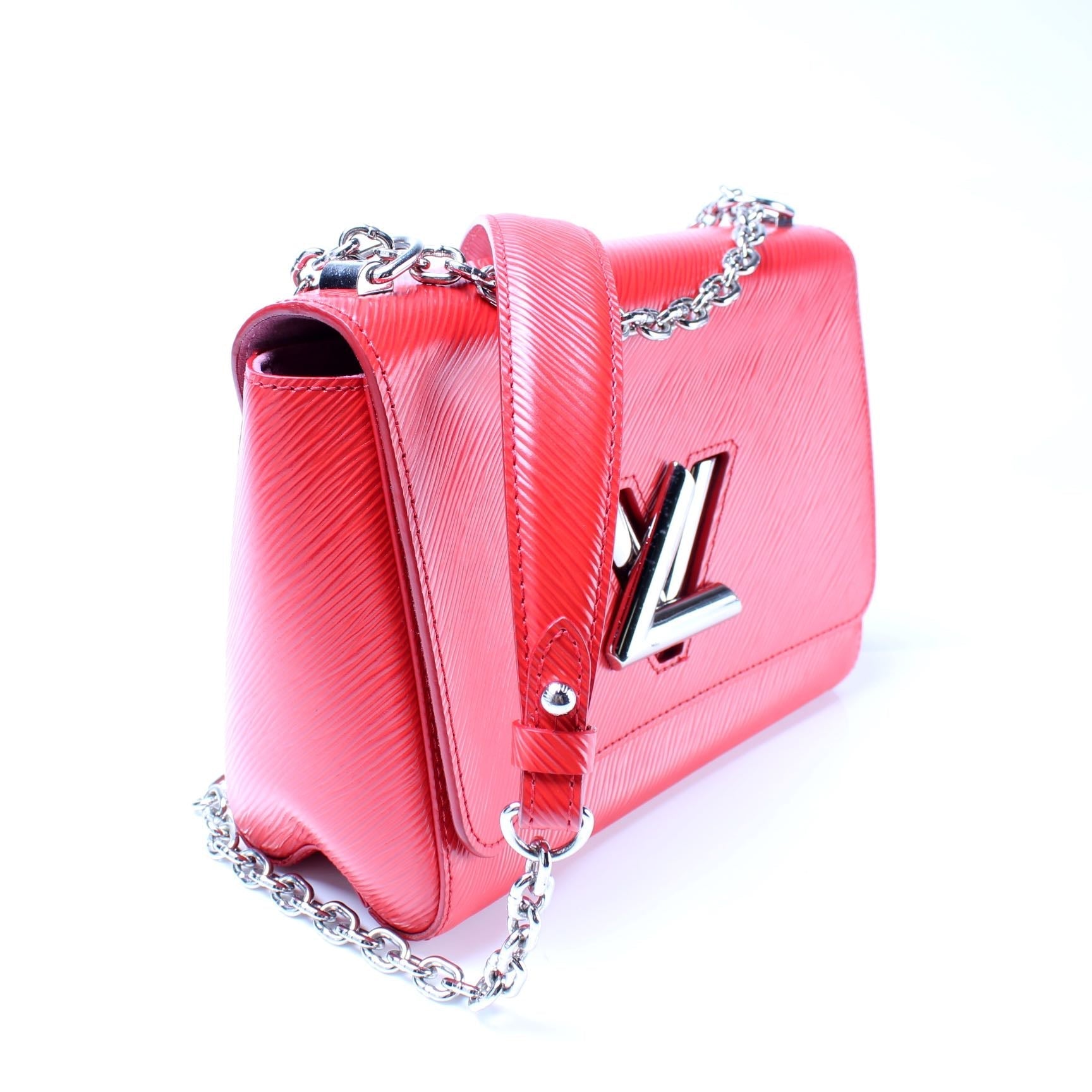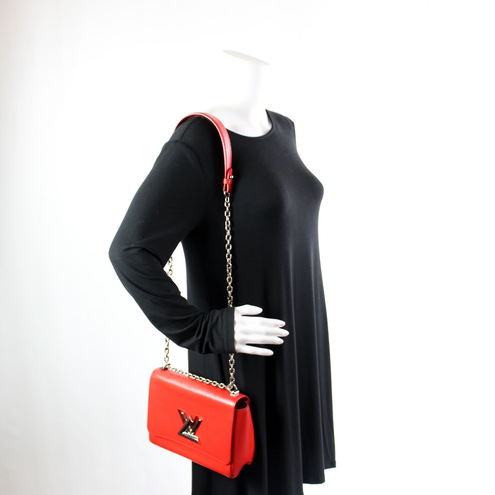 This Louis Vuitton Twist MMis eye catching bag. The exterior is in the classic Louis Vuitton Epi leather coated canvas.
