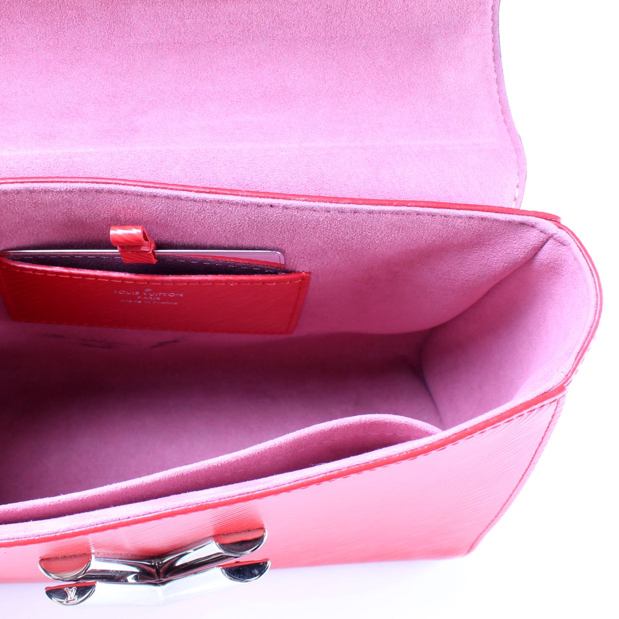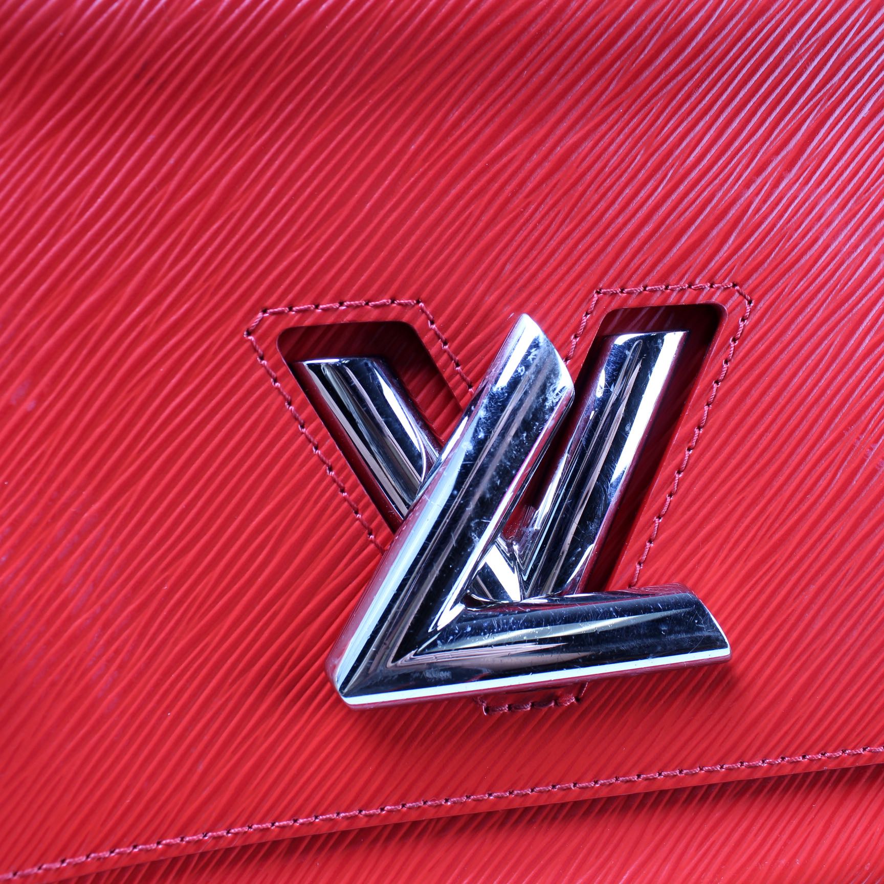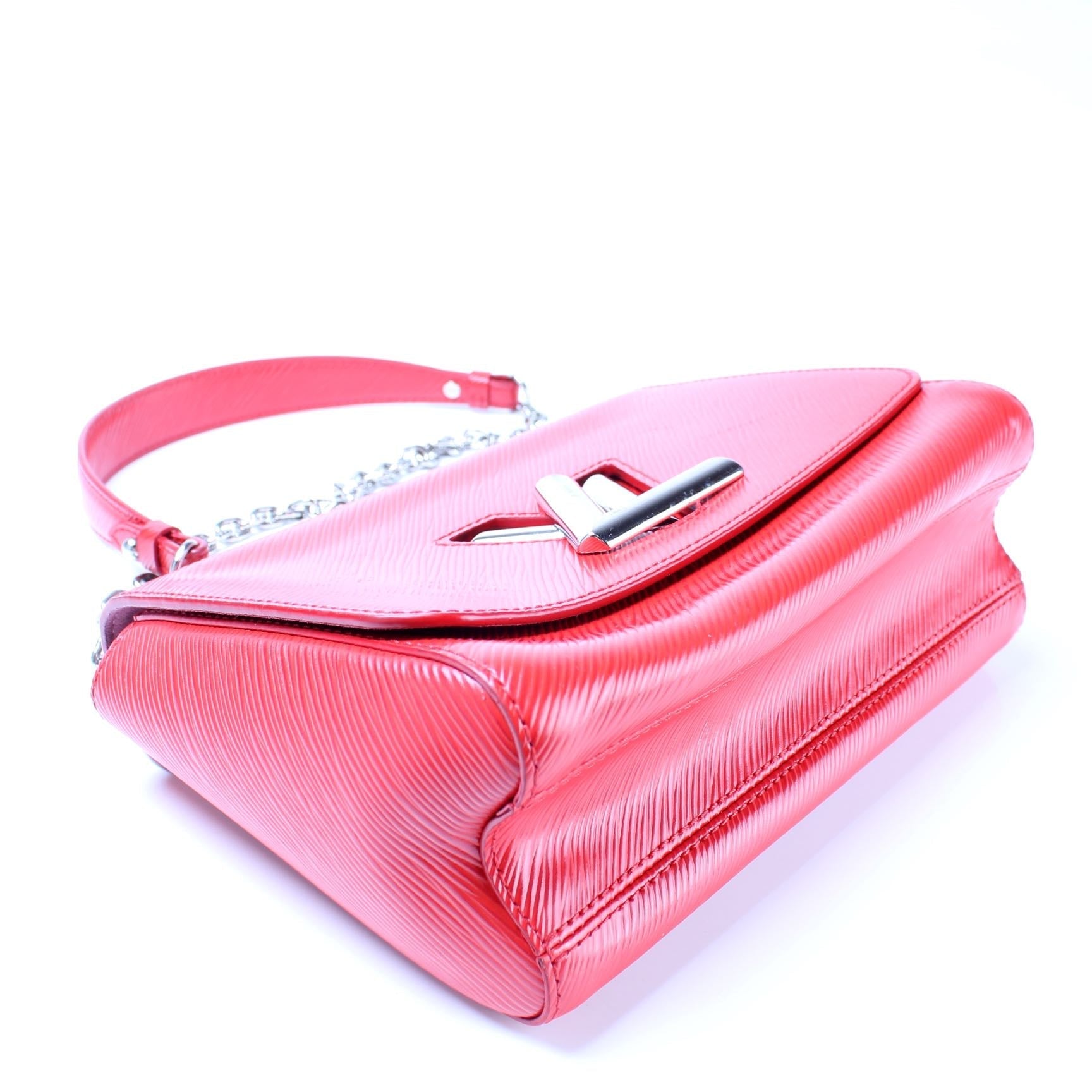 This Louis Vuitton Twist MMis eye catching bag. The exterior is in the classic Louis Vuitton Epi leather coated canvas.