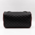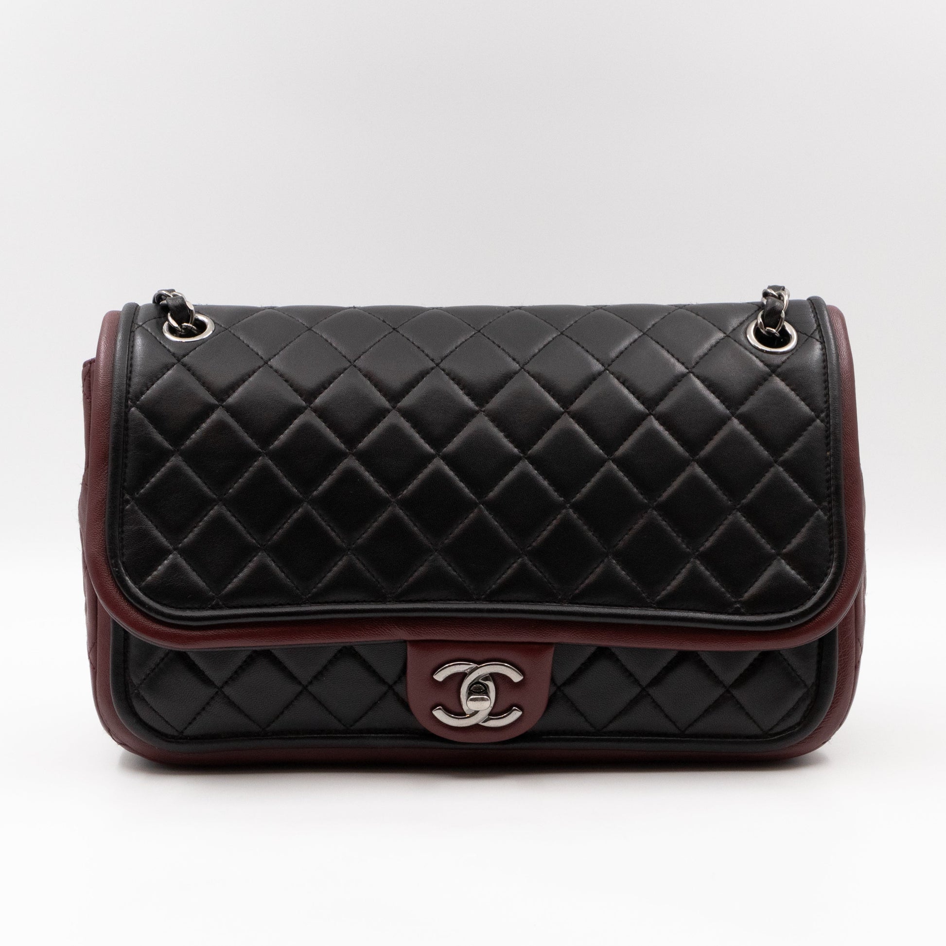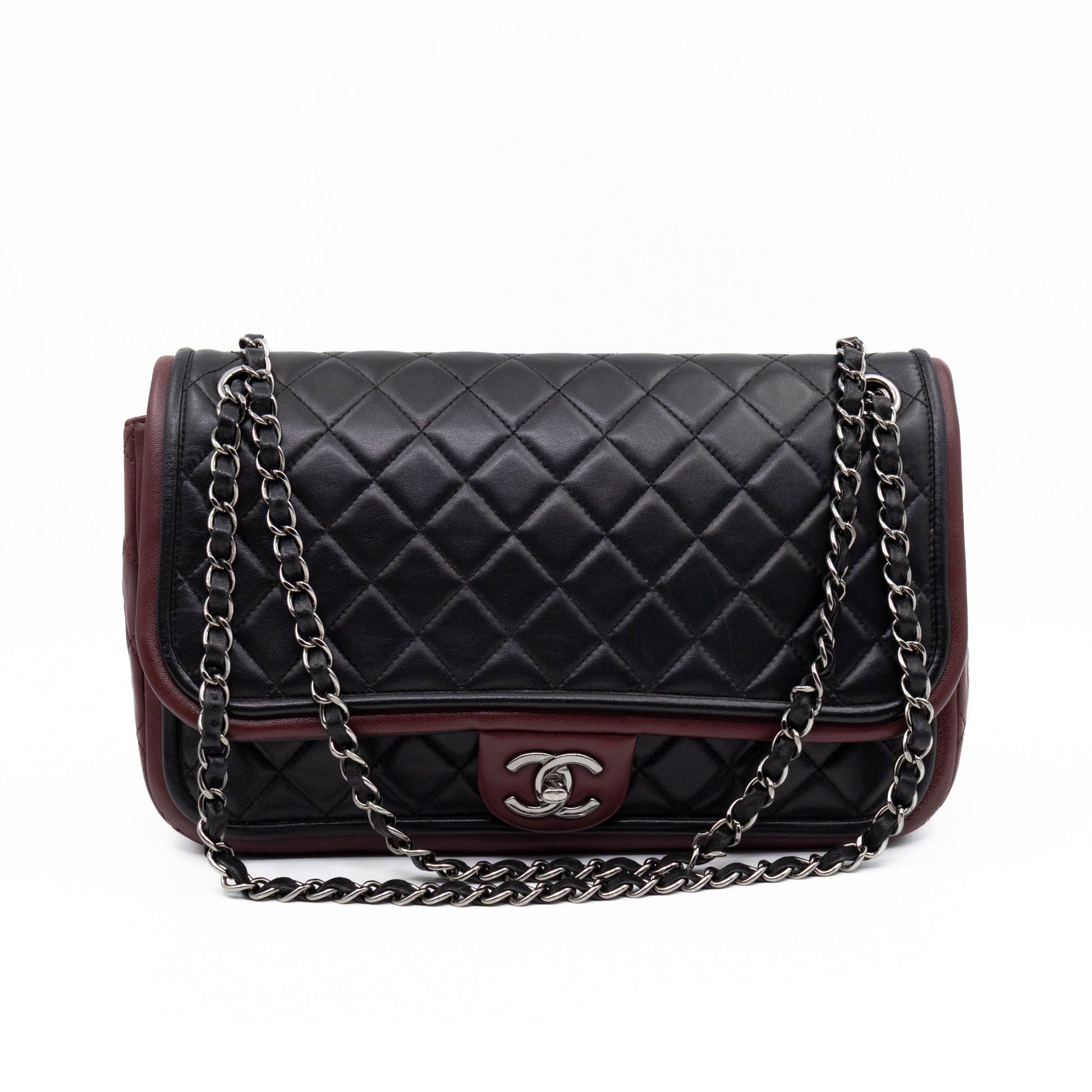 This is a Chanel single flap bag in a large size. Made of black & burgundy leather combined with silver-tone hardware. Inside lining in black leather. On the front a single flap and a CC turn-lock. Can be worn crossbody or single shoulder.