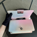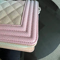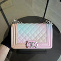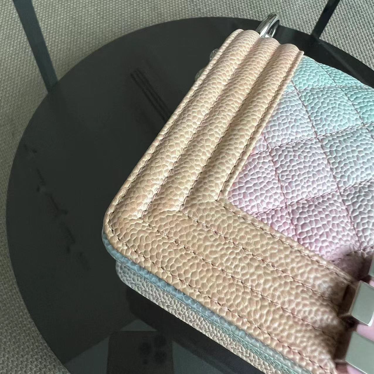 This *Un* Chanel Caviar Boy Rainbow Small Quilted Grained Calfskin is a rare find with its stunning multicolor gradient and elegant silver hardware. Series 25, making it a coveted piece for any collector. Priced at 5800.0 SGD, this exquisite bag is a timeless investment.