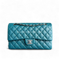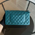 This un Chanel Caviar Medium Classic Flap in stunning green-blue calfskin with silver hardware is a rare find. Chanel has ceased production of this exquisite color in caviar leather, making it a highly coveted piece for collectors.