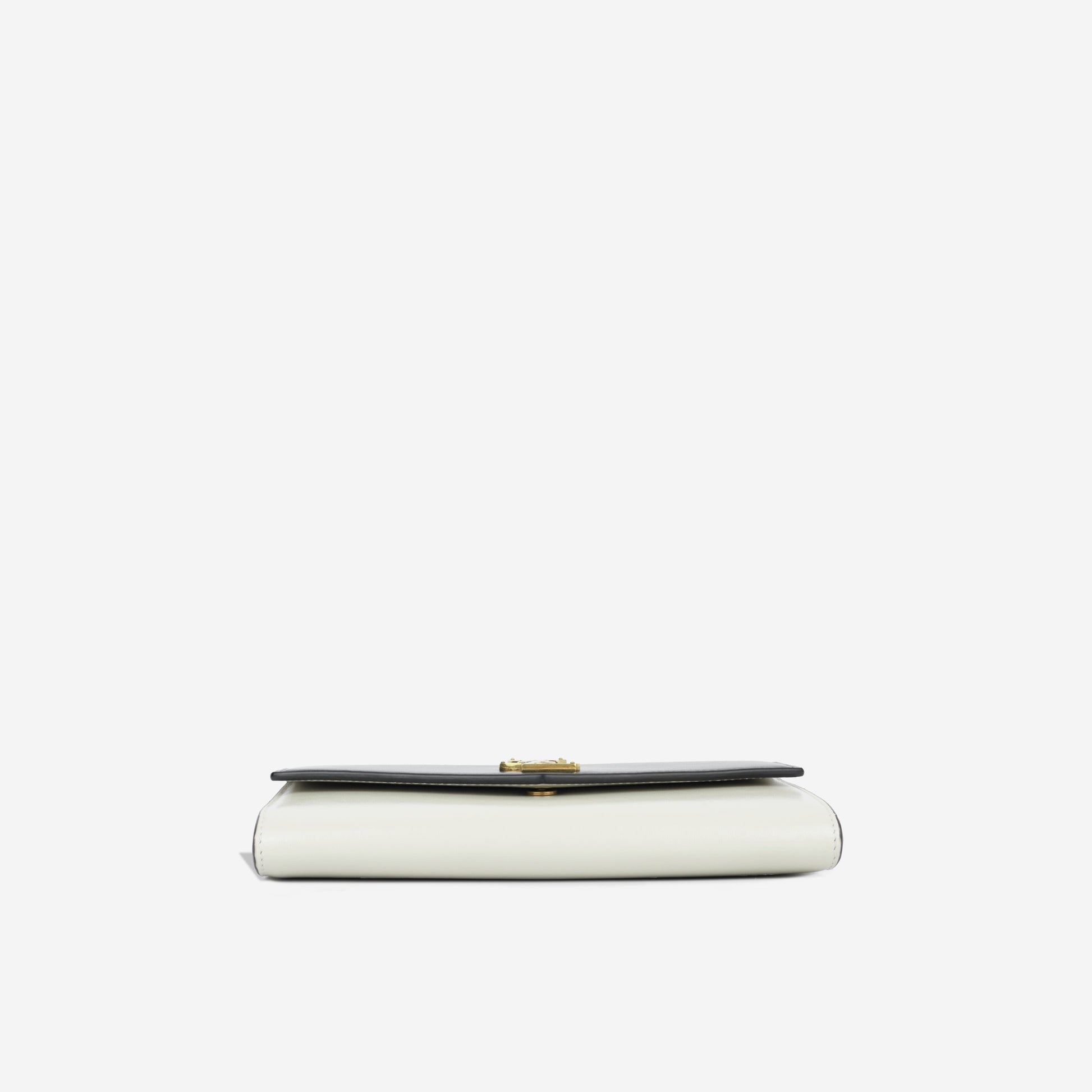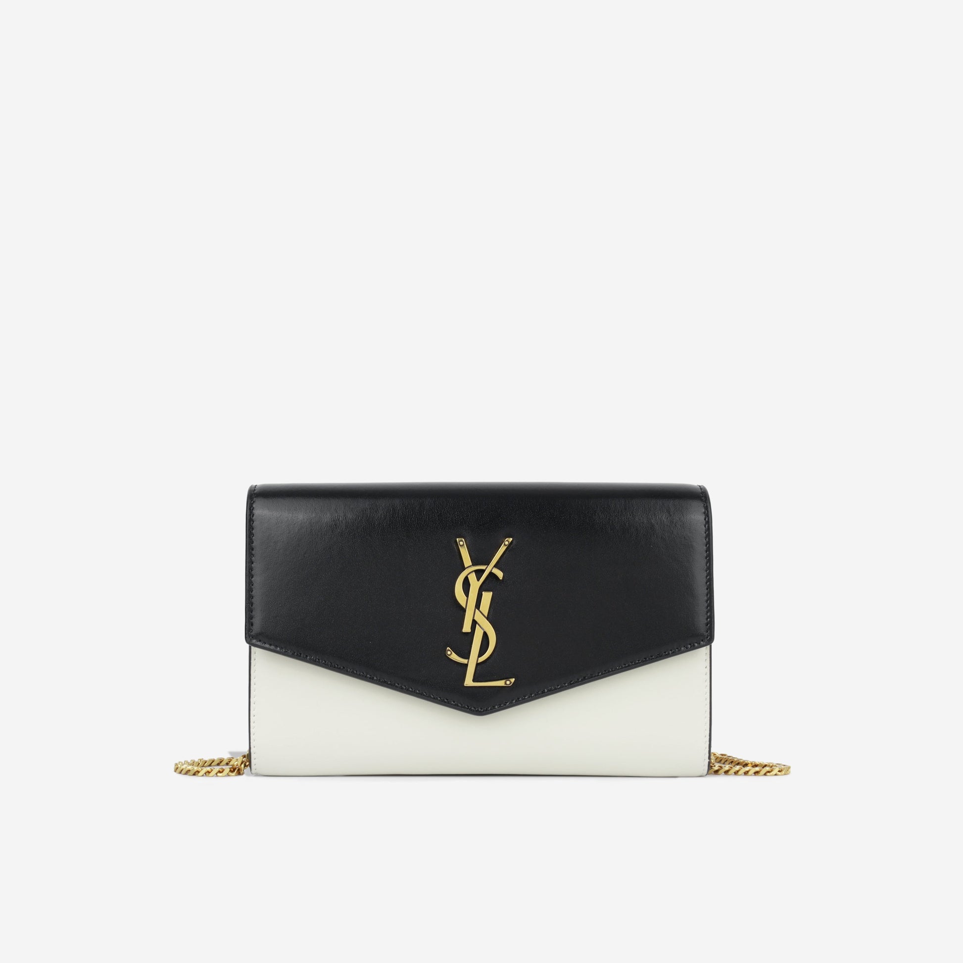 Acclaimed for its understated aesthetic and minimalist silhouette, the Uptown line from Saint Laurent is the ideal accessory for any woman with a chic, simple sense of style and a love for statement luxury. Crafted from black and beige smooth leather and complimenting gold hardware, the Uptown WOC is the perfect mini bag to add a finishing touch to your outfit. Carry it in your hand as a clutch or drape it across your shoulder using the optional chain strap.