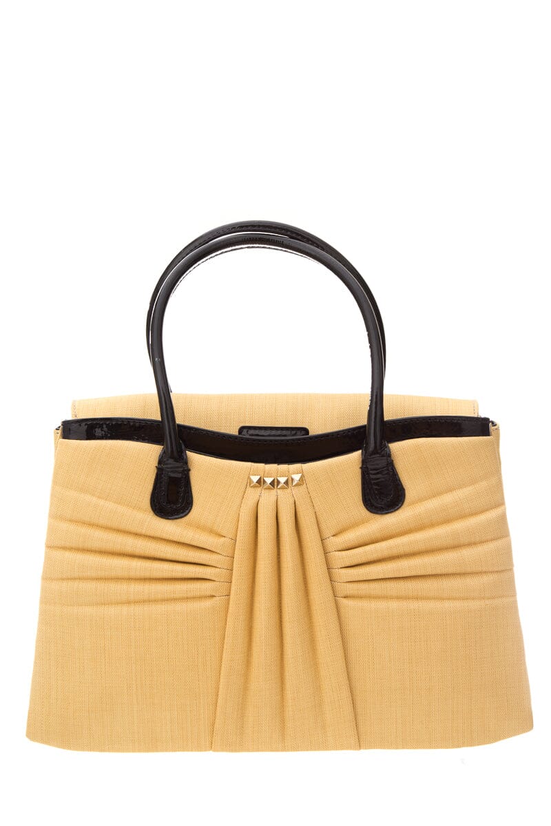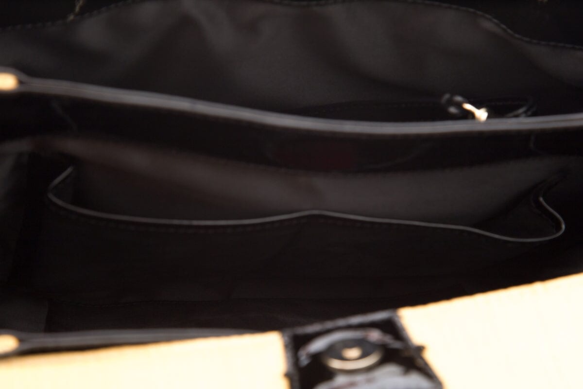 Valentino raffia black patent leather shoulder bag with gold-toned hardware with black pattern leather trim, round handle with satin lining & dual interior pockets, featuring four gold studs in front, with detachable long strap. This item is in good condition.