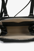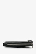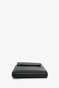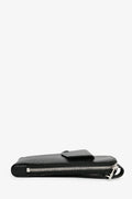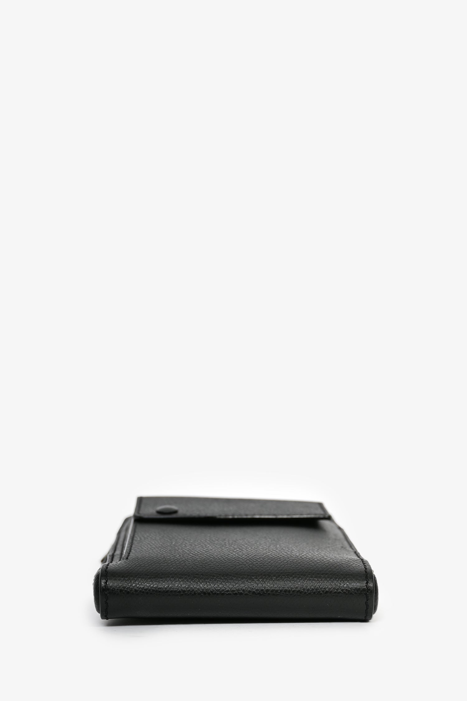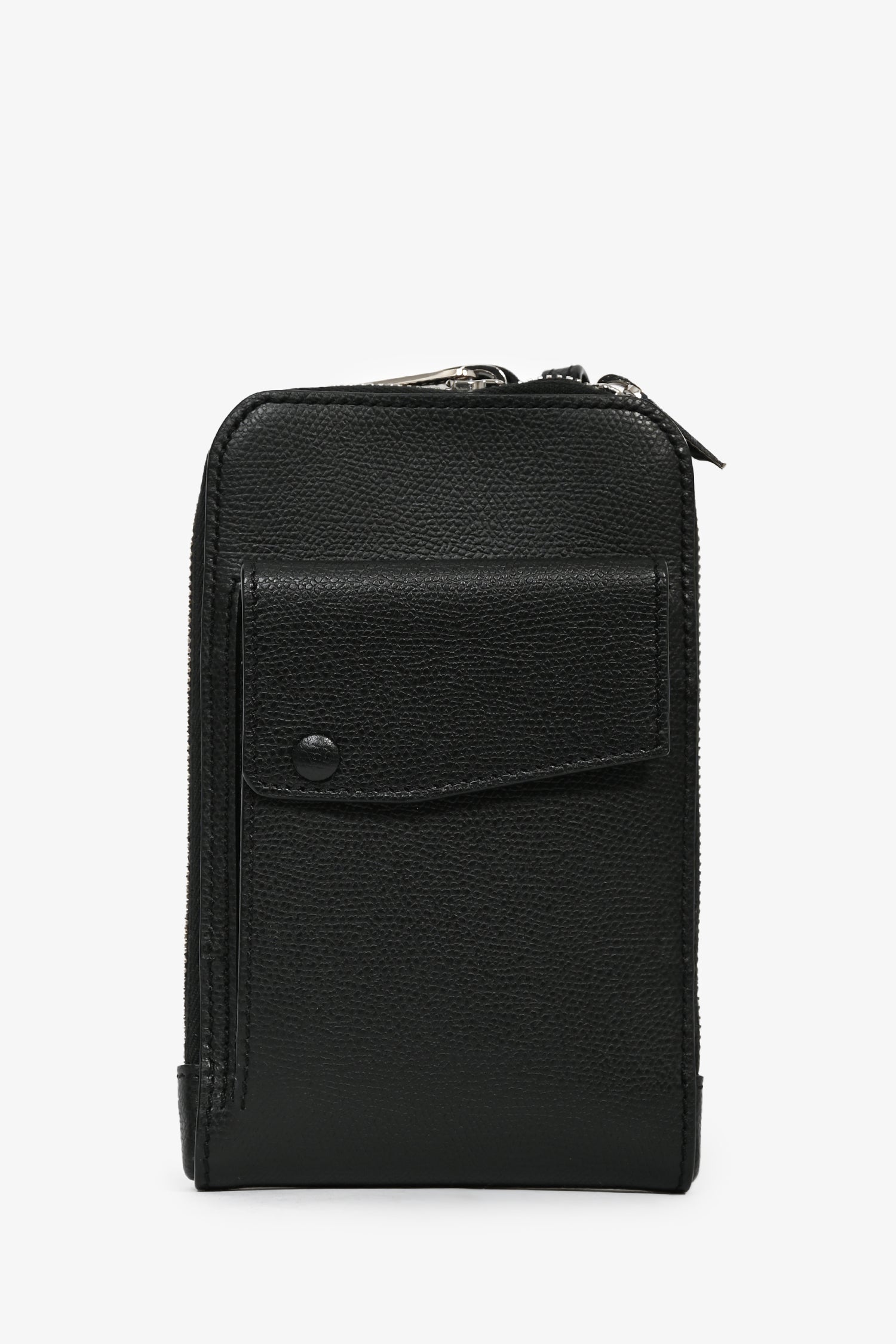 Valextra Black Leather Crossbody Phone Case. Top zipper closure. Front fold-over flap with snap buttons. Open compartment with wall card slot. Adjustable crossbody strap. Silver-tone hardware. Tonal stitching.