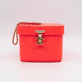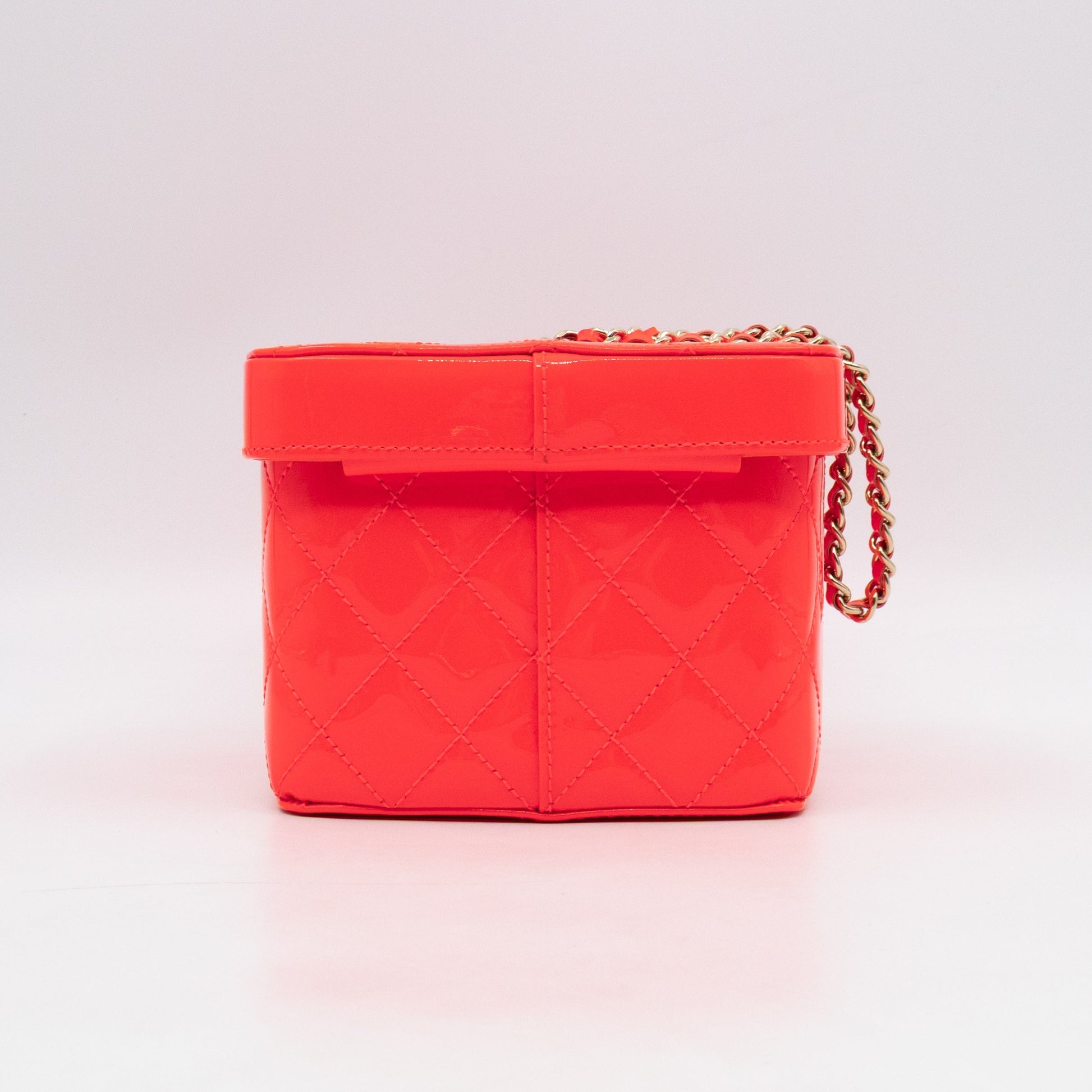This is a Chanel Minaudiere Vanity Case. This chic stylish vanity case is crafted of luxurious diamond quilted patent leather in pink. This bag features a light gold chain link leather threaded hand strap and a Chanel CC flip lock on the front. This opens to matching leather interior with a mirror. Mirror has stained from oxidation.