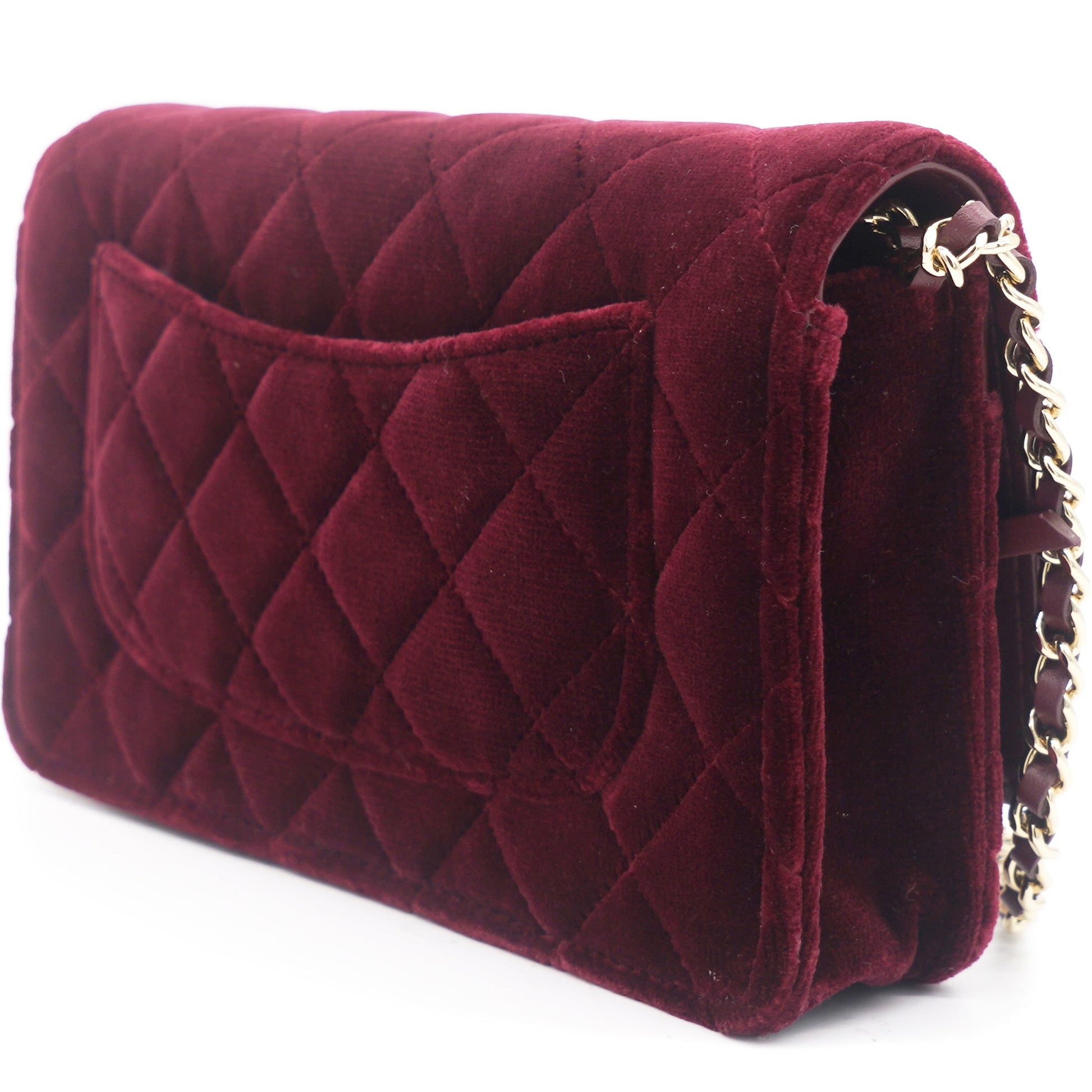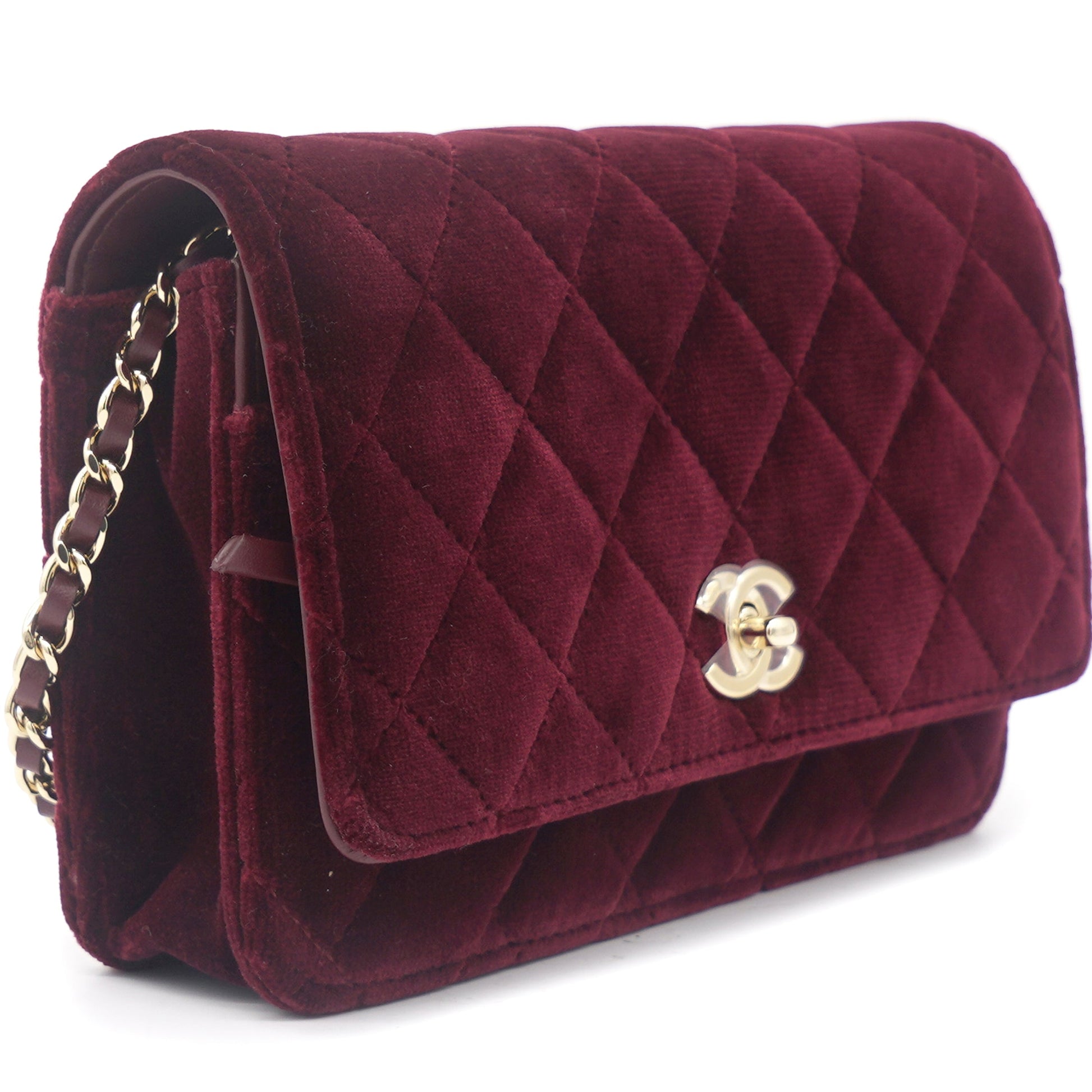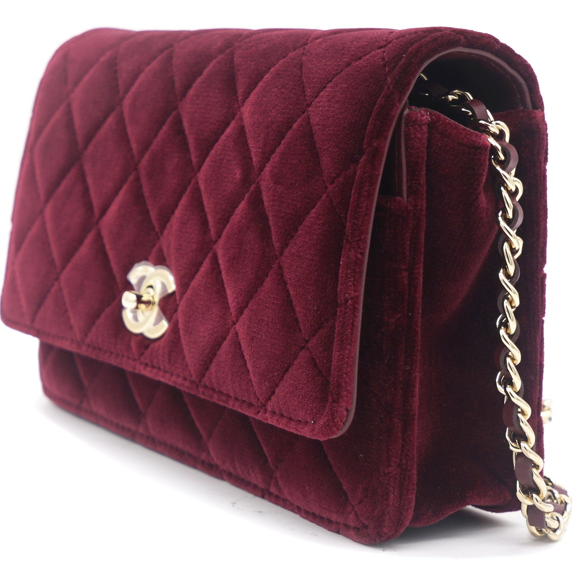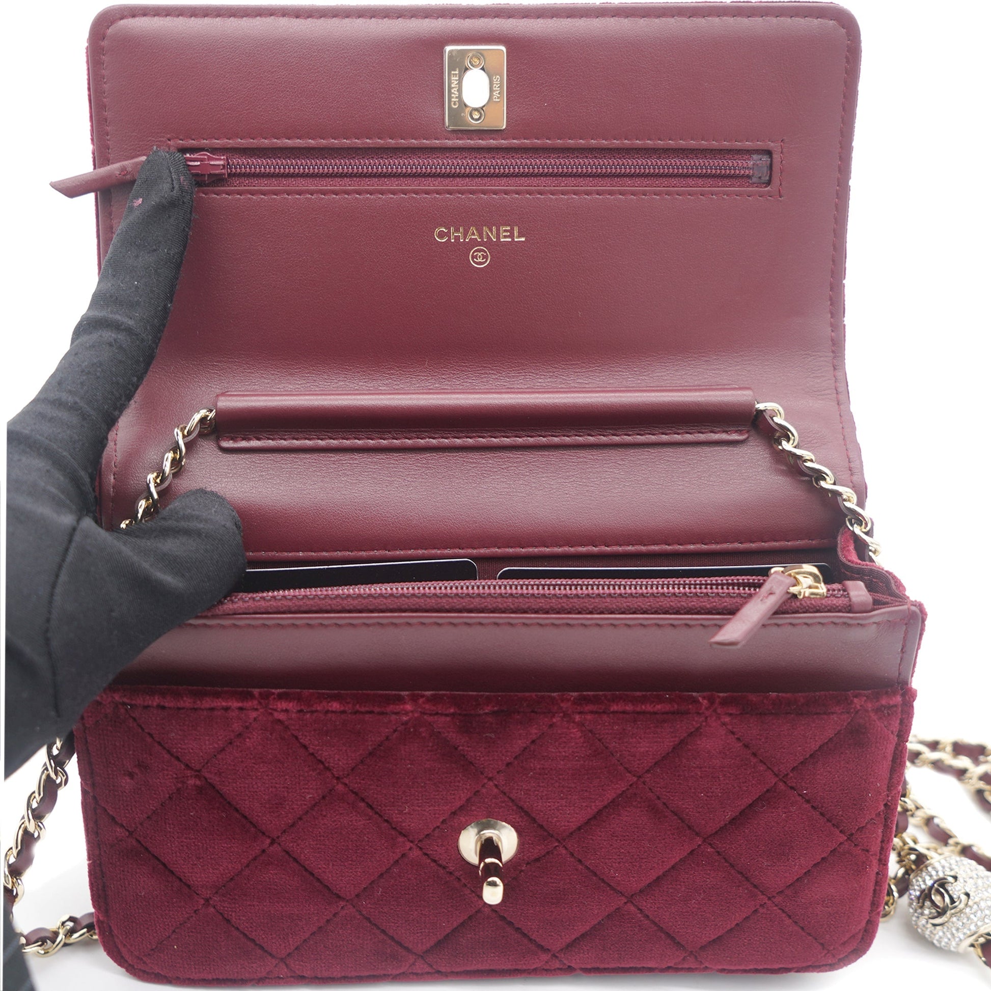 Chanel Velvet Quilted Pearl Crush Wallet On Chain WOC Burgundy