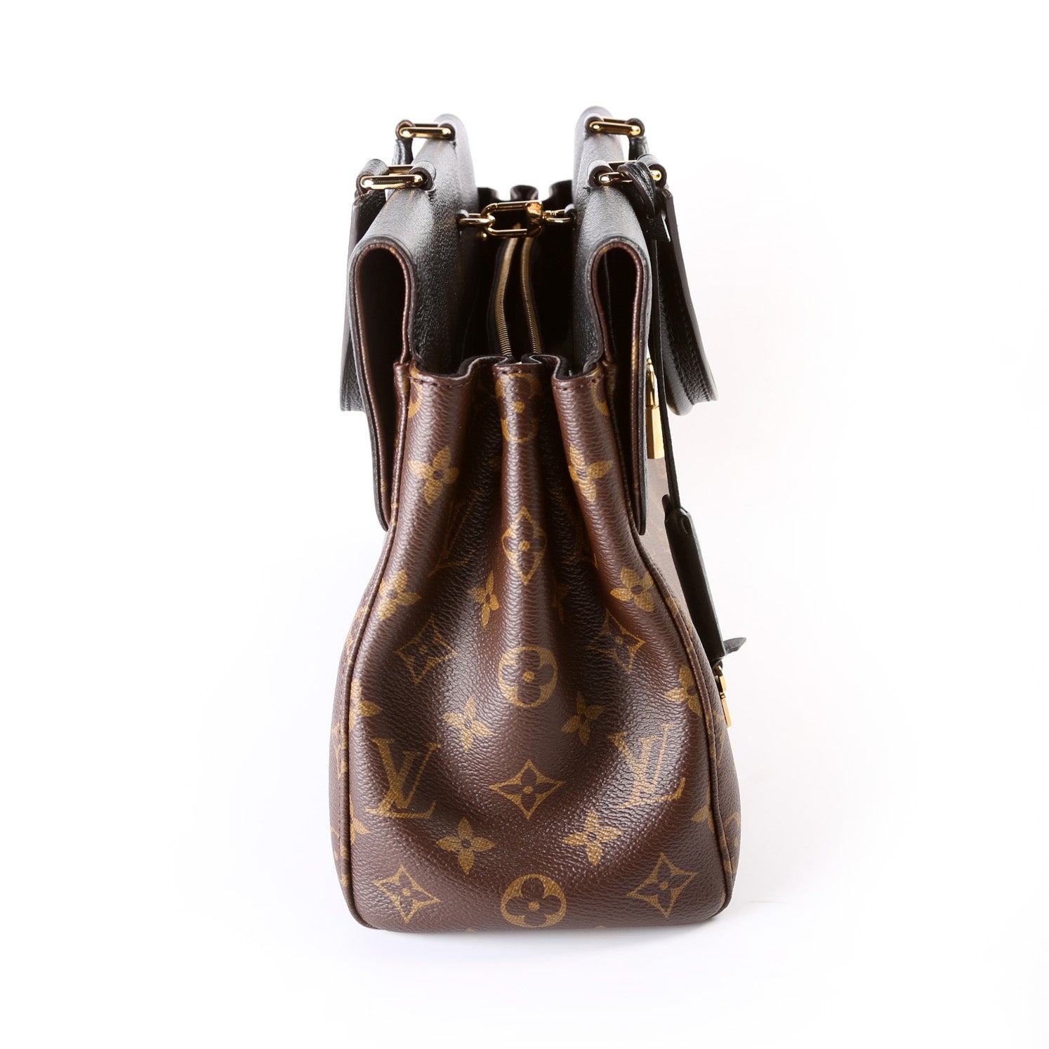 Exterior: The exterior coated canvas is free from any rips or cracks. The exterior features two magnetic closure pockets. The gold feet show light wear.