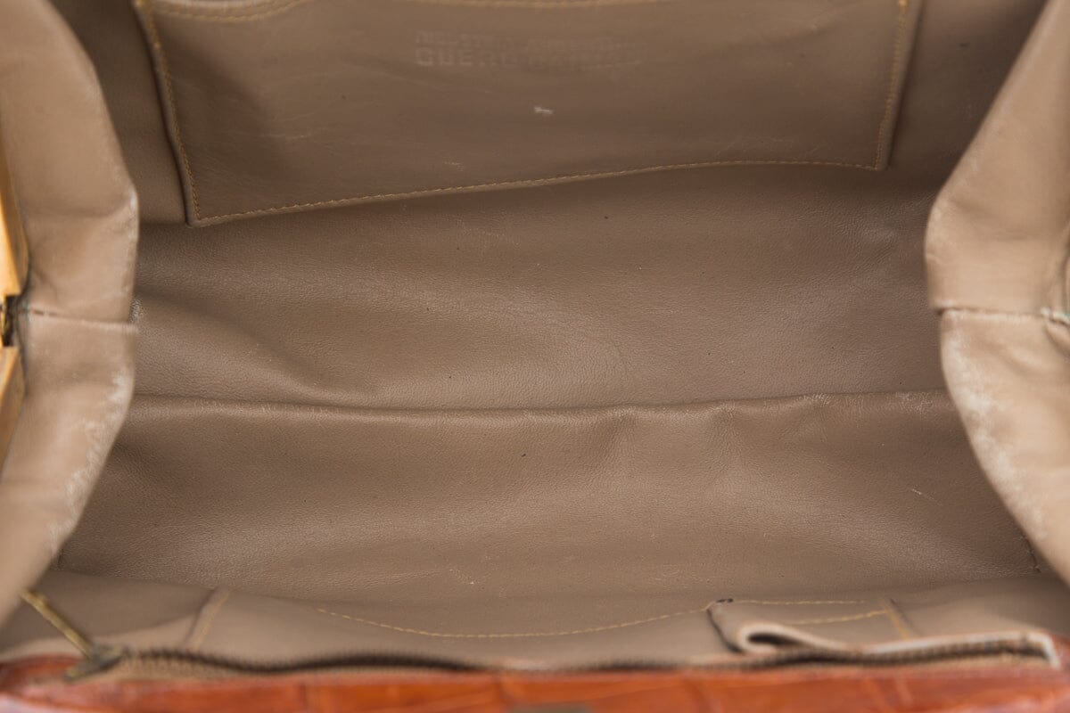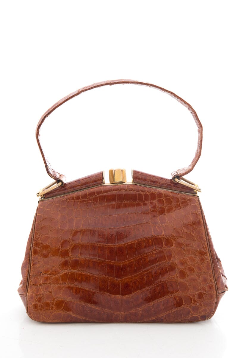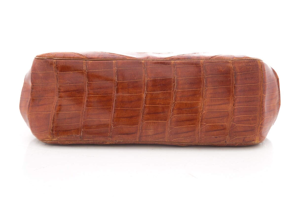 Camel Authentic Croc Handbag. This item is vintage; some wear on piping/corners and hardware as well as some wear and aging on leather lining.