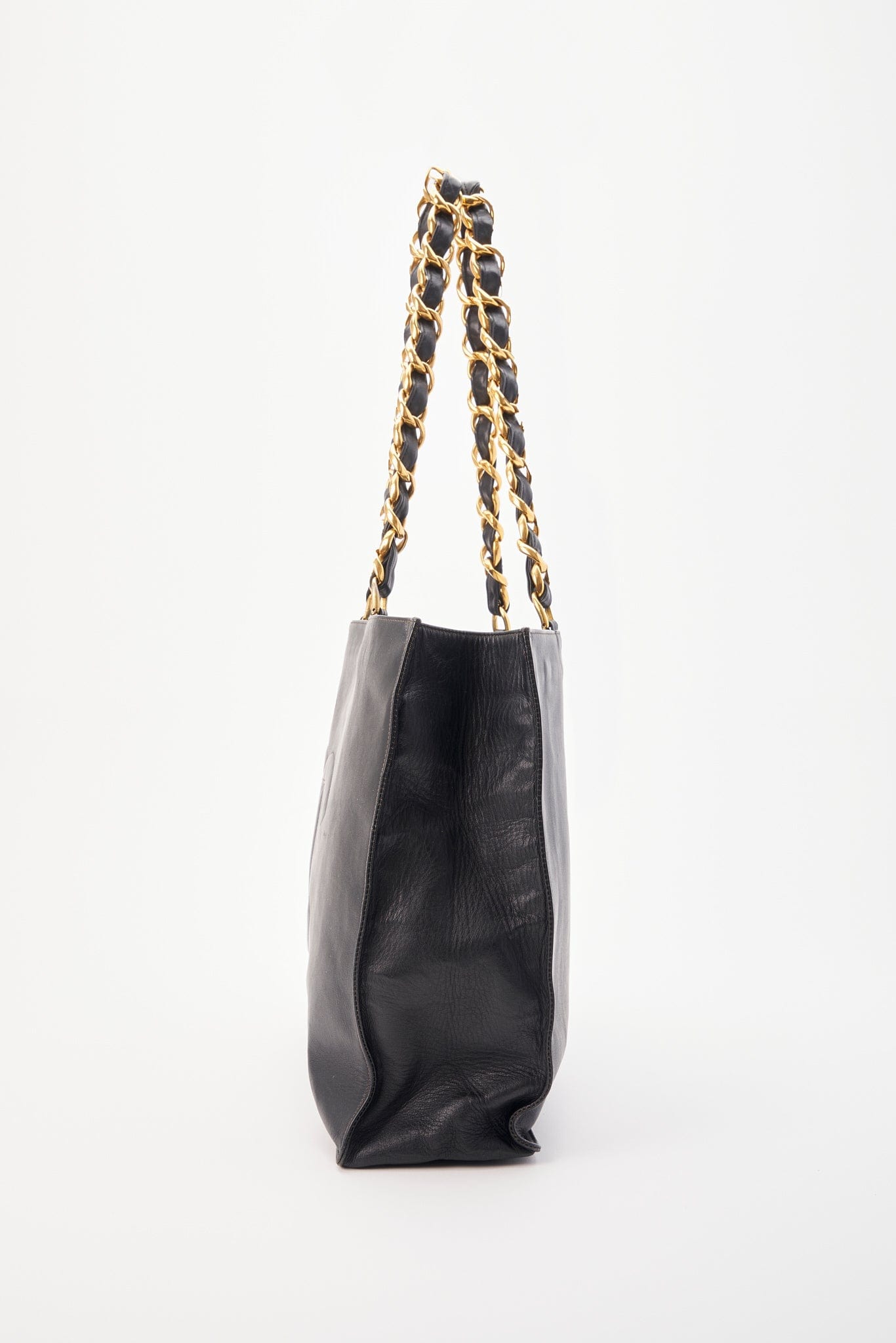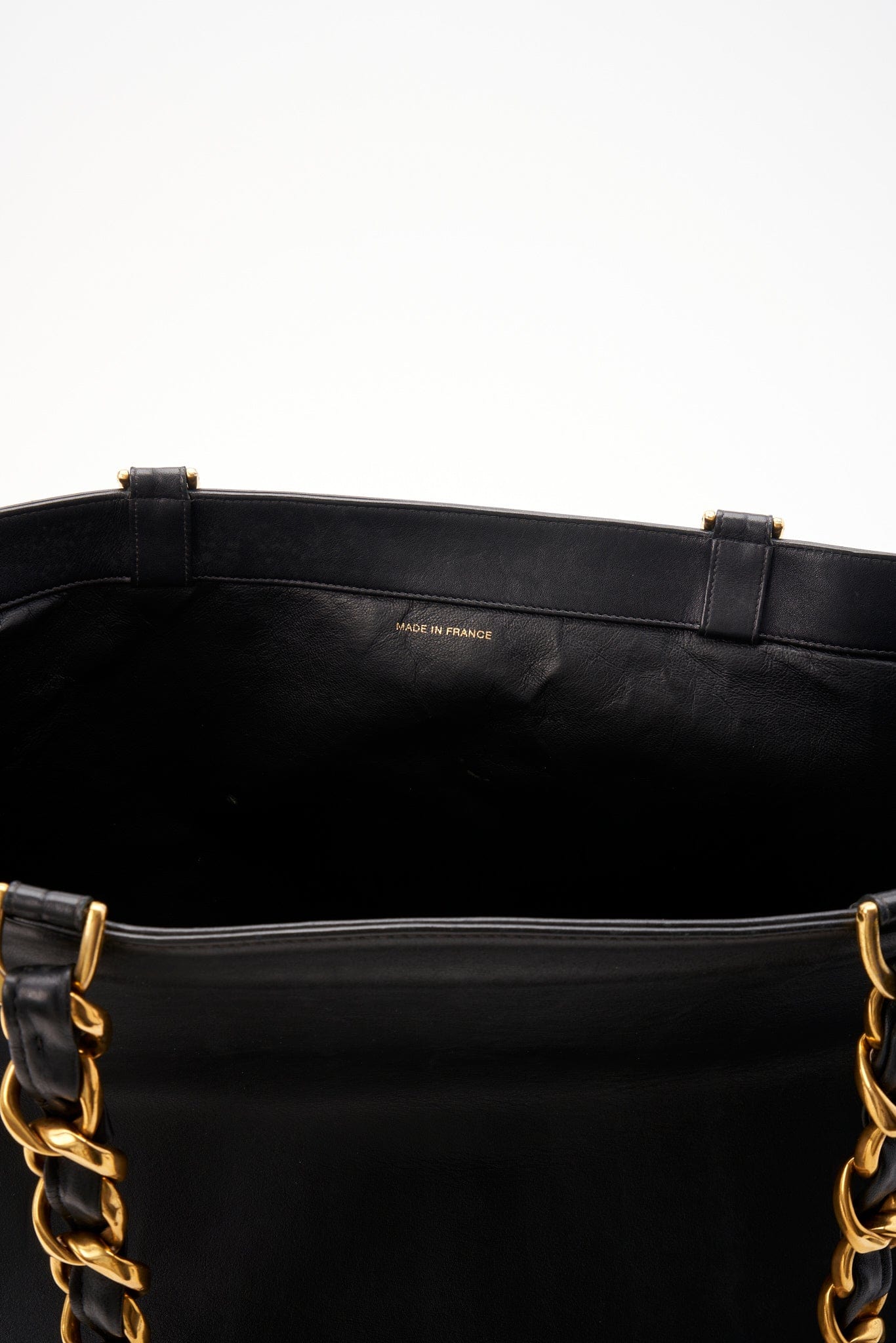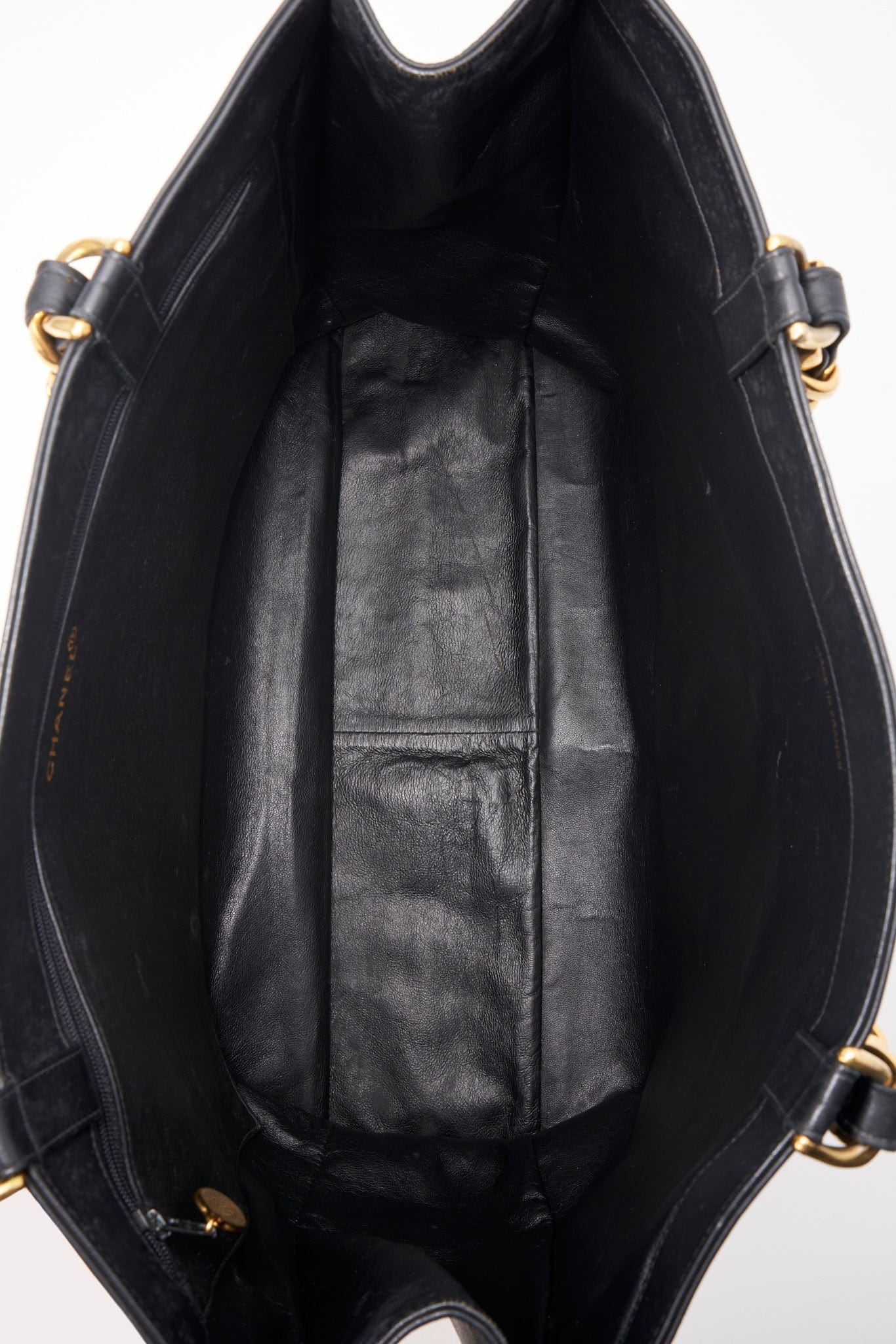 Vintage Chanel Black Leather Tote Bag with Chunky Gold Hardware
