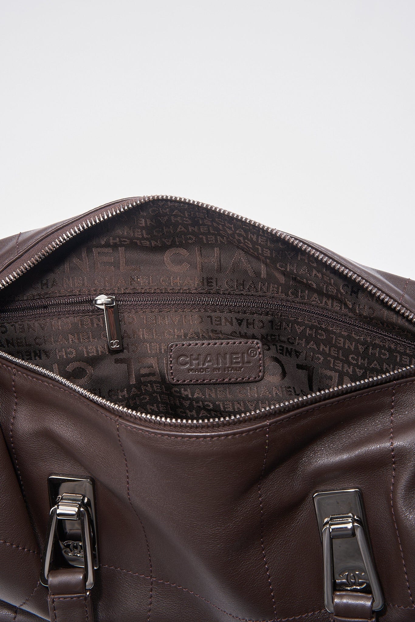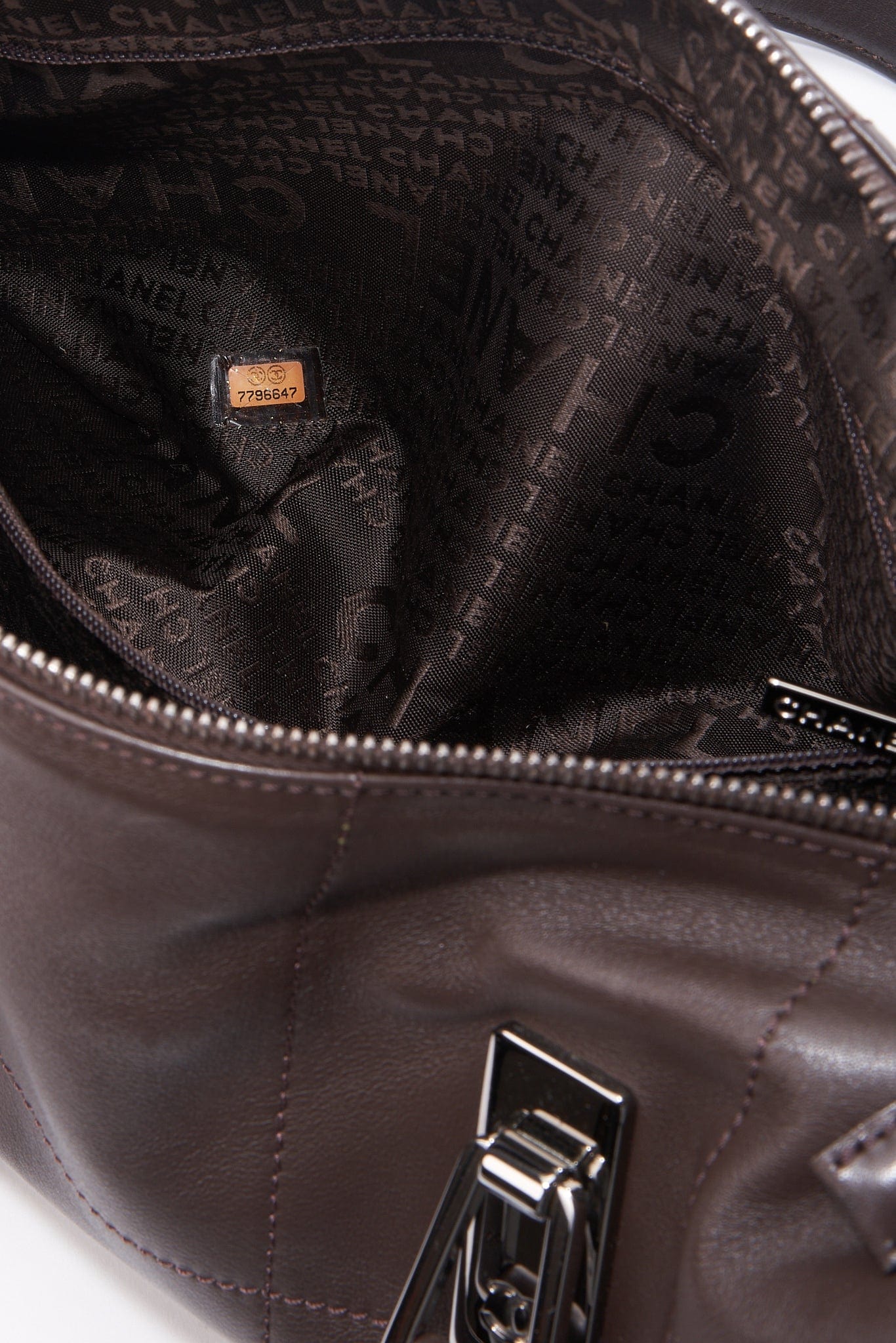 Inside the bag is lined with a brown Chanel logo nylon lining and has a zipped interior pockets for valuables.