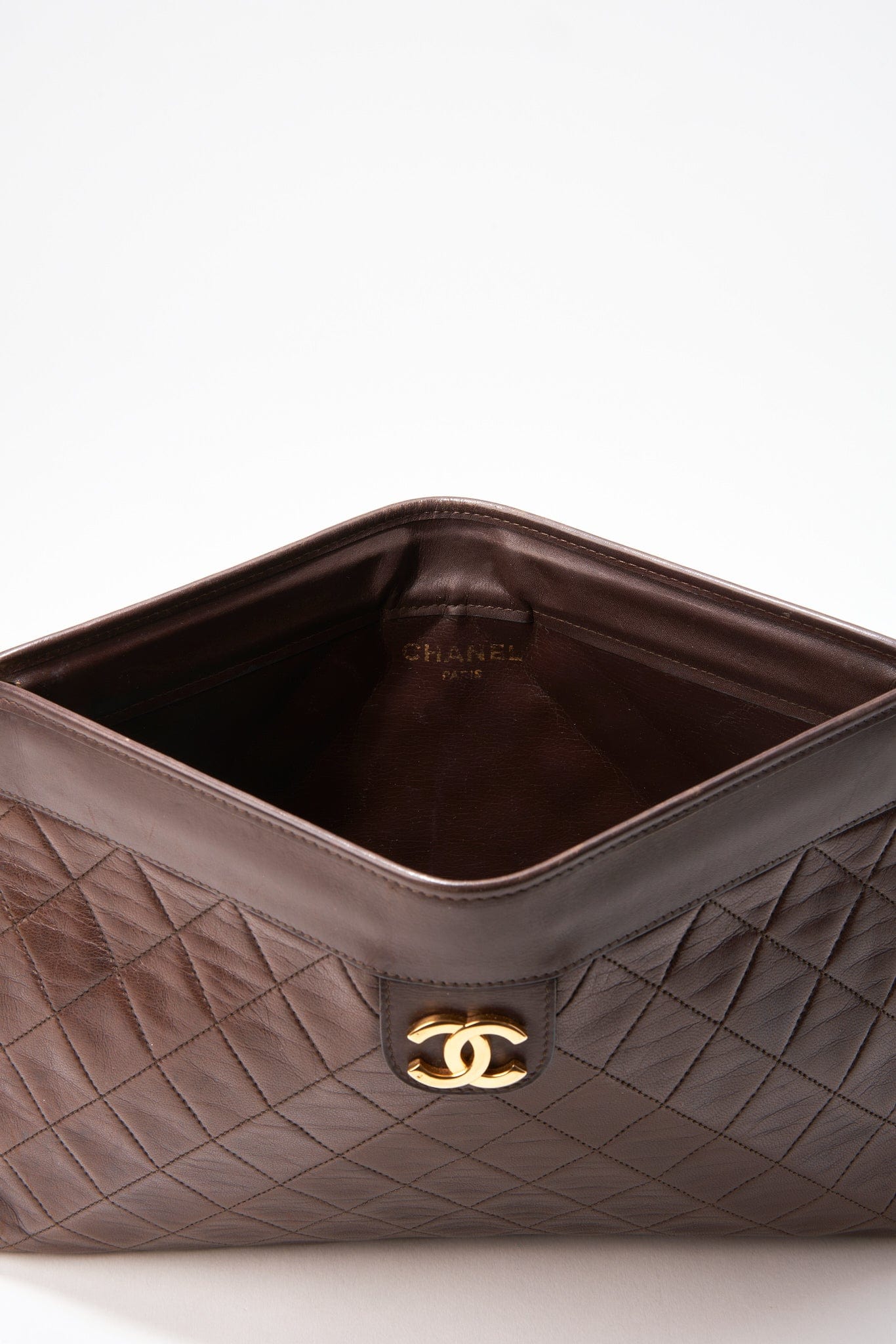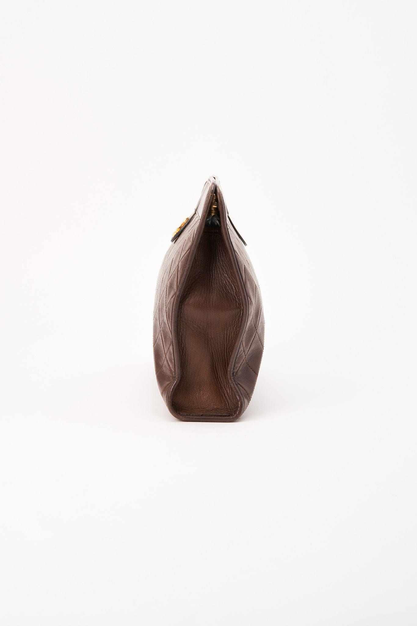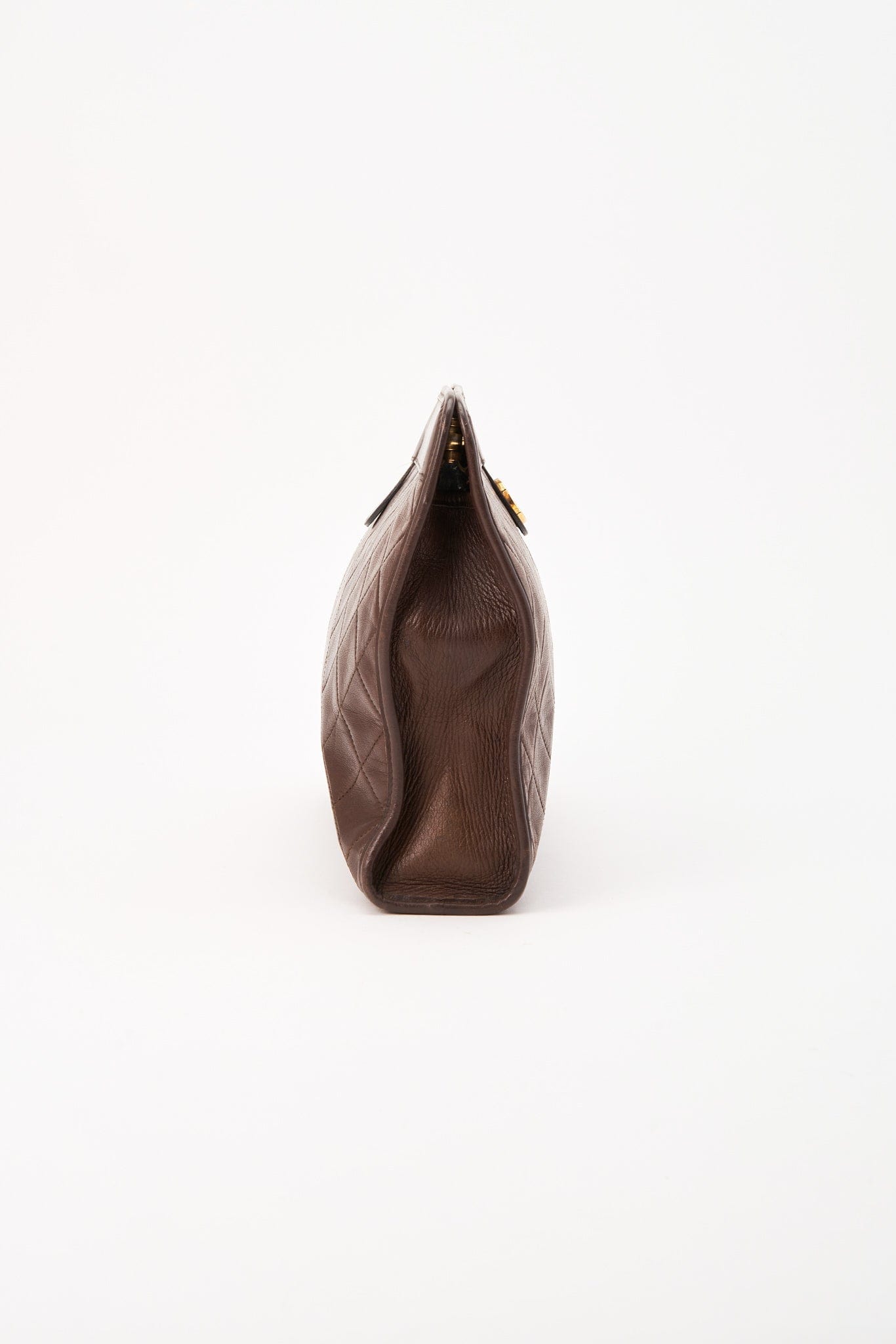 Vintage Chanel Brown Leather Clutch Bag With 24K Gold Plated Hardware